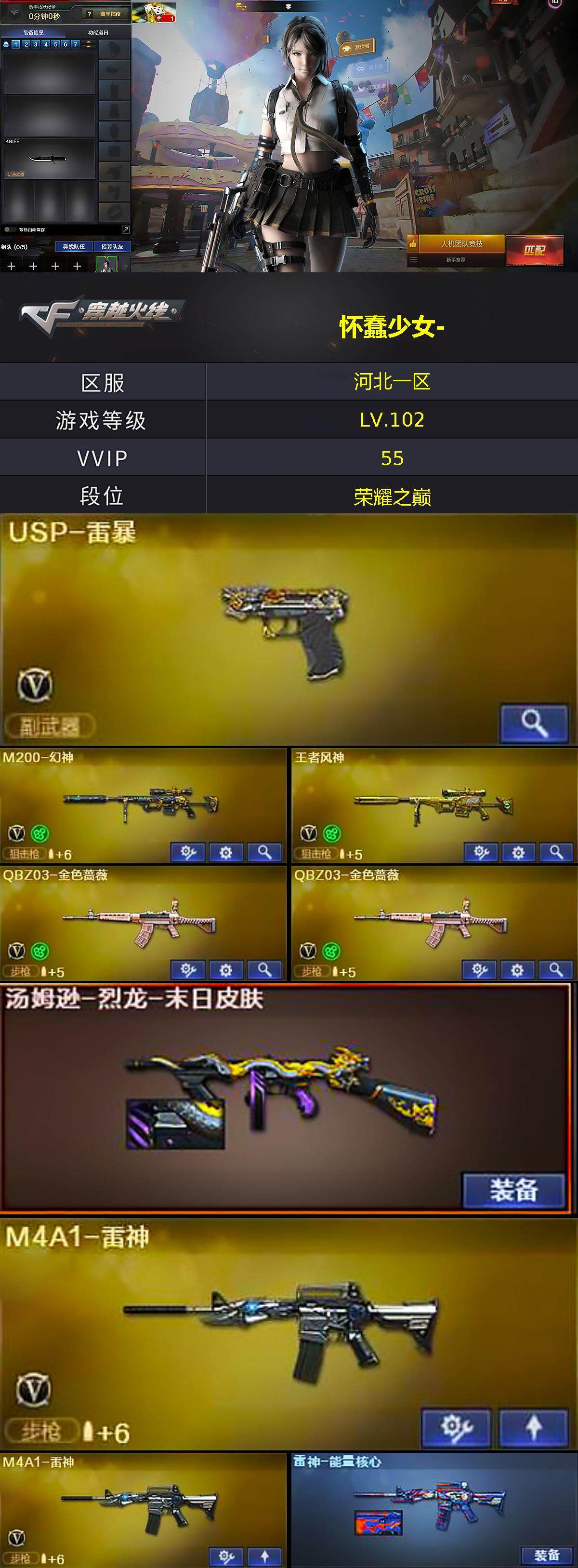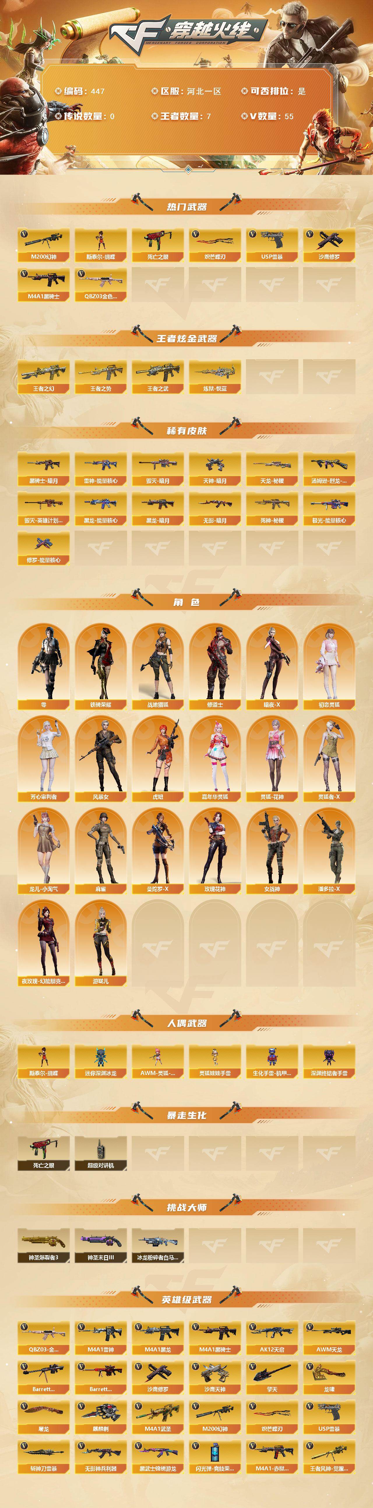 [14665852]河北一区-55V-7王者-0炫金 【热门武器】:QBZ03-金色蔷薇*2,M200-幻神,死亡之眼*2,M4A1-黑骑士,斯泰尔-蝴蝶,USP-雷暴,沙鹰-修罗*4,炽芒蝶刃 【王者炫金武器】:王者之幻,王者之势,王者之武,炼狱-悦蓝 【皮肤】:汤姆逊-烈龙-末日皮肤,雷神-能量核心,毁灭-暗月*3,毁灭-英雄计划 皮肤,黑龙-能量核心,黑龙-暗月,黑骑士-暗月,无影-暗月*2,死神-秘银,天龙-秘银,极光-能量核心,修罗-能量核心*2,天神-暗月 【角色】:零,战地猎狐,修道士,暗夜-X,初恋灵狐,芳心审判者,风暴女,虎妞,嘉年华灵狐,灵狐-花神,灵狐者-X,龙儿-小淘气,麻雀,曼陀罗-X,玫瑰花神,女战神,潘多拉-X,铁骑荣耀,夜玫瑰-幻能朋克,游珑儿 【人偶武器】:斯泰尔-蝴蝶,AWM-灵狐-15周年嘉年华,迷你深渊冰龙*2,生化手雷-机甲核心,深渊终结者手雷,灵狐娃娃手雷 【暴走生化】:死亡之眼*2,超级对讲机 【挑战大师】:神圣爆裂者III*2,冰龙粉碎者-白马银枪,神圣爆裂者-末日III 【英雄级武器】:M4A1-黑龙,M4A1-雷神*2,M4A1-黑骑士,AK12-天启,M4A1-武圣,无影-神兵利器,黑武士-锦绣游龙,QBZ03-金色蔷薇*2,AWM-天龙,Barrett-毁灭,Barrett-极光,M200-幻神,王者风神-觉醒版,沙鹰-修罗*4,沙鹰-天神,USP-雷暴,屠龙*2,龙啸,擎天,麒麟刺,炽芒蝶刃,斩神刀-雷暴,王者之锋-觉醒版,高爆手雷-雷暴*4,高爆手雷-幻灵,高爆手雷-云龙,闪光弹-雷暴*5,闪光弹-幻灵,闪光弹-竞技荣光*2,闪光弹-云龙*2,烟雾弹-雷暴*5,烟雾弹-幻灵,烟雾弹-云龙,烟雾弹-雷霆王者-觉醒版,M4A1-赤狱骑士 【道具】:BS战队炫彩背包,云海游龙炫彩背包,全能枪王背包*2,战舰背包,炫彩背包,超级背包,救世主-黑桃战神,绿色巨人,灵魂忍者*4,变异宝贝,妖姬,迷雾幽灵*2,生化弹匣,夺命之镰,防化服*3,金色流光-枪王排位*2,星辰流光-枪王排位,巅峰赛先锋-金色流光,枪王排位28赛季金色流光,枪王排位29赛季金色流光,EP战队名片,防弹头盔*5,防弹衣*5,C4工具钳*4,手雷包*4 【特殊枪械】:蝴蝶斯泰尔+0烈龙,1黑骑士,1蝴蝶斯泰尔
