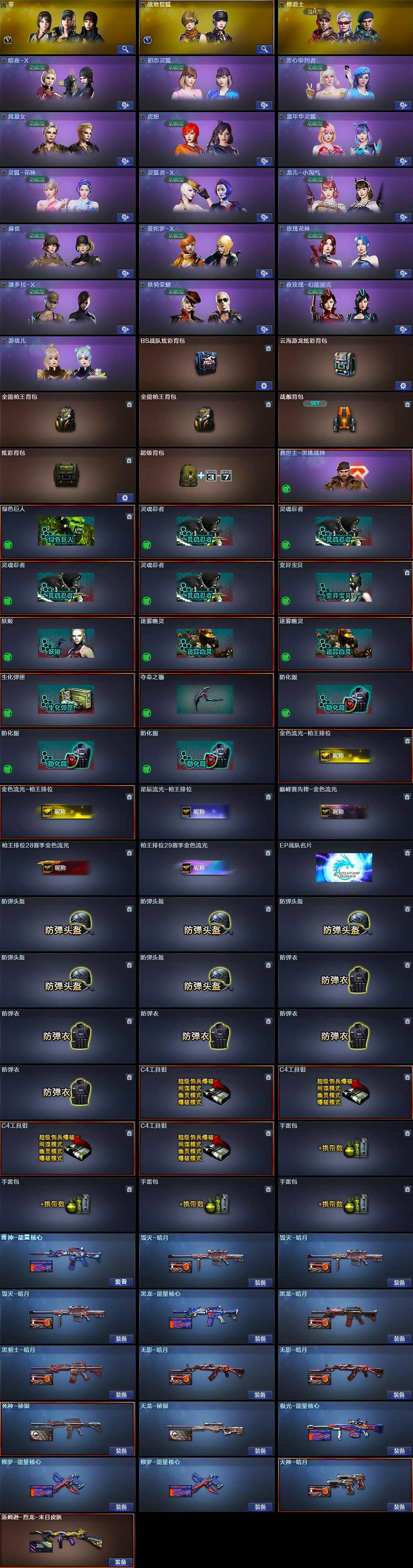 【道具】:BS战队炫彩背包,云海游龙炫彩背包,全能枪王背包*2,战舰背包,炫彩背包,超级背包,救世主-黑桃战神,绿色巨人,灵魂忍者*4,变异宝贝,妖姬,迷雾幽灵*2,生化弹匣,夺命之镰,防化服*3,金色流光-枪王排位*2,星辰流光-枪王排位,巅峰赛先锋-金色流光,枪王排位28赛季金色流光,枪王排位29赛季金色流光,EP战队名片,防弹头盔*5,防弹衣*5,C4工具钳*4,手雷包*4