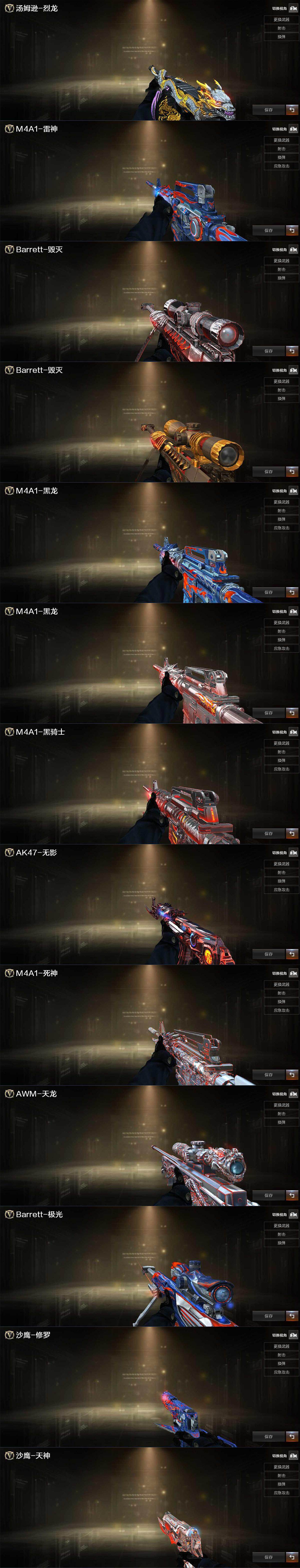 【热门武器】:QBZ03-金色蔷薇*2,M200-幻神,死亡之眼*2,M4A1-黑骑士,斯泰尔-蝴蝶,USP-雷暴,沙鹰-修罗*4,炽芒蝶刃