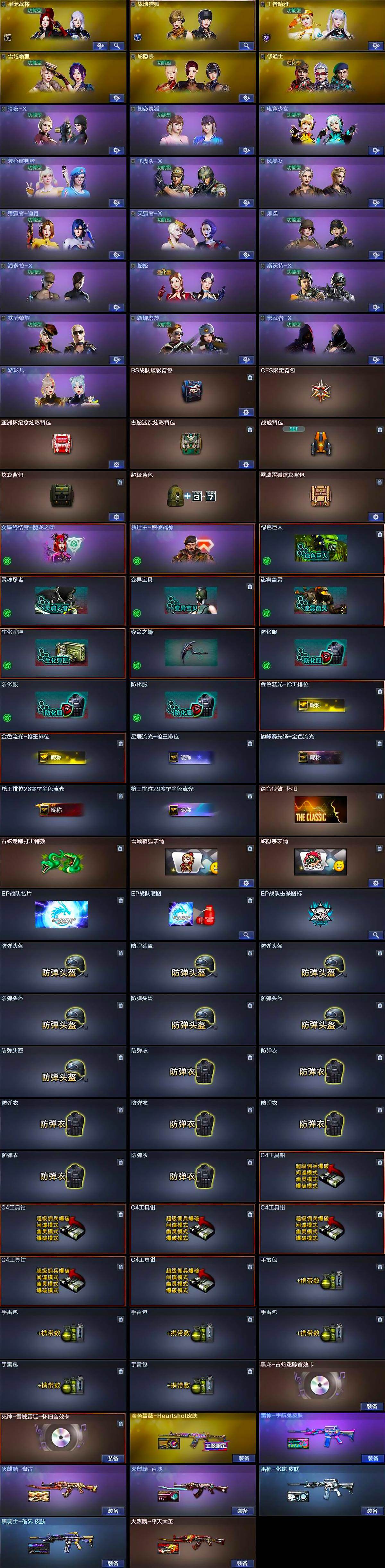 【道具】:BS战队炫彩背包,CFS限定背包,亚洲杯纪念炫彩背包,古蛇迷踪炫彩背包,战舰背包,炫彩背包,超级背包,雪域霜狐炫彩背包,女皇终结者-魔龙之吻,救世主-黑桃战神,绿色巨人,灵魂忍者,变异宝贝,迷雾幽灵,生化弹匣,夺命之镰,防化服*3,金色流光-枪王排位*2,星辰流光-枪王排位,巅峰赛先锋-金色流光,枪王排位28赛季金色流光,枪王排位29赛季金色流光,语音特效-怀旧,古蛇迷踪打击特效,雪域霜狐表情,蛇隐宗表情,EP战队名片,EP战队喷图,EP战队击杀图标,防弹头盔*7,防弹衣*7,C4工具钳*6,手雷包*6