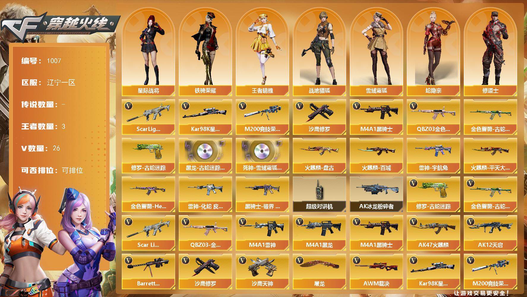 [14666143]辽宁一区-26V-3王者-0炫金 【热门武器】:QBZ03-金色蔷薇,Scar Light-白虎,金色蔷薇-古蛇迷踪,修罗-古蛇迷踪,M200-竞技荣光,Kar98K-星神,M4A1-黑骑士,沙鹰-修罗 【音效卡】:黑龙-古蛇迷踪音效卡,死神-雪域霜狐-怀旧音效卡 【皮肤】:金色蔷薇-Heartshot皮肤,雷神-宇航兔皮肤,雷神-化蛇 皮肤,火麒麟-平天大圣,火麒麟-盘古,火麒麟-百城,黑骑士-破界 皮肤 【角色】:星际战将,战地猎狐,王者晴雅,雪域霜狐,蛇隐宗,修道士,暗夜-X,初恋灵狐,电竞少女,芳心审判者,飞虎队-X,风暴女,兰-新年限定,猎狐者-追月,0号玩家,灵狐者-X,麻雀,潘多拉-X,蛇姬,斯沃特-X,铁骑荣耀,兔囡囡,新娜塔莎,影武者-X,游珑儿 【暴走生化】:超级对讲机 【挑战大师】:AK47-冰龙粉碎者 【英雄级武器】:AK47-火麒麟,M4A1-黑龙,M4A1-雷神,M4A1-黑骑士,AK12-天启,Scar Light-白虎,黑武士-锦绣游龙,金色蔷薇-古蛇迷踪,死神-雪域霜狐,QBZ03-金色蔷薇,AK-47-猩红传说,Barrett-毁灭,AWM-裁决,Kar98K-星神,M200-竞技荣光,王者幻神-觉醒版,沙鹰-修罗,沙鹰-天神,修罗-古蛇迷踪,屠龙,擎天-竞技荣光,高爆手雷-雷霆,高爆手雷-古蛇迷踪,闪光弹-雷霆,闪光弹-竞技荣光,烟雾弹-竞技荣光*2,烟雾弹-古蛇迷踪,M4A1-赤狱骑士,AWM-昌龙 【道具】:BS战队炫彩背包,CFS限定背包,亚洲杯纪念炫彩背包,古蛇迷踪炫彩背包,战舰背包,炫彩背包,超级背包,雪域霜狐炫彩背包,女皇终结者-魔龙之吻,救世主-黑桃战神,绿色巨人,灵魂忍者,变异宝贝,迷雾幽灵,生化弹匣,夺命之镰,防化服*3,金色流光-枪王排位*2,星辰流光-枪王排位,巅峰赛先锋-金色流光,枪王排位28赛季金色流光,枪王排位29赛季金色流光,语音特效-怀旧,古蛇迷踪打击特效,雪域霜狐表情,蛇隐宗表情,EP战队名片,EP战队喷图,EP战队击杀图标,防弹头盔*7,防弹衣*7,C4工具钳*6,手雷包*6 【特殊枪械】:1白虎,1黑骑士