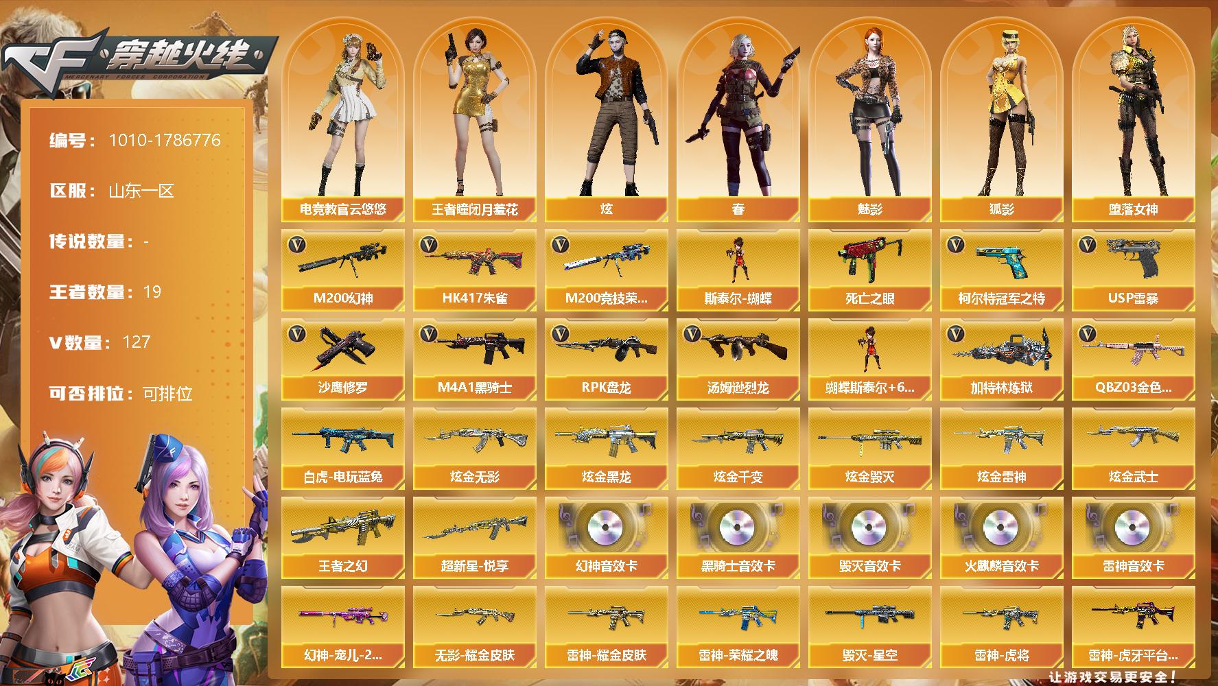 [14666474]123V/102级/荣耀元首/19王者/8炫金/4英雄/QBZ03-金色蔷薇/HK417-朱雀/M200-幻神/M200-竞技荣光/死亡之眼/白虎-电玩蓝兔/柯尔特-冠军之特/M4A1-黑骑士/汤姆逊-烈龙/RPK-盘龙/加特林-炼狱/斯泰尔蝴蝶/USP雷暴/沙鹰-修罗/蝴蝶斯泰尔+6烈龙/超新星-悦享/王者之幻/炫金无影/炫金黑龙/炫金千变/炫金雷神/炫金黑武士/炫金毁灭/M200-幻神音效卡/AK47-火麒麟音效卡/M4A1-雷神音效卡/M4A1-黑骑士音效卡/Barrett-毁灭音效卡/幻神-宠儿/M200-幻神-N9-2022MVP/QBZ03-AG-CFPLS19冠军/雷神-暗月/雷神-能量核心/雷神荣耀之魄/雷神-虎将/雷神-耀金皮肤/雷神-虎牙平台皮肤/雷神-神秘按键 皮肤/火麒麟-冠军之心/火麒麟-心动糖果/毁灭-星空/M4A1-千变-孔明皮肤/黑龙-能量核心/无影耀金皮肤/战神-粉色甜心皮肤/战神-紫绶金章皮肤/战神-流金岁月皮肤/天龙-秘银/极光-能量核心/修罗-能量核心/擎天-秘银/魅影/炫/春/电竞教官-云悠悠/王者-瞳-闭月羞花/堕落女神/狐影/乔伊教练/暗夜-X/芳心审判者/飞虎队-X/风暴女/嘉年华灵狐/灵狐者-X/灵狐者-黄金海岸/龙儿-小淘气/麻雀/曼陀罗-X/潘多拉-X/潜龙队-X/青霞仙子/蛇姬/斯沃特-X/蜀雪/铁骑荣耀/兔囡囡/影武者-X/游珑儿/M4A1-雷神-精英刀锋/巴雷特-零-水下丽影/AWM-灵狐-15周年嘉年华/M37-葵/COP-旗袍/迷你深渊冰龙/迷你波特博士/迷你生化手雷/深渊终结者手雷/闪光弹-小乔/迷你超能女侍/黑龙吞噬者/超级对讲机/6烈龙/5盘龙/神圣爆裂者/AK47-冰龙粉碎者/冰龙粉碎者-白马银枪/激光毁灭者III-白马银枪/激光毁灭者/神圣爆裂者-末日/AK47-火麒麟/M4A1-黑龙/M4A1-雷神/AK47-无影/AK47-黑武士/AK12-天启/AN94-超新星/AK47-黑鲨/M4A1-龙血/M4A1-雷霆/AK47-雷暴/无影-神兵利器/烈火-动感闪耀/王者之心-觉醒版/王者之翼-觉醒版/王者之魄-觉醒版/王者之势-觉醒版/王者之幻-觉醒版/超新星-悦享-觉醒版/AK-47-猩红传说/AK47-B-战神/AWM-天龙/Barrett-毁灭/AWM-裁决/王者之怒-觉醒版/炼狱-悦蓝