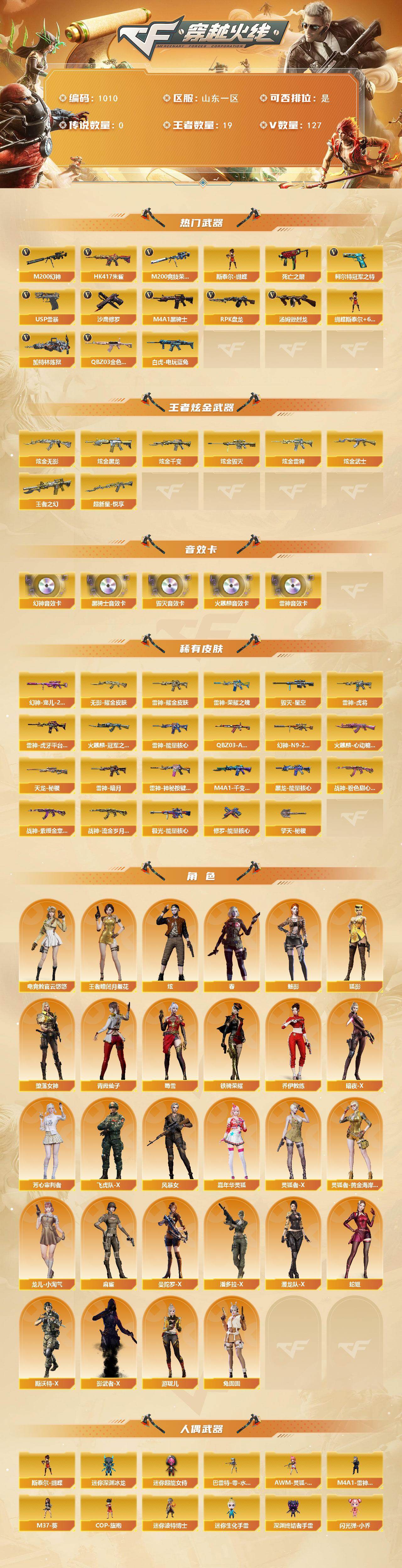[14666473]山东一区-127V-19王者-8炫金 【热门武器】:QBZ03-金色蔷薇,HK417-朱雀,M200-幻神,M200-竞技荣光,死亡之眼,白虎-电玩蓝兔,柯尔特-冠军之特,M4A1-黑骑士,汤姆逊-烈龙*8,RPK-盘龙*5,加特林-炼狱*3,斯泰尔-蝴蝶,USP-雷暴*2,沙鹰-修罗*5 【王者炫金武器】:超新星-悦享,王者之幻,炫金无影,炫金黑龙*2,炫金千变,炫金雷神,炫金武士,炫金毁灭*2 【音效卡】:M200-幻神音效卡,AK47-火麒麟音效卡,M4A1-雷神音效卡,M4A1-黑骑士音效卡,Barrett-毁灭音效卡 【皮肤】:幻神-宠儿-2021MVP,M200-幻神-N9-2022MVP,QBZ03-AG-CFPLS19冠军,雷神-暗月,雷神-能量核心,雷神-荣耀之魄,雷神-虎将,雷神-耀金皮肤,雷神-虎牙平台皮肤,雷神-神秘按键 皮肤,火麒麟-冠军之心,火麒麟-心动糖果,毁灭-星空,M4A1-千变-孔明皮肤,黑龙-能量核心,无影耀金皮肤,战神-粉色甜心皮肤,战神-紫绶金章皮肤*4,战神-流金岁月皮肤*4,天龙-秘银,极光-能量核心,修罗-能量核心*2,擎天-秘银 【角色】:魅影,炫,春,电竞教官-云悠悠,王者-瞳-闭月羞花,堕落女神,狐影,乔伊教练,暗夜-X,芳心审判者,飞虎队-X,风暴女,嘉年华灵狐,灵狐者-X,灵狐者-黄金海岸,龙儿-小淘气,麻雀,曼陀罗-X,潘多拉-X,潜龙队-X,青霞仙子,蛇姬,斯沃特-X,蜀雪,铁骑荣耀,兔囡囡,影武者-X,游珑儿 【人偶武器】:M4A1-雷神-精英刀锋,斯泰尔-蝴蝶,巴雷特-零-水下丽影,AWM-灵狐-15周年嘉年华,M37-葵,COP-旗袍,迷你深渊冰龙,迷你波特博士,迷你生化手雷,深渊终结者手雷,闪光弹-小乔,迷你超能女侍 【暴走生化】:黑龙吞噬者,死亡之眼,超级对讲机 【挑战大师】:神圣爆裂者III,AK47-冰龙粉碎者,冰龙粉碎者-白马银枪,激光毁灭者III-白马银枪*2,激光毁灭者III,神圣爆裂者-末日III 【英雄级武器】:AK47-火麒麟*4,M4A1-黑龙*3,M4A1-雷神*2,M4A1-黑骑士,AK47-无影,AK47-黑武士,AK12-天启,AN94-超新星,AK47-黑鲨,M4A1-龙血,M4A1-雷霆,AK47-雷暴,HK417-朱雀,无影-神兵利器,QBZ03-金色蔷薇,烈火