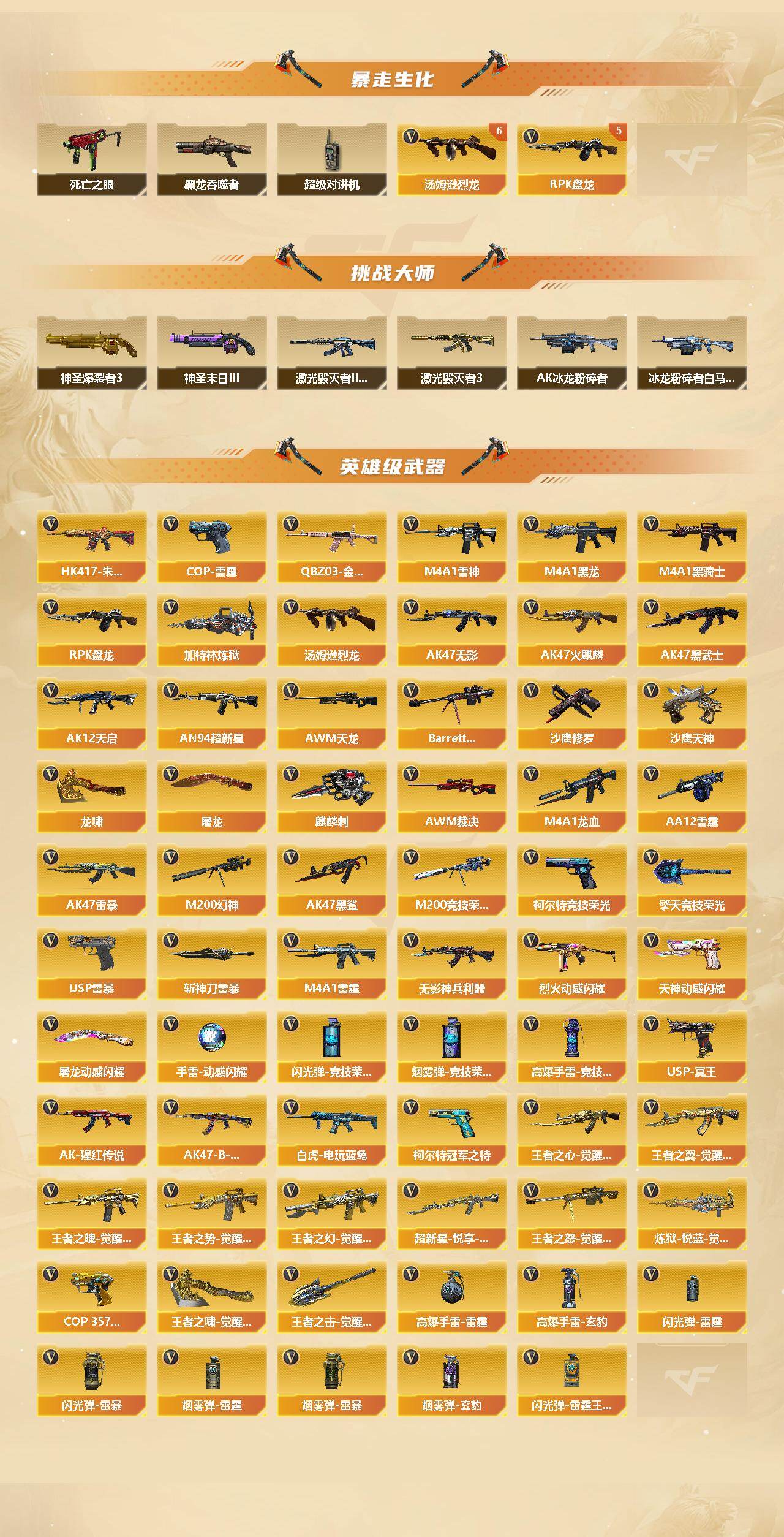 【英雄级武器】:AK47-火麒麟*4,M4A1-黑龙*3,M4A1-雷神*2,M4A1-黑骑士,AK47-无影,AK47-黑武士,AK12-天启,AN94-超新星,AK47-黑鲨,M4A1-龙血,M4A1-雷霆,AK47-雷暴,HK417-朱雀,无影-神兵利器,QBZ03-金色蔷薇,烈火