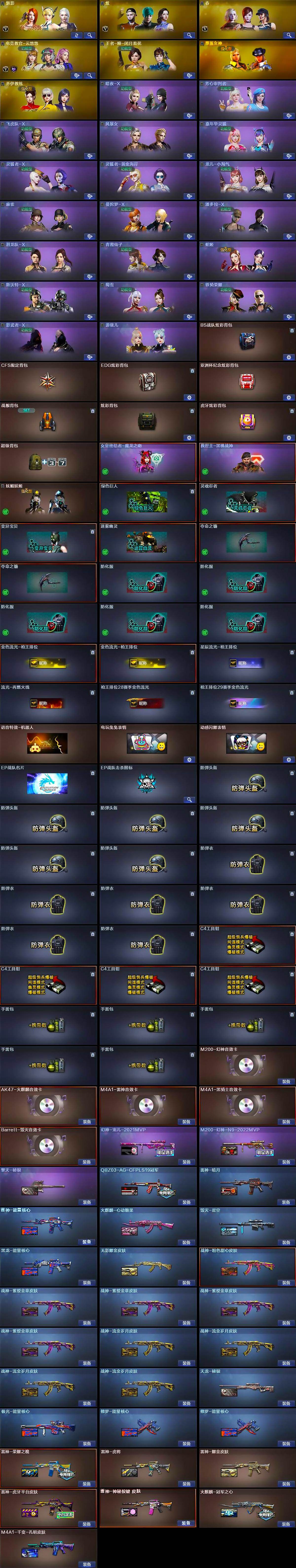 【皮肤】:幻神-宠儿-2021MVP,M200-幻神-N9-2022MVP,QBZ03-AG-CFPLS19冠军,雷神-暗月,雷神-能量核心,雷神-荣耀之魄,雷神-虎将,雷神-耀金皮肤,雷神-虎牙平台皮肤,雷神-神秘按键 皮肤,火麒麟-冠军之心,火麒麟-心动糖果,毁灭-星空,M4A1-千变-孔明皮肤,黑龙-能量核心,无影耀金皮肤,战神-粉色甜心皮肤,战神-紫绶金章皮肤*4,战神-流金岁月皮肤*4,天龙-秘银,极光-能量核心,修罗-能量核心*2,擎天-秘银