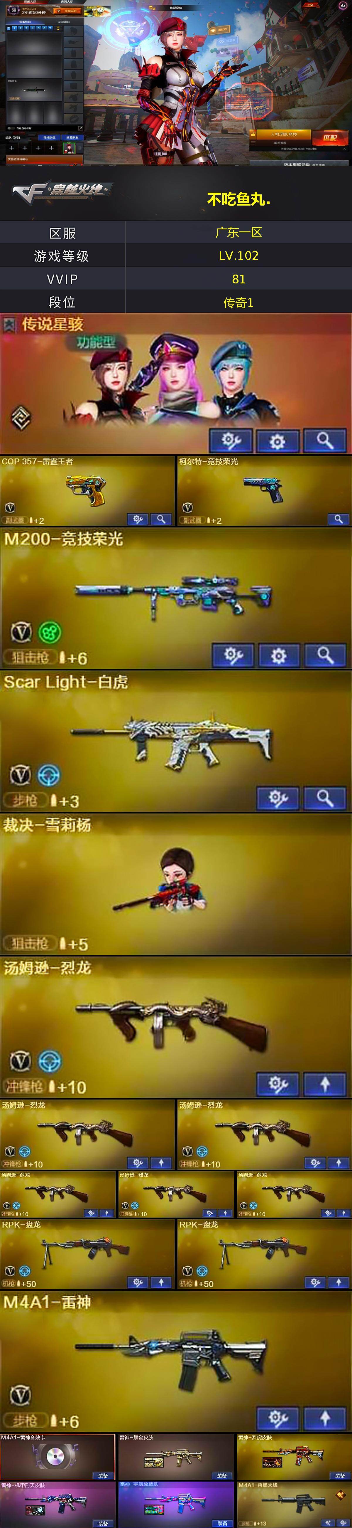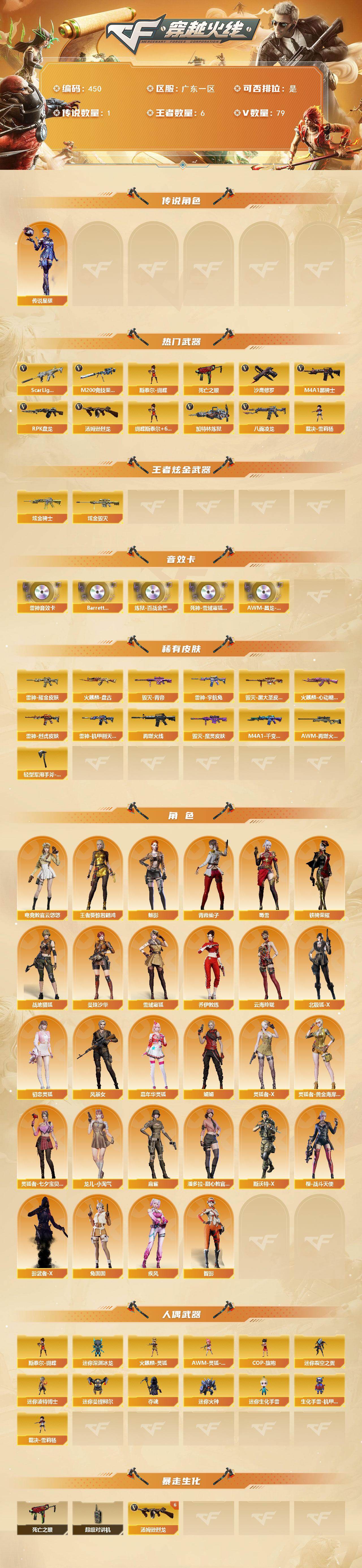 [14666701]广东一区-79V-6王者-2炫金 【传说角色】:传说星骇 【热门武器】:Scar Light-白虎,M200-竞技荣光,八面凌龙,死亡之眼,M4A1-黑骑士,汤姆逊-烈龙*6,RPK-盘龙*2,加特林-炼狱*4,斯泰尔-蝴蝶,裁决-雪莉杨,沙鹰-修罗*2 【王者炫金武器】:炫金骑士,炫金毁灭 【音效卡】:M4A1-雷神音效卡,Barrett-碧霄极光音效卡,炼狱-百战金芒-庆典舞曲音效卡,死神-雪域霜狐-怀旧音效卡,AWM-昌龙-怀旧音效卡 【皮肤】:雷神-耀金皮肤,雷神-烈虎皮肤,雷神-机甲刑天皮肤,雷神-宇航兔皮肤,M4A1-再燃火线,火麒麟-盘古,火麒麟-心动糖果,毁灭-黑大圣皮肤,毁灭-青帝,毁灭-魔灵皮肤,M4A1-千变-孔明皮肤,AWM-再燃火线,轻型军用手斧-再燃火线 【角色】:魅影,电竞教官-云悠悠,曼珠沙华,战地猎狐,王者葵-惊若翩鸿,雪域霜狐,乔伊教练,云海玲珑,北极狐-X,初恋灵狐,风暴女,嘉年华灵狐,疾风,娟娟,灵狐者-X,灵狐者-黄金海岸,灵狐者-七夕宝贝,龙儿-小淘气,麻雀,潘多拉-甜心教官,青霞仙子,斯沃特-X,蜀雪,铁骑荣耀,兔囡囡,樱-战斗天使,影武者-X,智影 【人偶武器】:裁决-雪莉杨,火麒麟-灵狐,斯泰尔-蝴蝶,AWM-灵狐-15周年嘉年华*2,COP-旗袍,迷你深渊冰龙*7,迷你裂空之翼*2,迷你波特博士*5,迷你曼提柯尔*2,夺魂,迷你火种*4,迷你生化手雷,生化手雷-机甲核心 【暴走生化】:死亡之眼,超级对讲机 【挑战大师】:神圣爆裂者III,激光毁灭者III,试炼破坏者III*3 【英雄级武器】:M4A1-千变,AK47-火麒麟*4,M4A1-雷神,M4A1-黑骑士,M4A1-死神,Scar Light-白虎,无影-神兵利器,八面凌龙,死神-雪域霜狐,M4A1-玫瑰精灵,王者之翼-觉醒版,王者之烈-觉醒版,Barrett-毁灭,M200-竞技荣光,RPK-盘龙*2,加特林-炼狱*4,炼狱-百战金芒,悦蓝-惊涛骇浪-觉醒版,汤姆逊-烈龙*6,沙鹰-修罗*2,沙鹰-天神,COP 357-雷霆王者-觉醒版,柯尔特-竞技荣光,屠龙*3,龙啸,马来剑-夜魔,擎天,麒麟刺,擎天-竞技荣光*2,麒麟刺-百战金芒,高爆手雷-夜魔,高爆手雷-竞技荣光*8,闪光弹-夜魔,闪光弹-竞技荣光*8,烟雾弹-夜魔,烟雾弹-竞技荣光*8,M4A1