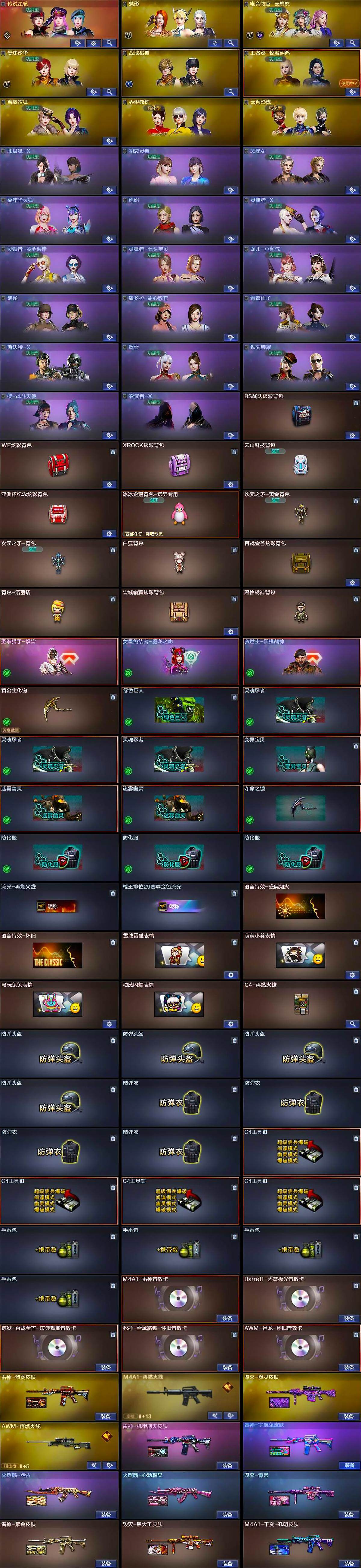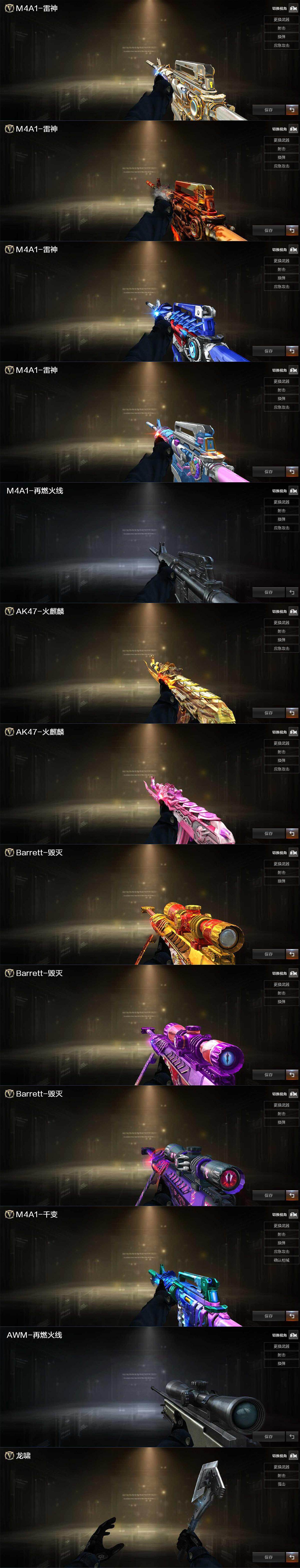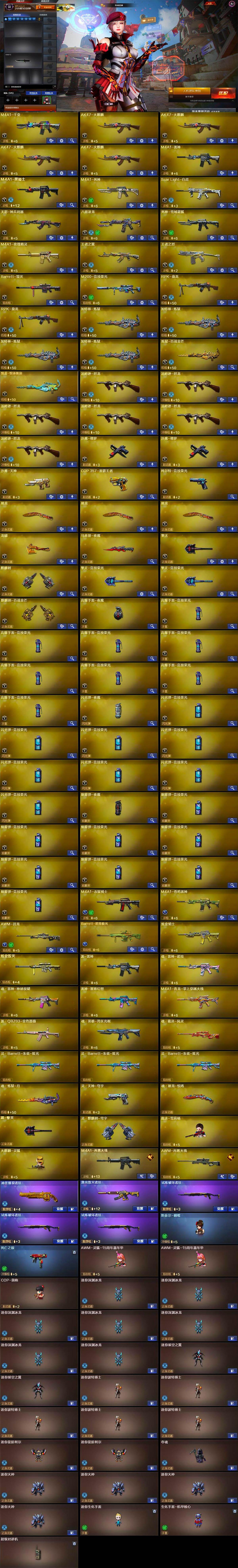 【英雄级武器】:M4A1-千变,AK47-火麒麟*4,M4A1-雷神,M4A1-黑骑士,M4A1-死神,Scar Light-白虎,无影-神兵利器,八面凌龙,死神-雪域霜狐,M4A1-玫瑰精灵,王者之翼-觉醒版,王者之烈-觉醒版,Barrett-毁灭,M200-竞技荣光,RPK-盘龙*2,加特林-炼狱*4,炼狱-百战金芒,悦蓝-惊涛骇浪-觉醒版,汤姆逊-烈龙*6,沙鹰-修罗*2,沙鹰-天神,COP 357-雷霆王者-觉醒版,柯尔特-竞技荣光,屠龙*3,龙啸,马来剑-夜魔,擎天,麒麟刺,擎天-竞技荣光*2,麒麟刺-百战金芒,高爆手雷-夜魔,高爆手雷-竞技荣光*8,闪光弹-夜魔,闪光弹-竞技荣光*8,烟雾弹-夜魔,烟雾弹-竞技荣光*8,M4A1
