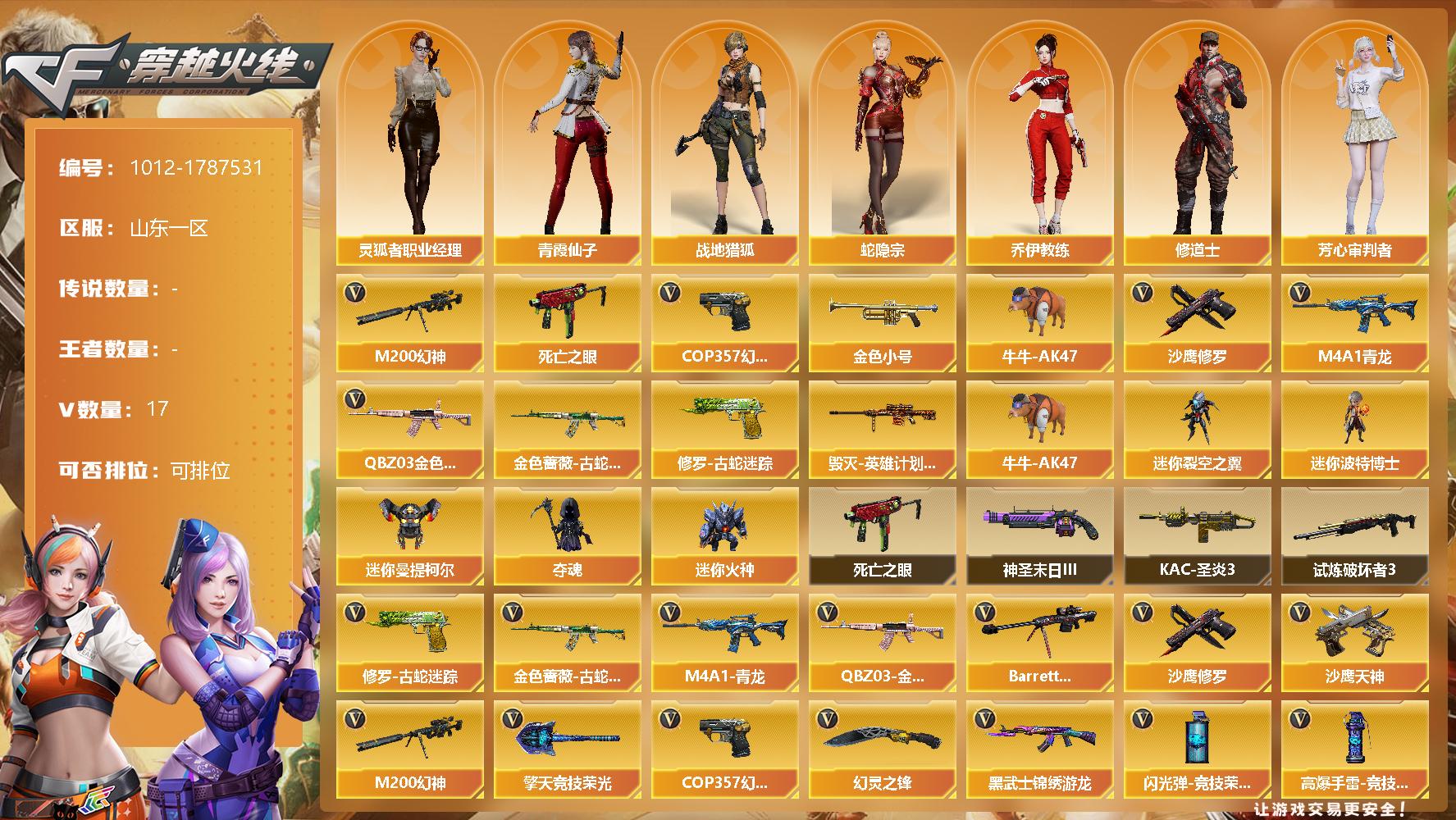 [14666921]16V/100级/元帅/1英雄/QBZ03-金色蔷薇/M4A1青龙/M200-幻神/金色蔷薇-古蛇迷踪/修罗-古蛇迷踪/死亡之眼/金色小号/牛牛-AK47/COP 357-幻灵/沙鹰-修罗/毁灭-英雄计划 皮肤/战地猎狐/蛇隐宗/乔伊教练/修道士/芳心审判者/风暴女/娟娟/灵狐者-职业经理/潘多拉-X/潘多拉-甜心教官/潜龙队-X/青霞仙子/蛇姬/迷你裂空之翼/迷你波特博士/迷你曼提柯尔/夺魂/迷你火种/试炼破坏者/KAC-圣炎切割者/神圣爆裂者-末日/AK47-黑武士-锦绣游龙/Barrett-毁灭/沙鹰-天神/幻灵之锋/擎天-竞技荣光/高爆手雷-幻灵/高爆手雷-竞技荣光/高爆手雷-古蛇迷踪/闪光弹-竞技荣光/烟雾弹-古蛇迷踪/M4A1-赤狱骑士/CFS限定背包/古蛇迷踪炫彩背包/次元之矛-黄金背包/裂空之翼背包-金色/超级背包/女皇终结者-魔龙之吻/救世主-黑桃战神/绿色巨人/灵魂忍者/迷雾幽灵/夺命之镰/防化服/金色流光-枪王排位/星辰流光-枪王排位/枪王排位28赛季金色流光/枪王排位29赛季金色流光/古蛇迷踪打击特效/蛇隐宗表情/防弹头盔/防弹衣/C4工具钳/手雷包