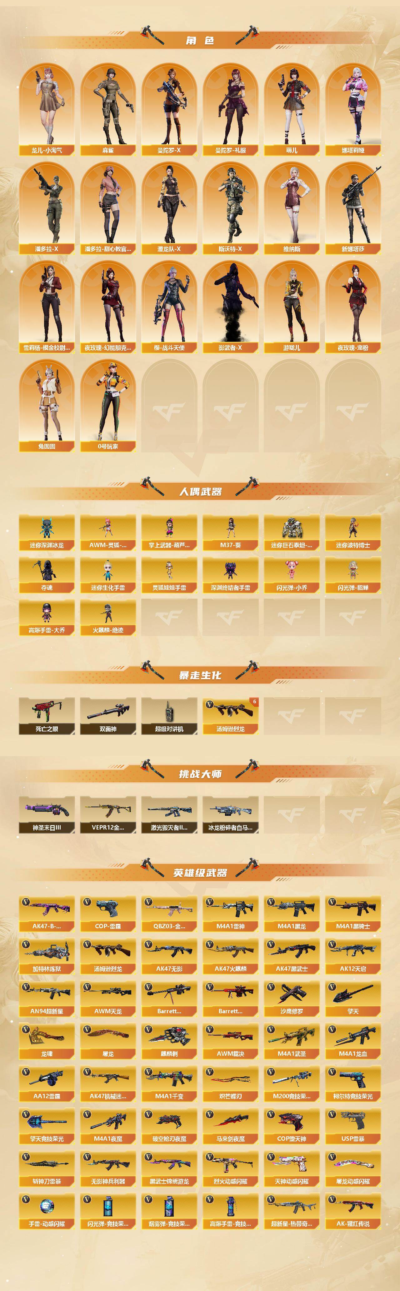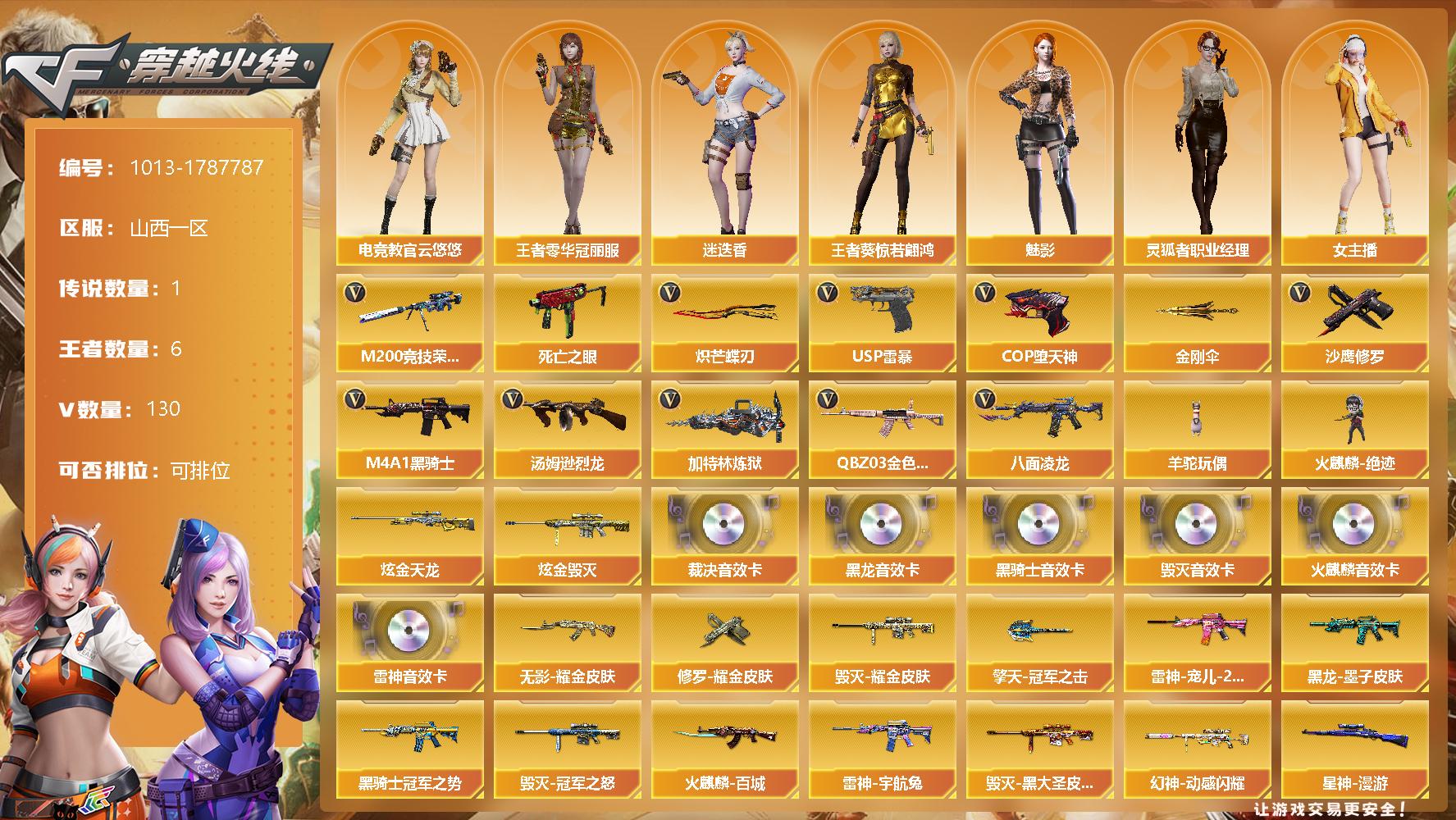 [14667322]126V/100级/元帅/1传说/6王者/3炫金/4英雄/传说影煞/QBZ03-金色蔷薇/M200-竞技荣光/八面凌龙/死亡之眼/M4A1-黑骑士/汤姆逊-烈龙/加特林-炼狱/羊驼玩偶/火麒麟-绝迹/USP雷暴/COP-堕天神/沙鹰-修罗/炽芒蝶刃/金刚伞/炫金毁灭/炫金天龙/AK47-火麒麟音效卡/M4A1-雷神音效卡/M4A1-黑龙音效卡/M4A1-黑骑士音效卡/Barrett-毁灭音效卡/AWM-裁决音效卡/幻神动感闪耀/AWM-裁决-凤灵皮肤/裁决-运输船 皮肤/裁决-胜者为王 皮肤/星神-漫游/雷神-暗月/雷神-宠儿-2019MVP/雷神-烈虎皮肤/雷神-机甲刑天皮肤/雷神-宇航兔/雷神-维纳斯皮肤/火麒麟-百城/毁灭耀金皮肤/毁灭-冠军之怒/毁灭-黑大圣皮肤/毁灭-虹光风暴 皮肤/毁灭-英雄计划 皮肤/M4A1-千变-孔明皮肤/黑龙-能量核心/黑龙-墨子皮肤/黑骑士-冠军之势/无影耀金皮肤/无影-神兵利器 皮肤/战神-粉色甜心皮肤/战神-紫绶金章皮肤/战神-流金岁月皮肤/AK47-B-常胜将军-曹操/AK47-B-常胜将军-刘备/炼狱-月 皮肤/修罗耀金皮肤/屠龙-星火燎原/龙啸-青青莓果 皮肤/擎天-冠军之击/麒麟刺-萌杀皮肤/麒麟刺-月皮肤/魅影/迷迭香/电竞教官-云悠悠/王者-零-华冠丽服/王者葵-惊若翩鸿/奇洋探员/乔伊教练/暗夜-X/北极狐-X/初恋灵狐/飞虎队-X/风暴女/虎妞/嘉年华灵狐/娟娟/葵-赛博朋克/兰-空鹰/兰妹妹/猎狐者-追月/0号玩家/零-水下丽影/灵狐-花神/灵狐者-X/灵狐者-黄金海岸/灵狐者-七夕宝贝/灵狐者-职业经理/龙儿/龙儿-小淘气/麻雀/曼陀罗-X/曼陀罗-礼服/萌儿/娜塔莉娅/女主播/潘多拉-X/潘多拉-甜心教官/潜龙队-X/青霞仙子/斯沃特-X/蜀雪/兔囡囡/维纳斯/新灵狐者/新娜塔莎/雪莉杨-摸金校尉/夜玫瑰-幻能朋克/夜玫瑰-宠粉/樱-战斗天使/影武者-X/游珑儿/AWM-灵狐-15周年嘉年华/M37-葵/迷你深渊冰龙/迷你波特博士/夺魂/迷你生化手雷/深渊终结者手雷/闪光弹-小乔/闪光弹-貂蝉/高爆手雷-大乔/迷你巨石泰坦-魔花研究所/灵狐娃娃手雷/掌上武器-葫芦兄弟/双面神/超级对讲机/6烈龙/冰龙粉碎者-白马银枪/激光毁灭者III-白马银枪/VEPR-12-金魔/神圣爆裂者-末日/M4A1-千变/
