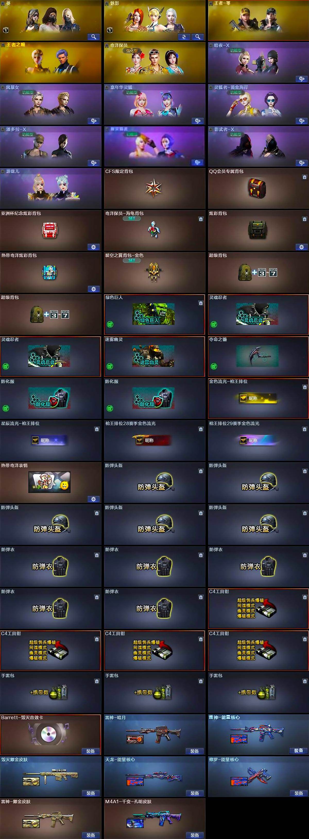 【道具】:CFS限定背包,QQ会员专属背包,亚洲杯纪念炫彩背包,奇洋探员-海龟背包,炫彩背包,热带奇洋炫彩背包,裂空之翼背包-金色,超级背包*2,绿色巨人,灵魂忍者*2,迷雾幽灵,夺命之镰,防化服*2,金色流光-枪王排位,星辰流光-枪王排位,枪王排位28赛季金色流光,枪王排位29赛季金色流光,热带奇洋表情,防弹头盔*5,防弹衣*5,C4工具钳*4,手雷包*3