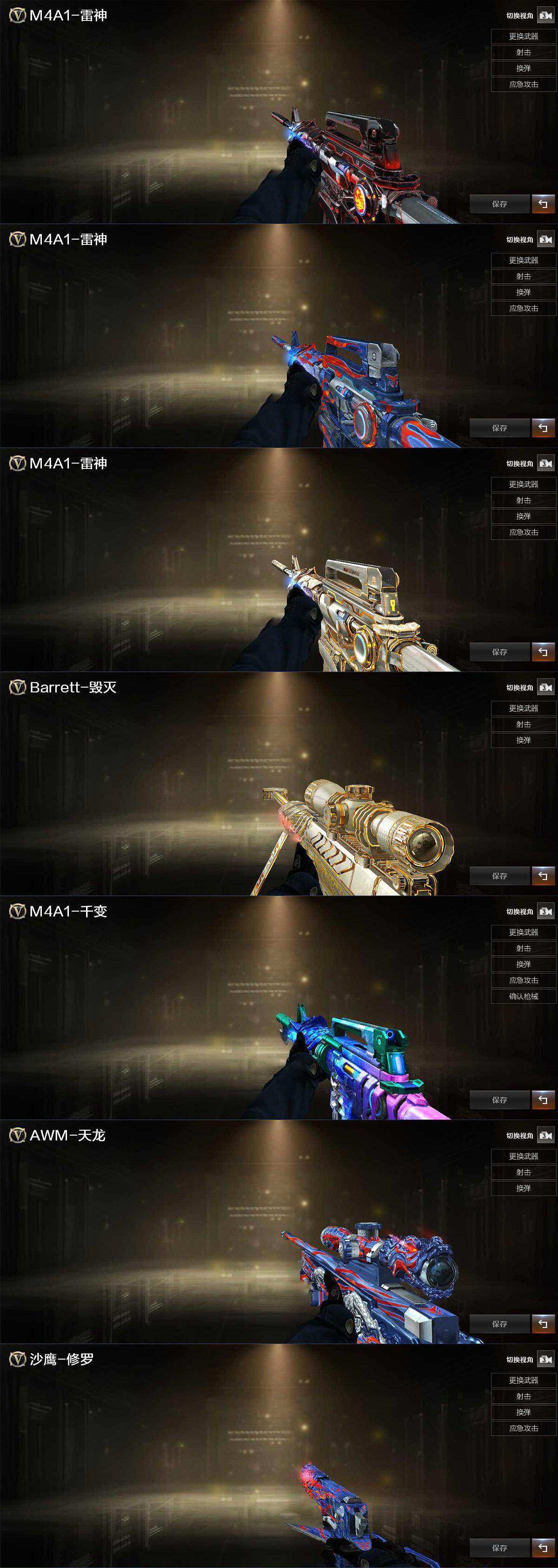 【英雄级武器】:AK47-火麒麟*3,M4A1-黑龙,M4A1-雷神*3,M4A1-黑骑士*3,M4A1-死神,AK47-黑武士*2,AN94-超新星,M4A1-武圣,黑武士-锦绣游龙,超新星-热带奇洋,QBZ03-金色蔷薇*2,M4A1-猎神,AK-47-猩红传说*2,AWM-天龙*3,Barrett-毁灭,AWM-裁决,Barrett-金色蔷薇*2,RPK-盘龙,炼狱-悦蓝-觉醒版,汤姆逊-烈龙*2,沙鹰-修罗*6,沙鹰-天神*2,Glock18-武圣,屠龙*6,龙啸*2,马来剑-夜魔,擎天*2,麒麟刺,龙啸-热带奇洋,斩神刀-雷暴,高爆手雷-雷霆*2,高爆手雷-雷暴,高爆手雷-夜魔,手雷-热带奇洋,闪光弹-雷霆*2,闪光弹-雷暴,闪光弹-夜魔,烟雾弹-雷霆*2,烟雾弹-雷暴,烟雾弹-夜魔
