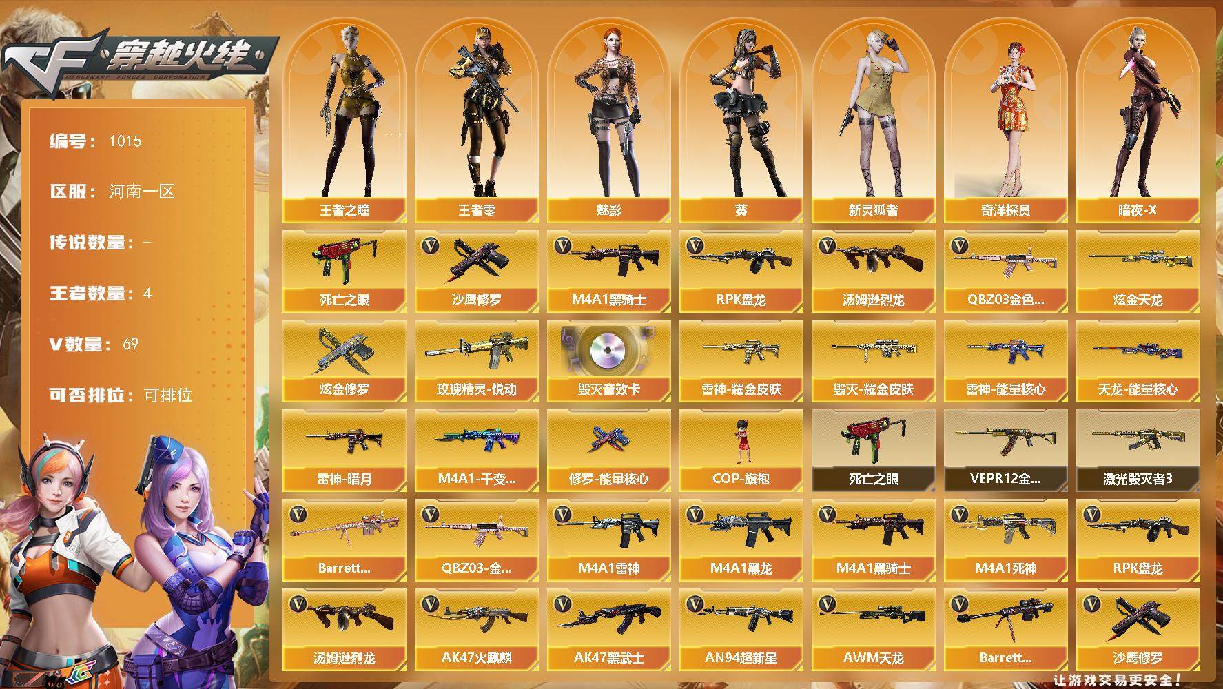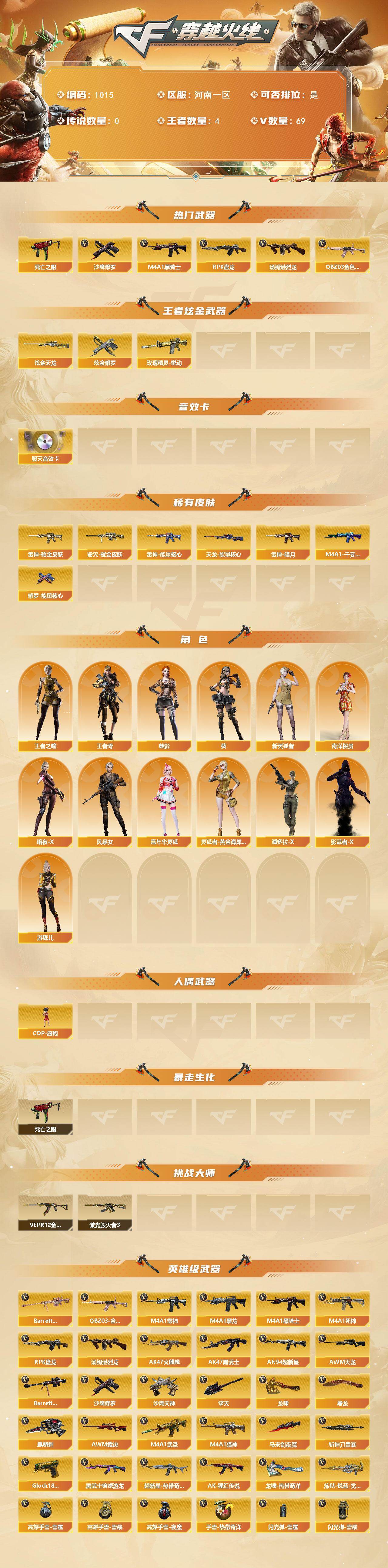 [14667851]河南一区-69V-4王者-2炫金 【热门武器】:QBZ03-金色蔷薇*2,死亡之眼*4,M4A1-黑骑士*3,汤姆逊-烈龙*2,RPK-盘龙,沙鹰-修罗*6 【王者炫金武器】:玫瑰精灵-悦动,炫金天龙,炫金修罗 【音效卡】:Barrett-毁灭音效卡 【皮肤】:雷神-暗月,雷神-能量核心,雷神-耀金皮肤,毁灭耀金皮肤,M4A1-千变-孔明皮肤,天龙-能量核心,修罗-能量核心 【角色】:葵,魅影,王者-零,王者之瞳,奇洋探员,暗夜-X,风暴女,嘉年华灵狐,灵狐者-黄金海岸,潘多拉-X,新灵狐者,影武者-X,游珑儿 【人偶武器】:COP-旗袍 【暴走生化】:死亡之眼*4 【挑战大师】:VEPR-12-金魔,激光毁灭者III 【英雄级武器】:AK47-火麒麟*3,M4A1-黑龙,M4A1-雷神*3,M4A1-黑骑士*3,M4A1-死神,AK47-黑武士*2,AN94-超新星,M4A1-武圣,黑武士-锦绣游龙,超新星-热带奇洋,QBZ03-金色蔷薇*2,M4A1-猎神,AK-47-猩红传说*2,AWM-天龙*3,Barrett-毁灭,AWM-裁决,Barrett-金色蔷薇*2,RPK-盘龙,炼狱-悦蓝-觉醒版,汤姆逊-烈龙*2,沙鹰-修罗*6,沙鹰-天神*2,Glock18-武圣,屠龙*6,龙啸*2,马来剑-夜魔,擎天*2,麒麟刺,龙啸-热带奇洋,斩神刀-雷暴,高爆手雷-雷霆*2,高爆手雷-雷暴,高爆手雷-夜魔,手雷-热带奇洋,闪光弹-雷霆*2,闪光弹-雷暴,闪光弹-夜魔,烟雾弹-雷霆*2,烟雾弹-雷暴,烟雾弹-夜魔 【道具】:CFS限定背包,QQ会员专属背包,亚洲杯纪念炫彩背包,奇洋探员-海龟背包,炫彩背包,热带奇洋炫彩背包,裂空之翼背包-金色,超级背包*2,绿色巨人,灵魂忍者*2,迷雾幽灵,夺命之镰,防化服*2,金色流光-枪王排位,星辰流光-枪王排位,枪王排位28赛季金色流光,枪王排位29赛季金色流光,热带奇洋表情,防弹头盔*5,防弹衣*5,C4工具钳*4,手雷包*3 【特殊枪械】:3黑骑士,2烈龙,1盘龙