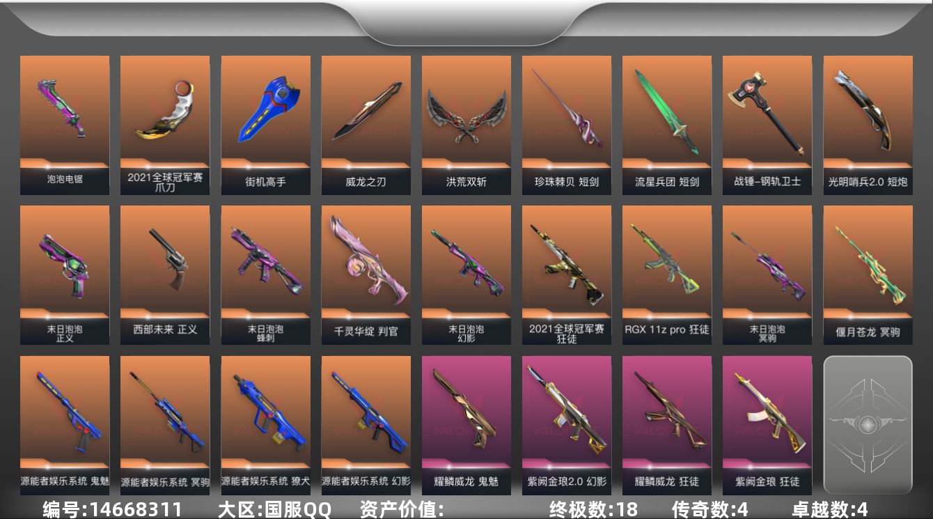 [14668311]【套装】:2021全球冠军赛套装,源能者娱乐系统套装,末日泡泡套装,耀鳞威龙套装 【英雄】:幻棱,炼狱,维斯,暮蝶,钛狐,壹决,铁臂,捷风,雷兹,幽影,不死鸟,贤者,猎枭,蝰蛇,零,芮娜,奇乐,尚勃勒,霓虹,斯凯,夜露,星礈,K/O,海神,盖可,黑梦,钢锁 【近战 武器】:近战武器-2021全球冠军赛 爪刀,近战武器-泡泡电锯,近战武器-威龙之刃,近战武器-珍珠棘贝 短剑,近战武器-流星兵团 短剑,近战武器-钢轨卫士 战锤,近战武器-洪荒双斩,近战武器-街机高手 【狂徒】:狂徒-2021全球冠军赛,狂徒-RGX 11z Pro,狂徒-耀鳞威龙,狂徒-紫阙金琅,狂徒-钢轨卫士,狂徒-流星兵团 【幻影】:幻影-源能者娱乐系统,幻影-末日泡泡,幻影-紫阙金琅//2.0,幻影-珍珠棘贝,幻影-战术小伙伴 【戍卫】:戍卫-钢轨卫士,戍卫-珍珠棘贝,戍卫-战术熊与伙伴们 【獠犬】:獠犬-源能者娱乐系统,獠犬-复古浪潮,獠犬-战术小伙伴 【冥驹】:冥驹-源能者娱乐系统,冥驹-偃月苍龙,冥驹-末日泡泡,冥驹-复古浪潮 【飞将】:飞将-光导纤维,飞将-战术熊与伙伴们 【莽侠】:莽侠-深海水族,莽侠-纤云弄巧 【战神】:战神-深海水族 【奥丁】:奥丁-流星兵团,奥丁-战术小伙伴 【判官】:判官-千灵华绽 【雄鹿】:雄鹿-复古浪潮 【骇灵】:骇灵-流星兵团,骇灵-珍珠棘贝,骇灵-光导纤维 【蜂刺】:蜂刺-末日泡泡,蜂刺-深海水族,蜂刺-纤云弄巧,蜂刺-战术小伙伴 【标配】:标配-光导纤维,标配-战术熊与伙伴们 【正义】:正义-西部未来,正义-末日泡泡,正义-超限闪存,正义-沙尘幻旅,正义-传奇制造,正义-复古浪潮,正义-纳米打击,正义-纤云弄巧 【鬼魅】:鬼魅-源能者娱乐系统,鬼魅-耀鳞威龙,鬼魅-流星兵团,鬼魅-诡秘蛇影,鬼魅-光导纤维,鬼魅-星云暗涌 【狂怒】:狂怒-钢轨卫士,狂怒-珍珠棘贝,狂怒-战术熊与伙伴们 【短炮】:短炮-光明哨兵//2.0,短炮-钢轨卫士,短炮-深海水族,短炮-纤云弄巧 【卡面】:终章:激斗汉堡 卡面,进入射程 卡面,《双城之战》拥抱 卡面,精灵大战 卡面,欢迎来到底城 卡面,南瓜盛典 卡面,修车达人 卡面,正义的化身 卡面,时间到 卡面,最高舞台 卡面,复活专家 卡面,声感陷阱设计图 卡面,Clutch 卡面,梦幻奶茶 卡面,终章:打造专属狂徒 卡面,趁