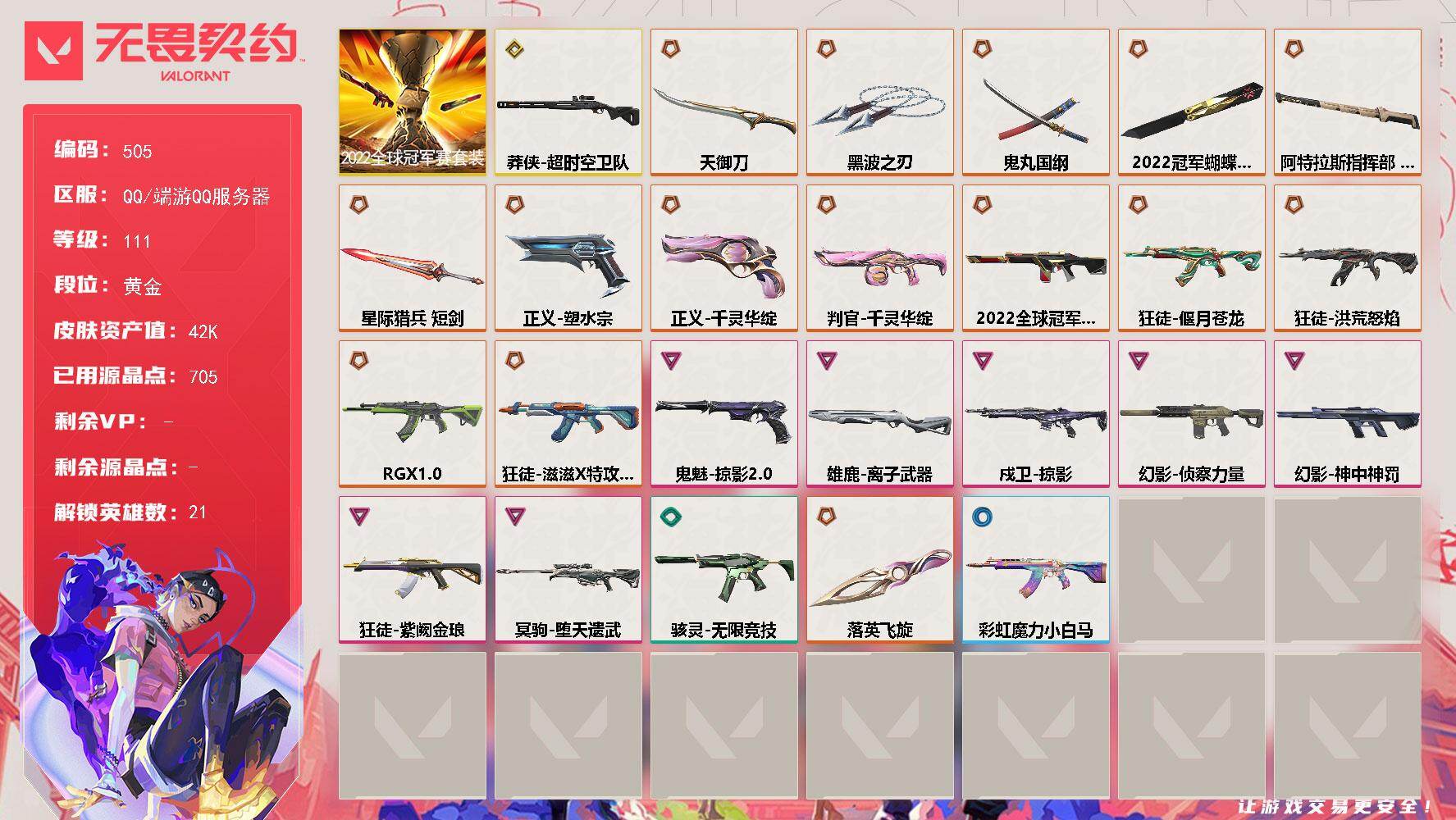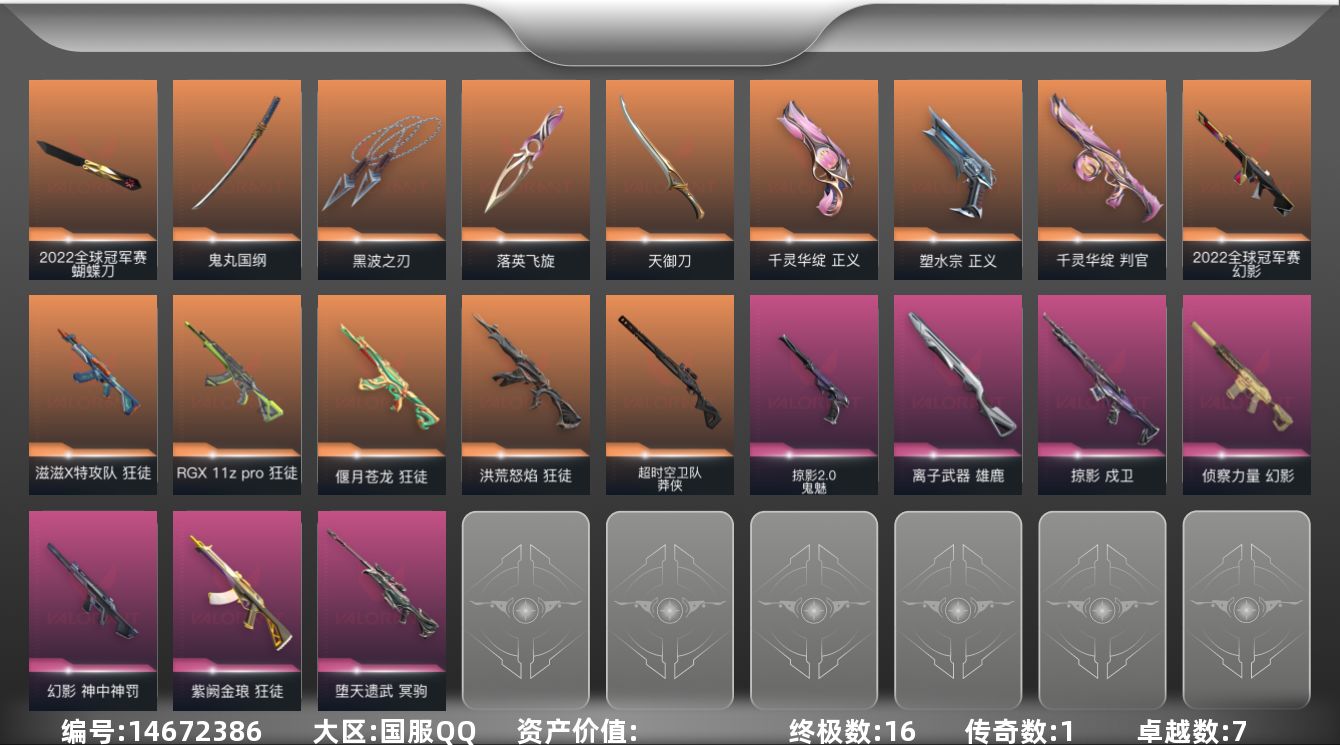 [14672386]【套装】:2022全球冠军赛套装 【英雄】:幻棱,炼狱,暮蝶,壹决,铁臂,捷风,雷兹,不死鸟,贤者,猎枭,芮娜,尚勃勒,霓虹,斯凯,星礈,K/O,海神,盖可,黑梦,钢锁 【近战 武器】:近战武器-2022全球冠军赛 蝴蝶刀,近战武器-黑波之刃,近战武器-落英飞旋,近战武器-鬼丸国纲,近战武器-天御刀,近战武器-阿特拉斯指挥部 甩棍,近战武器-星际猎兵 短剑 【狂徒】:狂徒-洪荒怒焰,狂徒-偃月苍龙,狂徒-RGX 11z Pro,狂徒-滋滋X特攻队,狂徒-紫阙金琅,狂徒-彩虹魔力小白马 【幻影】:幻影-2022全球冠军赛,幻影-侦察力量,幻影-神中神罚 【戍卫】:戍卫-掠影 【冥驹】:冥驹-堕天遗武 【莽侠】:莽侠-超时空卫队 【判官】:判官-千灵华绽 【雄鹿】:雄鹿-离子武器 【骇灵】:骇灵-无限竞技 【正义】:正义-千灵华绽,正义-塑水宗 【鬼魅】:鬼魅-掠影//2.0 【卡面】:表象之下 卡面,无畏契约GO!第一卷:芮娜 卡面,深海水族 卡面,无畏契约GO!第一卷:零 卡面,《双城之战》金克丝 卡面,代号红色 卡面,新兵报到 卡面,V契约 卡面,无畏契约 卡面 【喷漆】:双击点赞 喷漆,买装还是存钱 喷漆,辣得好下饭 喷漆,自信满满 喷漆,胜利属于无畏契约 喷漆,GLHF 喷漆,无畏契约 喷漆 【挂饰】:无畏契约GO!第一卷 芮娜 挂饰,天外飞客 挂饰,无畏契约 纪念币 挂饰