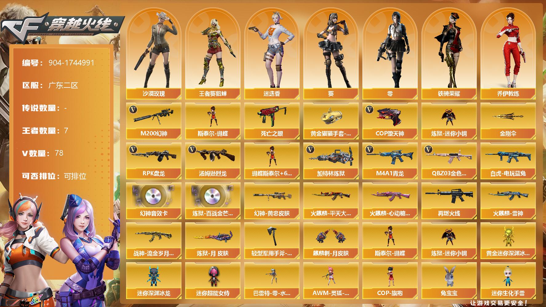 - [15522608]江苏一区-59V-4王者-1炫金 【传说武器】:传说暗裔,传说辉光 【热门武器】:传说暗裔,传说辉光,QBZ03-金色蔷薇,Scar Light-白虎,M200-幻神,死亡之眼,白虎-电玩蓝兔,柯尔特-冠军之特,M4A1-黑骑士,加特林-炼狱*2,羊驼玩偶,沙鹰-修罗*3,Knife-冠军之刃,黄金猫猫手套-白鲨 【王者炫金武器】:炫金毁灭 【音效卡】:M200-幻神音效卡,Scar Light-白虎音效卡,炼狱-百战金芒-庆典舞曲音效卡 【皮肤】:幻神-巅峰荣耀,幻神-电竞之星 皮肤,白虎-电玩粉兔皮肤,QBZ03-冠军之薇,金色蔷薇-电竞之星 皮肤,雷神-荣耀之魄,雷神-星空,雷神-虎将,雷神-宇航兔皮肤,M4A1-再燃火线,火麒麟-轻羽皮肤,火麒麟-平天大圣,火麒麟-巅峰荣耀,毁灭-荣耀之怒,毁灭-BEAN-2020MVP,M4A1-黑龙-361,黑骑士-冠军之势,黑骑士-地狱火,黑骑士-CFS2021,AK47-黑武士-361*2,战神-流金岁月皮肤,AK47-B-常胜将军-曹操,AK47-B-常胜将军-孙权*2,天龙-能量核心,炼狱-夏佐 皮肤,修罗-冠军之魂,修罗-百战金芒 皮肤,屠龙-荣耀之锋,轻型军用手斧-再燃火线 【角色】:雨棠,鹰,王者零-华冠丽服,王者-魅影,暗夜-X,风暴女,嘉年华灵狐,娟娟,灵动武士,龙儿-小淘气,潘多拉-X,蛇姬,兔囡囡,雪莉杨-摸金校尉,职业选手 【人偶武器】:AWM-灵狐-15周年嘉年华,迷你牛牛*2,生化手雷-机甲核心*3,迷你超能女侍 【暴走生化】:死亡之眼,超级对讲机 【英雄级武器】:AK47-火麒麟,M4A1-黑龙,M4A1-雷神,M4A1-黑骑士,Scar Light-白虎,无影-神兵利器,黑武士-锦绣游龙,QBZ03-金色蔷薇,王者之心-觉醒版,王者之影-觉醒版,AK-47-猩红传说*2,王者炎心-觉醒版,黑骑士-海王,AK47-B-常胜将军,白虎-电玩蓝兔,Barrett-毁灭,M200-幻神,Barrett-朱雀,王者星神-觉醒版,加特林-炼狱*2,炼狱-百战金芒,沙鹰-修罗*3,沙鹰-天神,柯尔特-冠军之特,屠龙*2,龙啸,擎天*2,麒麟刺,麒麟刺-百战金芒,丛林匕首-玄豹*2,高爆手雷-玄豹*3,闪光弹-玄豹*3,烟雾弹-古蛇迷踪,烟雾弹-玄豹*3 【道具】:泡泡象背包,BS战队炫彩背包,CFS限