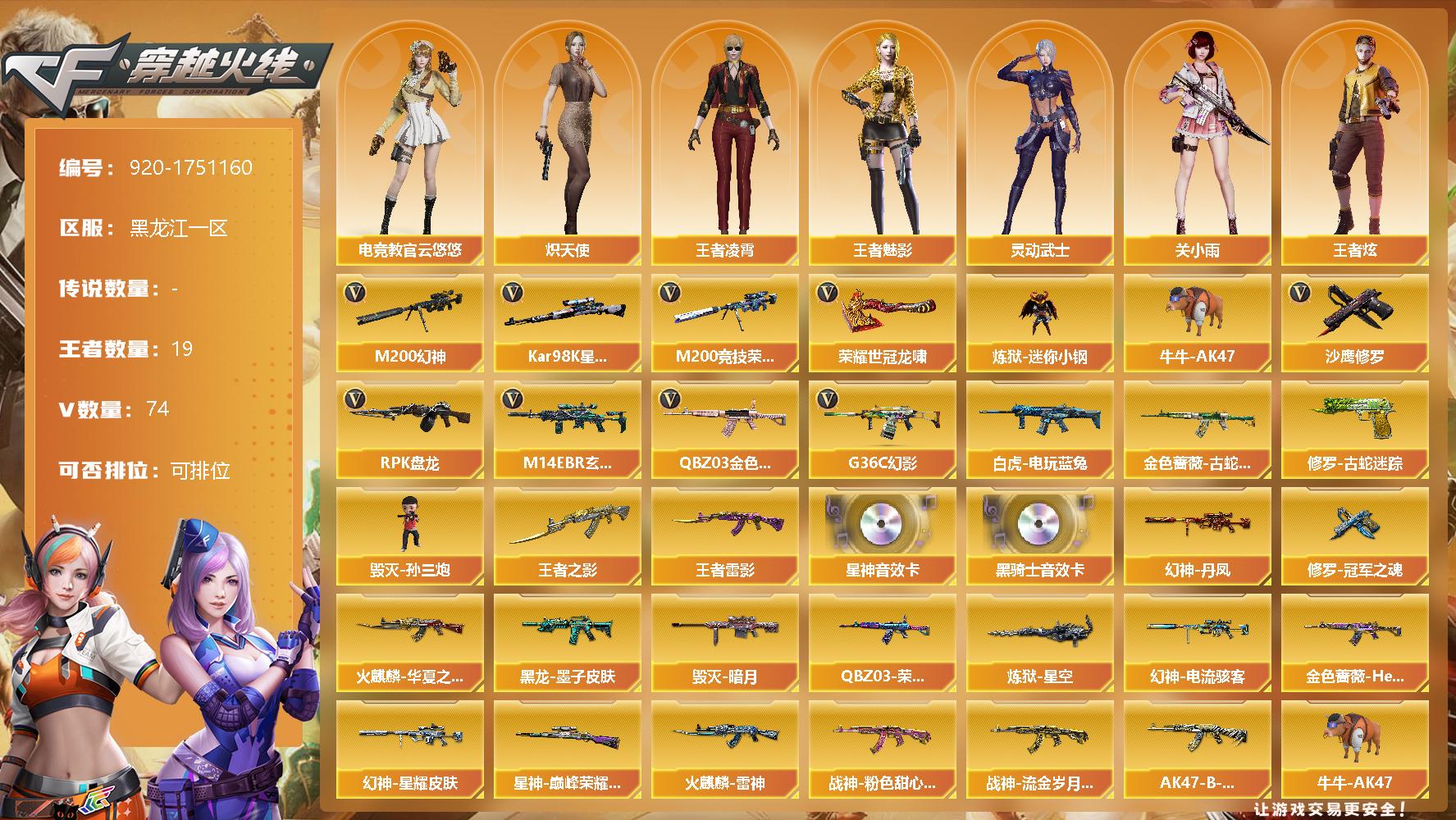 [14679427]黑龙江区-74V-19王者-0炫金 【热门武器】:G36C-幻影,QBZ03-金色蔷薇*6,M14EBR-玄武,M200-幻神,金色蔷薇-古蛇迷踪,修罗-古蛇迷踪,M200-竞技荣光,白虎-电玩蓝兔,Kar98K-星神,炼狱-迷你小钢,牛牛-AK47,RPK-盘龙*6,毁灭-孙三炮,沙鹰-修罗,荣耀世冠-龙啸 【王者炫金武器】:王者之影,王者雷影 【音效卡】:M4A1-黑骑士音效卡,Kar98