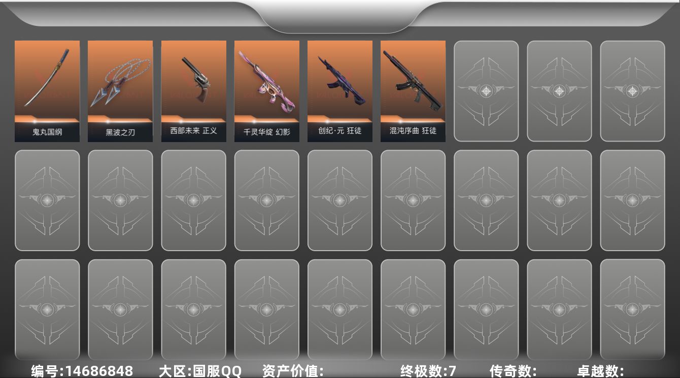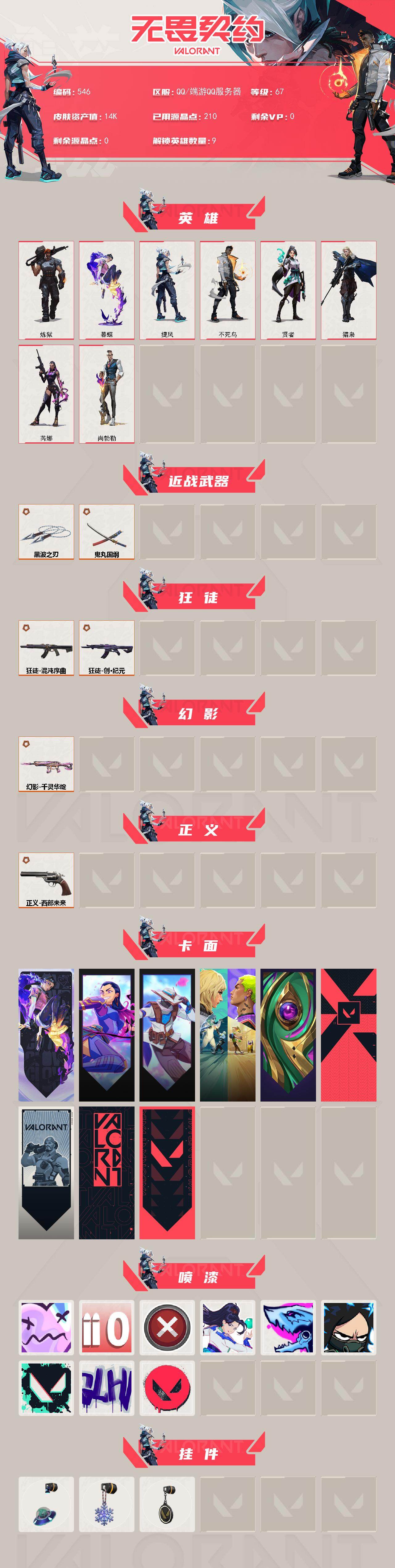[14686848]【英雄】:炼狱,暮蝶,捷风,不死鸟,贤者,猎枭,芮娜,尚勃勒 【近战 武器】:近战武器-黑波之刃,近战武器-鬼丸国纲 【狂徒】:狂徒-混沌序曲,狂徒-创·纪元 【幻影】:幻影-千灵华绽 【正义】:正义-西部未来 【卡面】:无畏契约:暮蝶 卡面,无畏契约GO!第一卷:芮娜 卡面,无畏契约GO!第一卷:零 卡面,钢锁vs盖可 卡面,沙尘幻旅 卡面,代号红色 卡面,新兵报到 卡面,V契约 卡面,无畏契约 卡面 【喷漆】:伤心心 喷漆,拼一枪 喷漆,买装还是存钱 喷漆,无畏契约GO!第一卷:贤者 喷漆,暴走萝莉 喷漆,电烫 喷漆,胜利属于无畏契约 喷漆,GLHF 喷漆,无畏契约 喷漆 【挂饰】:天外飞客 挂饰,冬日絮语 挂饰,无畏契约 纪念币 挂饰