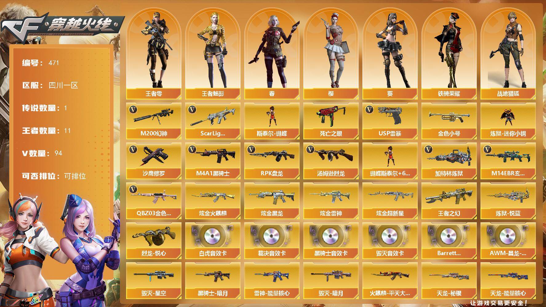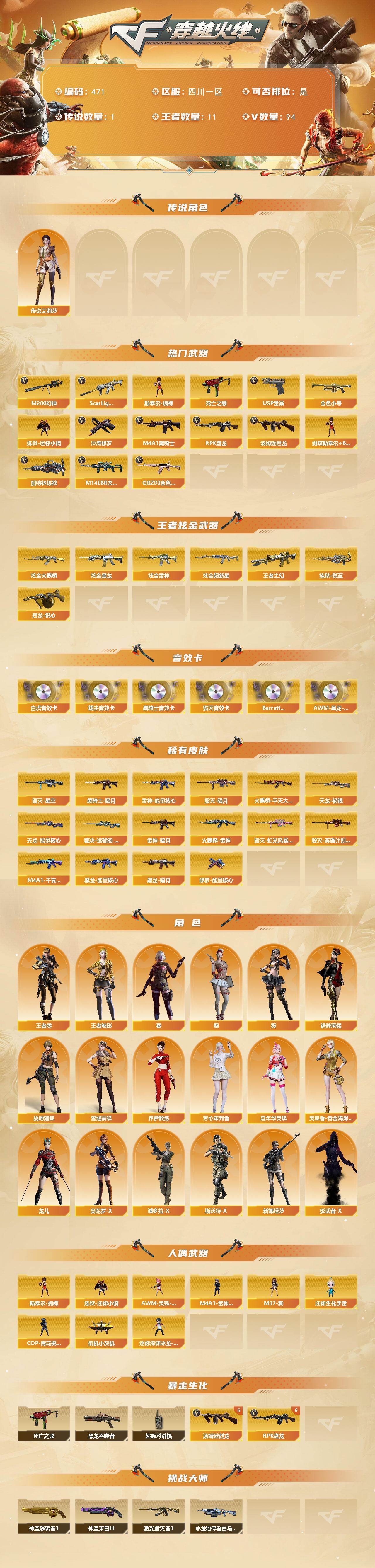 [14687652]四川一区-94V-11王者-4炫金 【传说角色】:传说艾莉莎 【热门武器】:QBZ03-金色蔷薇,M14EBR-玄武,Scar Light-白虎,M200-幻神,死亡之眼,金色小号,炼狱-迷你小钢,M4A1-黑骑士*2,汤姆逊-烈龙*7,RPK-盘龙*6,加特林-炼狱,斯泰尔-蝴蝶,USP-雷暴*2,沙鹰-修罗*2 【王者炫金武器】:王者之幻,炼狱-悦蓝*2,烈龙-悦心,炫金火麒麟,炫金黑龙,炫金雷神,炫金超新星 【音效卡】:M4A1-黑骑士音效卡,Barrett-毁灭音效卡,AWM-裁决音效卡,Scar Light-白虎音效卡,Barrett-碧霄极光音效卡,AWM-昌龙-怀旧音效卡 【皮肤】:裁决-运输船 皮肤,雷神-暗月,雷神-能量核心,火麒麟-雷神,火麒麟-平天大圣,毁灭-暗月,毁灭-星空,毁灭-虹光风暴 皮肤,毁灭-英雄计划 皮肤,M4A1-千变-孔明皮肤,黑龙-能量核心,黑龙-暗月,黑骑士-暗月,天龙-秘银,天龙-能量核心,修罗-能量核心*2 【角色】:葵,樱,春,战地猎狐,王者-零,王者-魅影,雪域霜狐,乔伊教练,芳心审判者,嘉年华灵狐,灵狐者-黄金海岸,龙儿,曼陀罗-X,潘多拉-X,斯沃特-X,铁骑荣耀,新娜塔莎,影武者-X 【人偶武器】:M4A1-雷神-精英刀锋,炼狱-迷你小钢,斯泰尔-蝴蝶,街机小灰机,AWM-灵狐-15周年嘉年华,M37-葵,迷你生化手雷*3,COP-青花瓷-斯沃特精英,迷你深渊冰龙-王绿豆 【暴走生化】:黑龙吞噬者,死亡之眼,超级对讲机 【挑战大师】:神圣爆裂者III,冰龙粉碎者-白马银枪,激光毁灭者III,神圣爆裂者-末日III 【英雄级武器】:AK47-火麒麟*3,M4A1-黑龙*2,M4A1-雷神*3,M4A1-黑骑士*2,AK47-无影*2,AK47-黑武士*2,AN94-超新星,M4A1-武圣,AK47-雷暴,Scar Light-白虎,M14EBR-玄武,无影-神兵利器,M4A1-玫瑰精灵,QBZ03-金色蔷薇,王者之魄-觉醒版*2,AK-47-猩红传说,王者冰魄-觉醒版,黑骑士-海王,AWM-天龙,Barrett-毁灭*3,AWM-裁决,M200-幻神,Barrett-金色蔷薇,RPK-盘龙*6,加特林-炼狱,炼狱-悦蓝-觉醒版,汤姆逊-烈龙*7,AA-12-雷霆,沙鹰-修罗*2,沙鹰-天神*3,USP-雷暴*