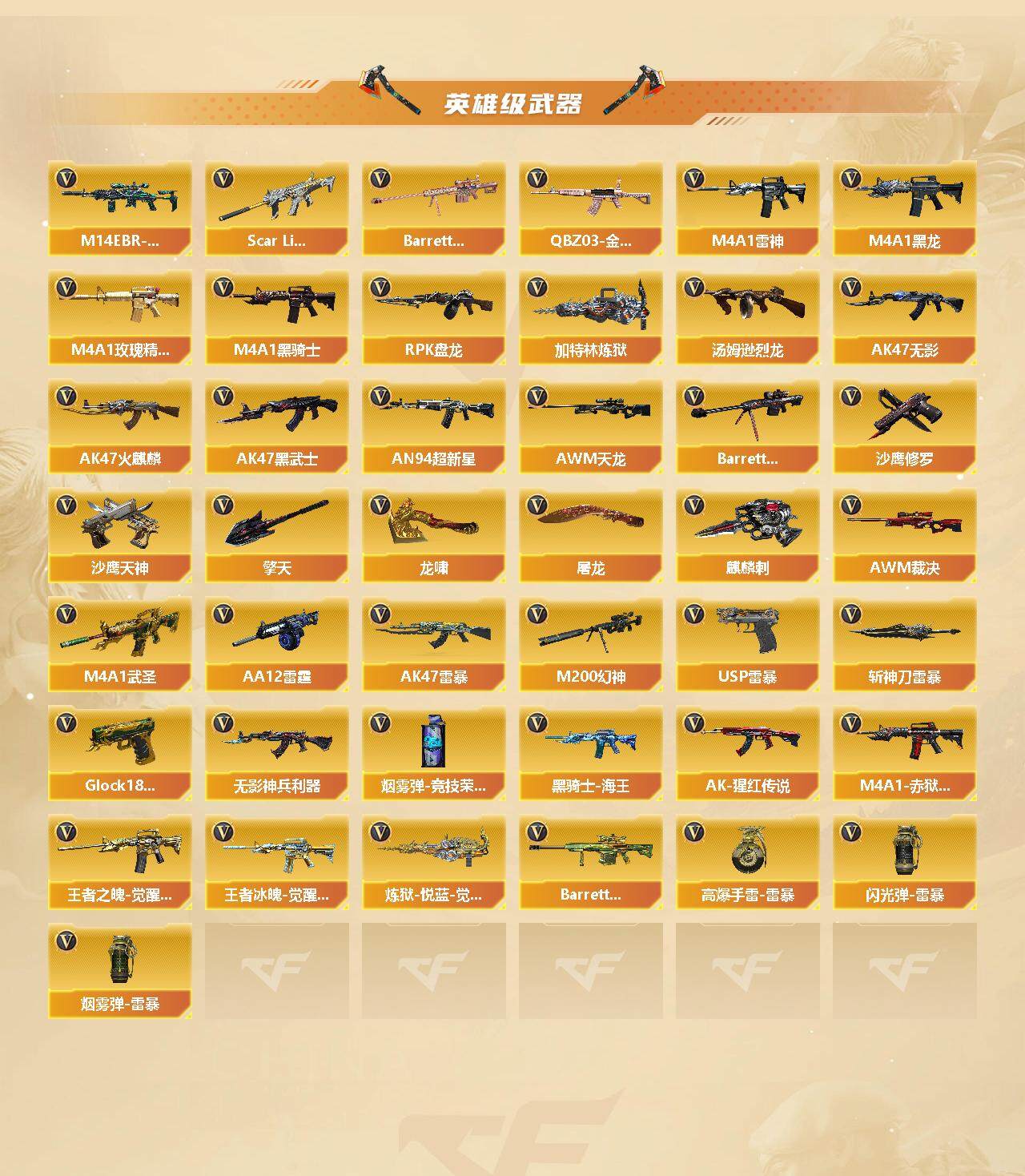 【英雄级武器】:AK47-火麒麟*3,M4A1-黑龙*2,M4A1-雷神*3,M4A1-黑骑士*2,AK47-无影*2,AK47-黑武士*2,AN94-超新星,M4A1-武圣,AK47-雷暴,Scar Light-白虎,M14EBR-玄武,无影-神兵利器,M4A1-玫瑰精灵,QBZ03-金色蔷薇,王者之魄-觉醒版*2,AK-47-猩红传说,王者冰魄-觉醒版,黑骑士-海王,AWM-天龙,Barrett-毁灭*3,AWM-裁决,M200-幻神,Barrett-金色蔷薇,RPK-盘龙*6,加特林-炼狱,炼狱-悦蓝-觉醒版,汤姆逊-烈龙*7,AA-12-雷霆,沙鹰-修罗*2,沙鹰-天神*3,USP-雷暴*