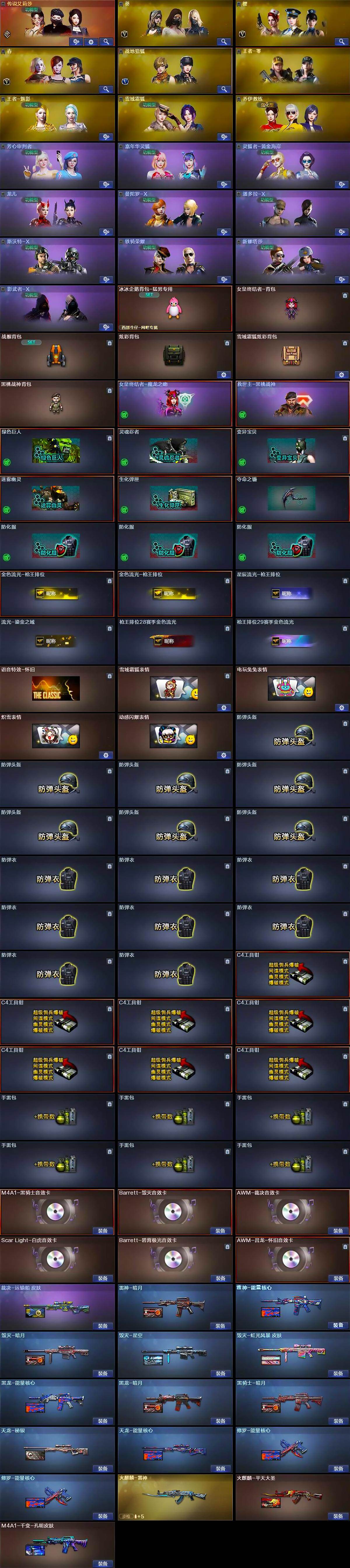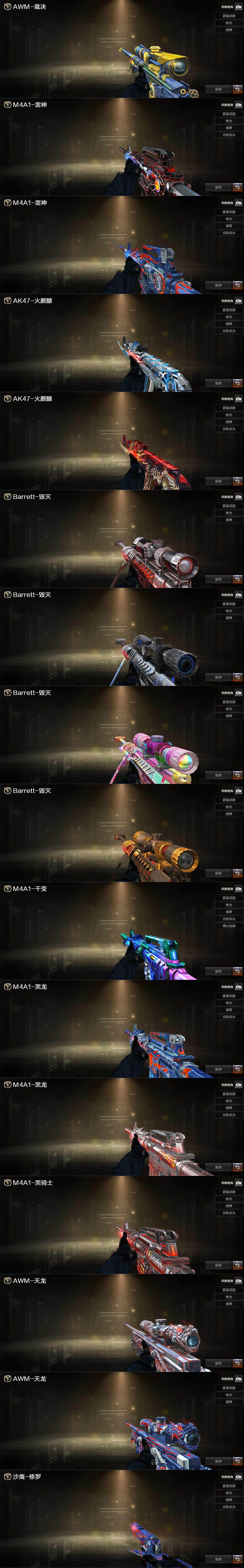 【音效卡】:M4A1-黑骑士音效卡,Barrett-毁灭音效卡,AWM-裁决音效卡,Scar Light-白虎音效卡,Barrett-碧霄极光音效卡,AWM-昌龙-怀旧音效卡