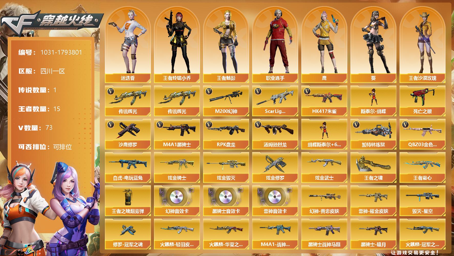 [14687736]四川一区-73V-15王者-4炫金 【传说武器】:传说辉光 【热门武器】:传说辉光,QBZ03-金色蔷薇,Scar Light-白虎,HK417-朱雀,M200-幻神,死亡之眼,白虎-电玩蓝兔,M4A1-黑骑士,汤姆逊-烈龙*6,RPK-盘龙,加特林-炼狱*5,斯泰尔-蝴蝶,沙鹰-修罗*4 【王者炫金武器】:王者霜心,王者之啸,炫金骑士,炫金武士,炫金毁灭,炫金修罗,王者之魄烟雾弹 【音效卡】