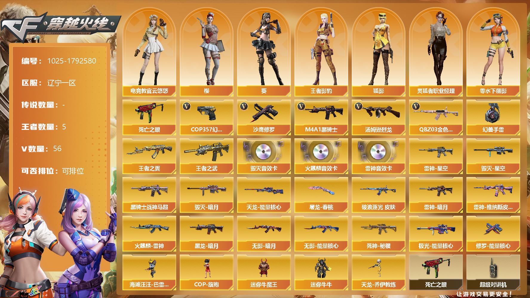 [14689036]辽宁一区-56V-5王者-0炫金 【热门武器】:QBZ03-金色蔷薇,死亡之眼*2,M4A1-黑骑士,汤姆逊-烈龙*6,COP 357-幻灵,沙鹰-修罗*3,高爆手雷-幻兽 【王者炫金武器】:王者之翼,王者之武 【音效卡】:AK47-火麒麟音效卡,M4A1-雷神音效卡,Barrett-毁灭音效卡 【皮肤】:金色蔷薇-破浪逐光 皮肤,雷神-暗月,雷神-星空,雷神-维纳斯皮肤,火麒麟-雷神,毁灭-