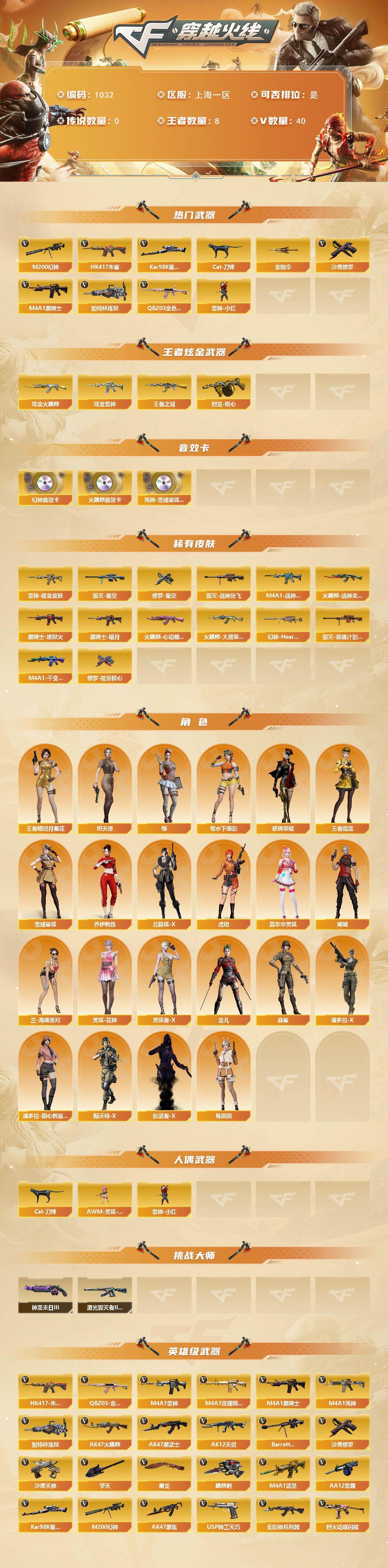 [14689504]上海一区-40V-8王者-2炫金 【热门武器】:QBZ03-金色蔷薇,HK417-朱雀,M200-幻神,Kar98K-星神,Cat-刀锋,M4A1-黑骑士,加特林-炼狱,雷神-小红,沙鹰-修罗*3,金刚伞 【王者炫金武器】:王者之城,烈龙-悦心,炫金火麒麟,炫金雷神 【音效卡】:M200-幻神音效卡,AK47-火麒麟音效卡,死神-雪域霜狐-怀旧音效卡 【皮肤】:幻神-Heartshot 皮肤,雷神-耀金皮肤,M4A1-战神赵云,火麒麟-战神关羽,火麒麟-大唐荣光,火麒麟-心动糖果,毁灭-星空,毁灭-战神张飞,毁灭-英雄计划 皮肤,M4A1-千变-孔明皮肤,黑骑士-暗月,黑骑士-地狱火,修罗-能量核心,修罗-星空 【角色】:樱,王者-瞳-闭月羞花,王者雨墨,雪域霜狐,乔伊教练,炽天使,北极狐-X,虎妞,嘉年华灵狐,娟娟,兰-海滩派对,零-水下丽影,灵狐-花神,灵狐者-X,龙儿,麻雀,潘多拉-X,潘多拉-甜心教官,斯沃特-X,铁骑荣耀,兔囡囡,影武者-X 【人偶武器】:雷神-小红,AWM-灵狐-15周年嘉年华,Cat-刀锋 【挑战大师】:激光毁灭者III-白马银枪,神圣爆裂者-末日III 【英雄级武器】:AK47-火麒麟*2,M4A1-雷神,M4A1-黑骑士,M4A1-死神,AK47-黑武士,AK12-天启,M4A1-武圣,AK47-黑鲨*2,HK417-朱雀,无影-神兵利器,死神-雪域霜狐,M4A1-玫瑰精灵,QBZ03-金色蔷薇,烈火-动感闪耀,王者火魄-觉醒版,白虎之魄-觉醒版,Barrett-毁灭,M200-幻神,Kar98K-星神,王者之决-觉醒版,加特林-炼狱,AA-12-雷霆,沙鹰-修罗*3,沙鹰-天神,USP-神工天巧,天神-动感闪耀,屠龙,擎天,麒麟刺,屠龙-动感闪耀,高爆手雷-神工天巧*3,手雷-动感闪耀,闪光弹-神工天巧*2,烟雾弹-神工天巧*2,M4A1-赤狱骑士 【道具】:全能枪王背包,炫彩背包,超级背包,迷你冰龙背包,雪域霜狐炫彩背包,女皇终结者-魔龙之吻,救世主-黑桃战神,绿色巨人,灵魂忍者,迷雾幽灵,夺命之镰,防化服*2,金色流光-枪王排位,流光-再燃火线,枪王排位28赛季金色流光,枪王排位29赛季金色流光,语音特效-怀旧,雪域霜狐表情,动感闪耀表情,CFPL选手表情-第2套,防弹头盔*5,防弹衣*4,C4工具钳*5,手雷包*4 【特殊