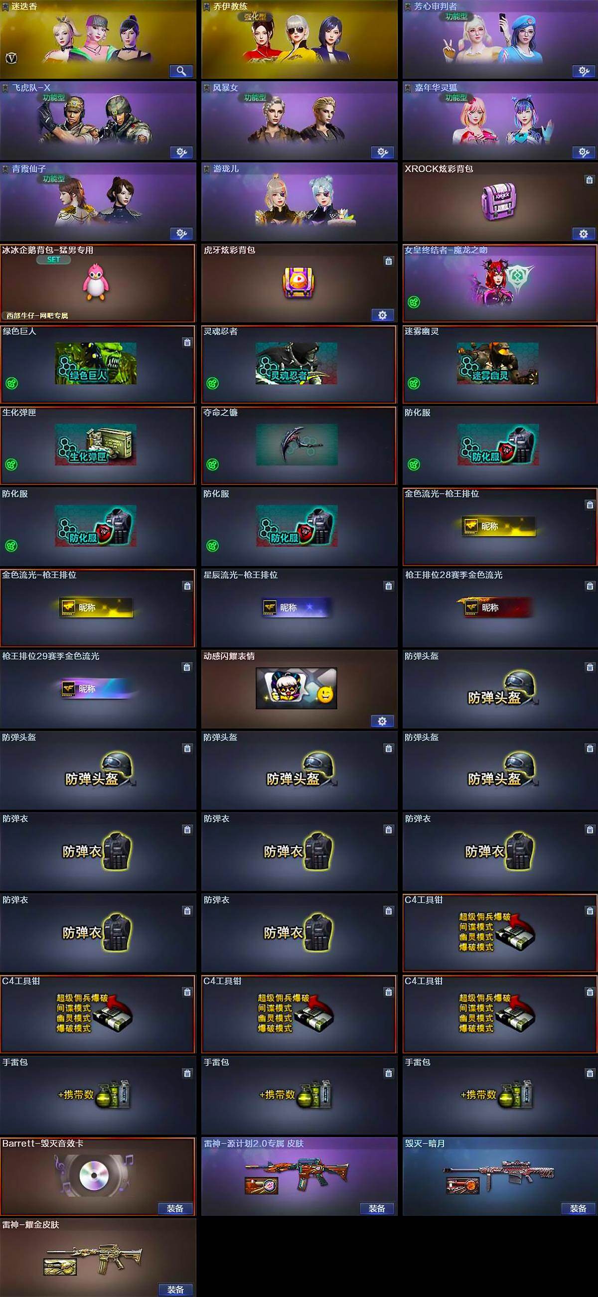 【道具】:XROCK炫彩背包,冰冰企鹅背包-猛男专用,虎牙炫彩背包,女皇终结者-魔龙之吻,绿色巨人,灵魂忍者,迷雾幽灵,生化弹匣,夺命之镰,防化服*3,金色流光-枪王排位*2,星辰流光-枪王排位,枪王排位28赛季金色流光,枪王排位29赛季金色流光,动感闪耀表情,防弹头盔*4,防弹衣*5,C4工具钳*4,手雷包*3