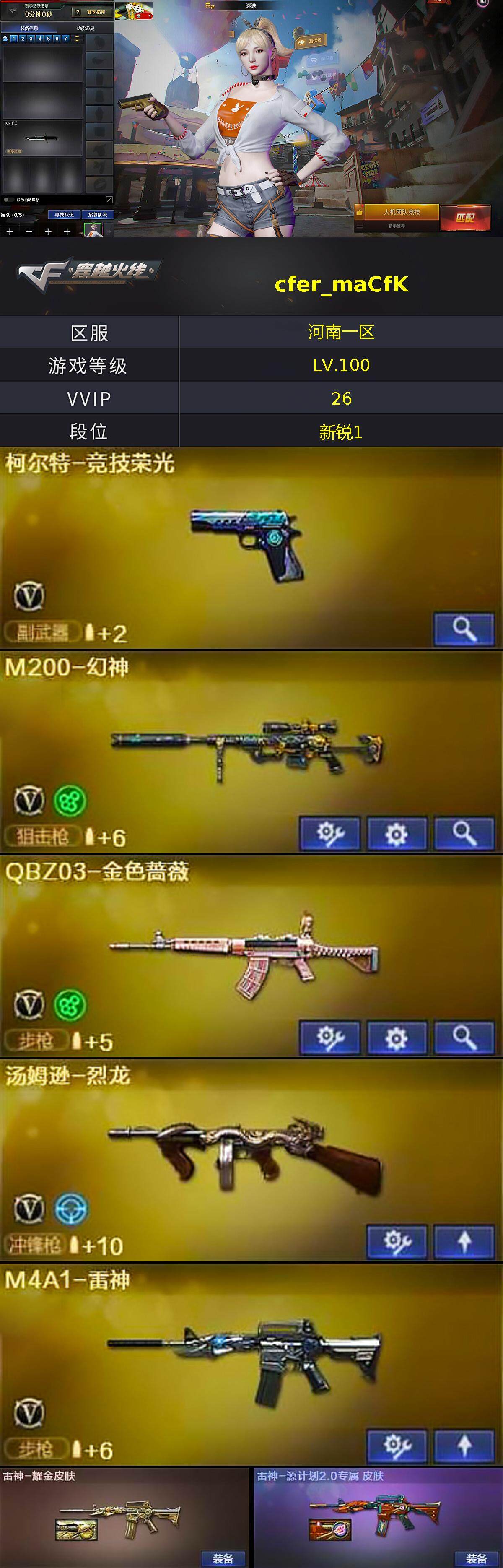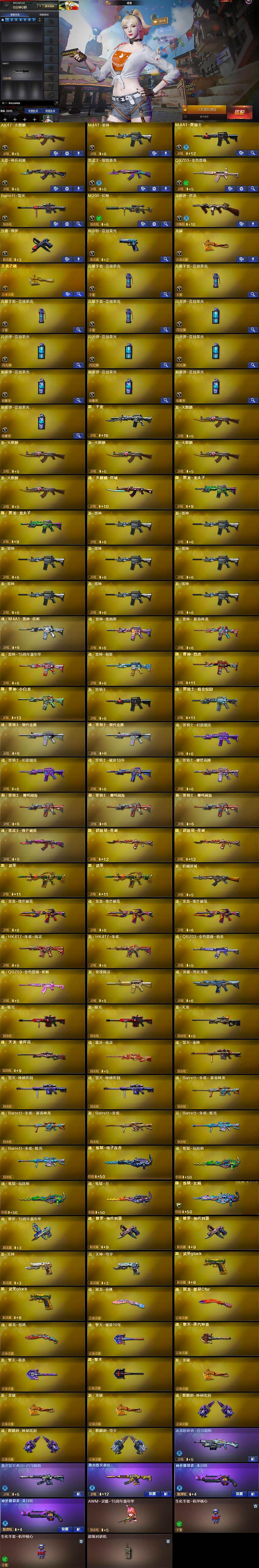 - [12540997]【商品标题】:湖南一区-47V-1王者-2炫金 【热门武器】:QBZ03-金色蔷薇,M14EBR-玄武,HK417-朱雀*2,M4A1-青龙,M200-竞技荣光,M4A1-黑骑士,汤姆逊-烈龙,USP-雷暴 【王者炫金武器】:炫金修罗,炫金武士 【音效卡】:M4A1-黑骑士音效卡,QBZ03-金色蔷薇音效卡 【稀有皮肤】:火麒麟-平天大圣*2,火麒麟-心动糖果,黑骑士-暗月,毁灭-青帝 【角色】:魅影,电竞教官-云悠悠,蜀雪 【人偶武器】:天龙-曼陀罗,火麒麟-灵狐,Barrett-夜玫瑰,M200-夜玫瑰,AWM-灵狐-15周年嘉年华,M4A1-雷神-精英刀锋,M37-葵,夺魂,生化手雷-机甲核心 【暴走生化】:超级对讲机 【挑战大师】:神圣爆裂者-末日III,激光毁灭者III-白马银枪,冰龙粉碎者-白马银枪 【英雄级武器】:M200-竞技荣光,柯尔特-竞技荣光,擎天-竞技荣光,高爆手雷-竞技荣光,烟雾弹-竞技荣光,闪光弹-竞技荣光,Barrett-电竞装甲,柯尔特-电竞装甲,尼泊尔-电竞装甲,USP-雷暴,QBZ03-金色蔷薇,M14EBR-玄武,HK417-朱雀*2,M4A1-青龙,无影-神兵利器,M4A1-雷神*2,M4A1-黑骑士,汤姆逊-烈龙,AK47-火麒麟*2,AWM-天龙,Barrett-毁灭,Barrett-朱雀,黑武士-锦绣游龙,黑骑士-海王*2,麒麟刺,龙啸,屠龙 【特殊枪械】:1黑骑士,1烈龙