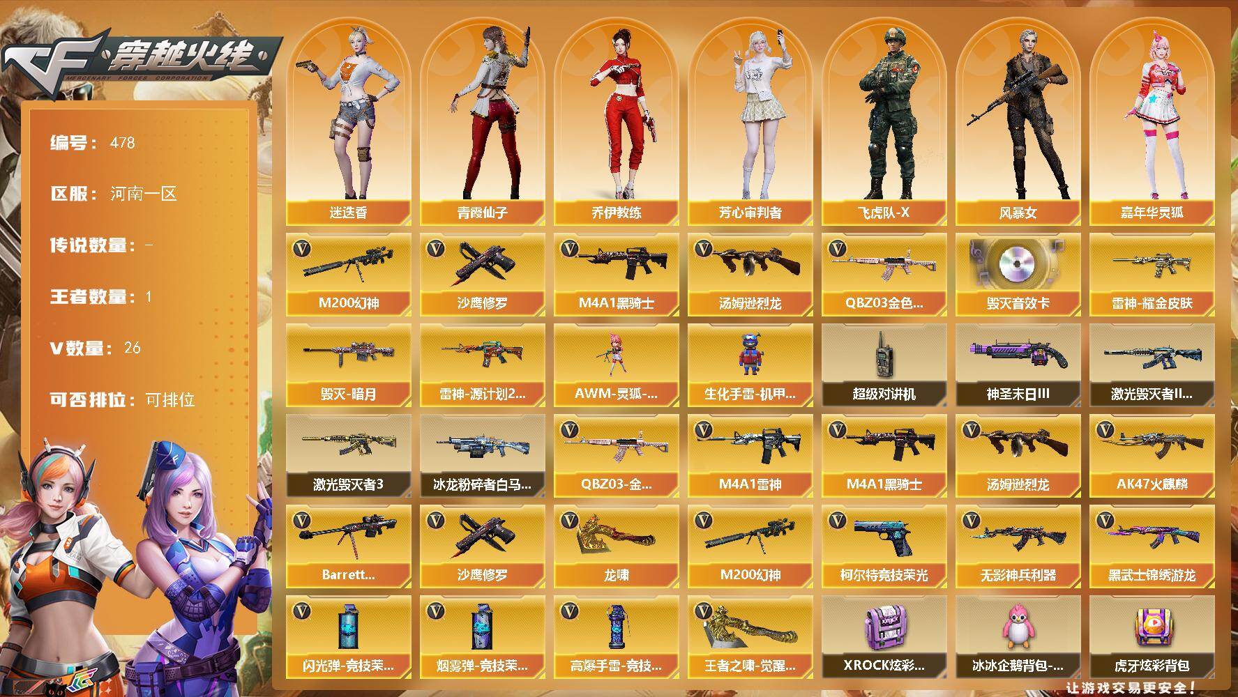 [14694693]河南一区-26V-1王者-0炫金 【热门武器】:QBZ03-金色蔷薇,M200-幻神,M4A1-黑骑士,汤姆逊-烈龙,沙鹰-修罗 【音效卡】:Barrett-毁灭音效卡 【皮肤】:雷神-耀金皮肤,雷神-源计划2.0专属 皮肤,毁灭-暗月 【角色】:迷迭香,乔伊教练,芳心审判者,飞虎队-X,风暴女,嘉年华灵狐,青霞仙子,兔囡囡,游珑儿 【人偶武器】:AWM-灵狐-15周年嘉年华,生化手雷-机甲核心*2 【暴走生化】:超级对讲机 【挑战大师】:冰龙粉碎者-白马银枪,激光毁灭者III-白马银枪,激光毁灭者III,神圣爆裂者-末日III*2 【英雄级武器】:AK47-火麒麟,M4A1-雷神,M4A1-黑骑士,无影-神兵利器,黑武士-锦绣游龙,QBZ03-金色蔷薇,Barrett-毁灭,M200-幻神,汤姆逊-烈龙,沙鹰-修罗,柯尔特-竞技荣光,龙啸,王者之啸-觉醒版,高爆手雷-竞技荣光*4,闪光弹-竞技荣光*4,烟雾弹-竞技荣光*4 【道具】:XROCK炫彩背包,冰冰企鹅背包-猛男专用,虎牙炫彩背包,女皇终结者-魔龙之吻,绿色巨人,灵魂忍者,迷雾幽灵,生化弹匣,夺命之镰,防化服*3,金色流光-枪王排位*2,星辰流光-枪王排位,枪王排位28赛季金色流光,枪王排位29赛季金色流光,动感闪耀表情,防弹头盔*4,防弹衣*5,C4工具钳*4,手雷包*3 【特殊枪械】:1黑骑士,1烈龙