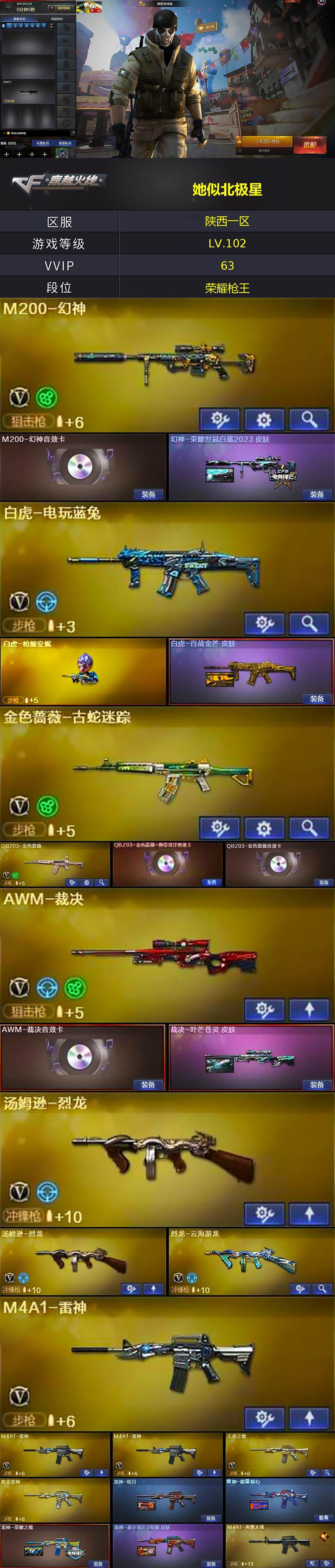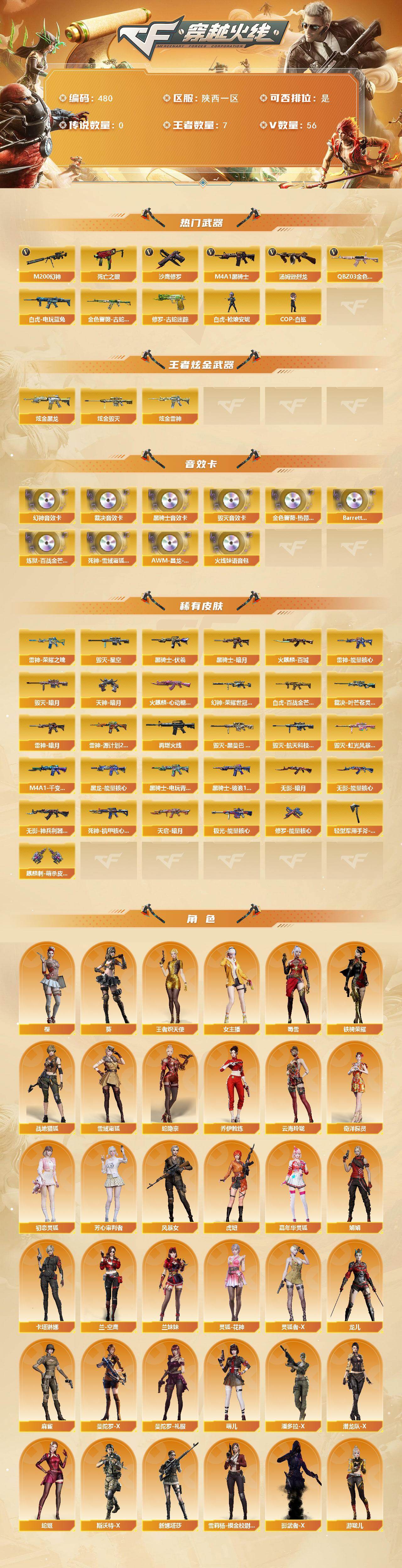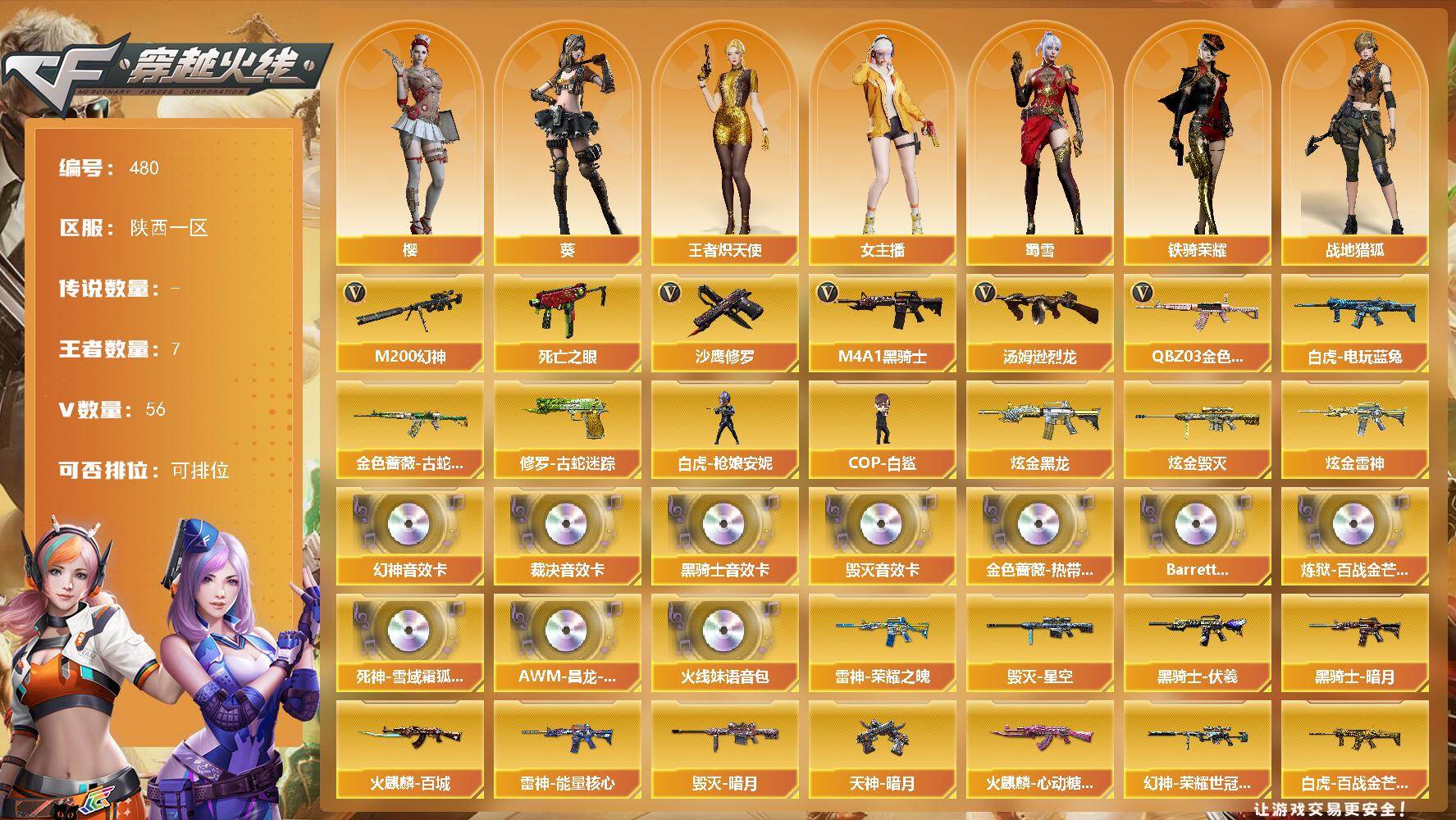 [14695643]陕西一区-56V-7王者-3炫金 【热门武器】:QBZ03-金色蔷薇,M200-幻神,金色蔷薇-古蛇迷踪,修罗-古蛇迷踪,死亡之眼,白虎-电玩蓝兔,M4A1-黑骑士,汤姆逊-烈龙*2,白虎-枪娘安妮,COP-白鲨,沙鹰-修罗*2 【王者炫金武器】:炫金黑龙,炫金雷神,炫金毁灭 【音效卡】:QBZ03-金色蔷薇-热带奇洋音效卡,M200-幻神音效卡,M4A1-黑骑士音效卡,Barrett-毁灭音效卡,AWM-裁决音效卡,Barrett-碧霄极光音效卡,炼狱-百战金芒-庆典舞曲音效卡,死神-雪域霜狐-怀旧音效卡,AWM-昌龙-怀旧音效卡,火线妹语音包 【皮肤】:幻神-荣耀世冠白鲨2023 皮肤,白虎-百战金芒 皮肤,裁决-叶芒苍灵 皮肤,雷神-暗月,雷神-能量核心,雷神-荣耀之魄,雷神-源计划2.0专属 皮肤,M4A1-再燃火线,火麒麟-百城,火麒麟-心动糖果,毁灭-暗月*2,毁灭-星空,毁灭-黑曼巴 皮肤,毁灭-航天科技皮肤,毁灭-虹光风暴 皮肤,M4A1-千变-孔明皮肤,黑龙-能量核心,黑骑士-暗月*2,黑骑士-伏羲,黑骑士-电玩青兔皮肤,黑骑士-破浪10年皮肤,无影-暗月*2,无影-能量核心*2,无影-神兵利器 皮肤,死神-机甲核心皮肤,天启-暗月*2,极光-能量核心*2,修罗-能量核心*3,天神-暗月,轻型军用手斧-再燃火线,麒麟刺-萌杀皮肤 【角色】:葵,樱,战地猎狐,王者炽天使,雪域霜狐,蛇隐宗,奇洋探员,乔伊教练,云海玲珑,初恋灵狐,芳心审判者,风暴女,虎妞,嘉年华灵狐,娟娟,卡塔琳娜,兰-空鹰,兰妹妹,灵狐-花神,灵狐者-X,龙儿,麻雀,曼陀罗-X,曼陀罗-礼服,萌儿,女主播,潘多拉-X,潜龙队-X,蛇姬,斯沃特-X,蜀雪,铁骑荣耀,兔囡囡,新娜塔莎,雪莉杨-摸金校尉,影武者-X,游珑儿,海豹突击队 【人偶武器】:COP-白鲨,M4A1-雷神-精英刀锋,白虎-枪娘安妮,COP-旗袍,迷你深渊冰龙,迷你裂空之翼,迷你牛魔王,迷你波特博士,夺魂,迷你牛牛*2,生化手雷-机甲核心,深渊终结者手雷,迷你艾比,迷你超能女侍,迷你巨石泰坦-魔花研究所,灵狐娃娃手雷 【暴走生化】:黑龙吞噬者,死亡之眼 【挑战大师】:冰龙粉碎者-白马银枪,激光毁灭者III-白马银枪,试炼破坏者III,神圣爆裂者-末日III 【英雄级武器】:AK47-火麒麟*2,M4A1-黑龙,M4A