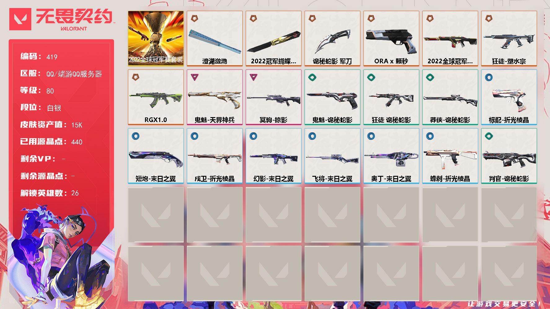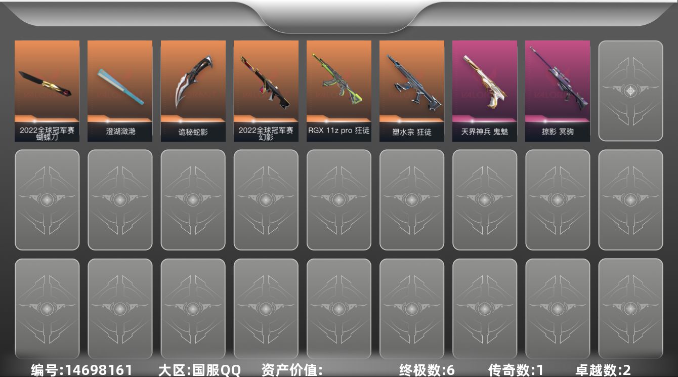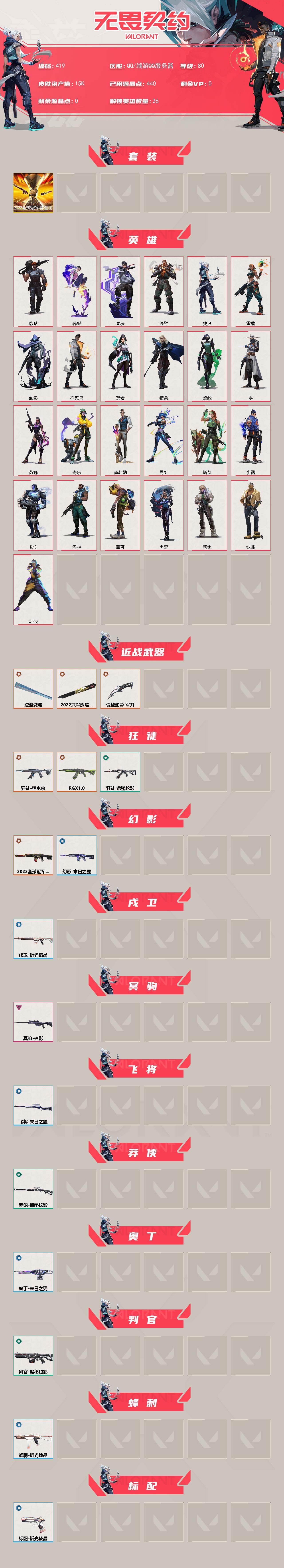 [14698161]【套装】:2022全球冠军赛套装 【英雄】:幻棱,炼狱,暮蝶,钛狐,壹决,铁臂,捷风,雷兹,幽影,不死鸟,贤者,猎枭,蝰蛇,零,芮娜,奇乐,尚勃勒,霓虹,斯凯,夜露,K/O,海神,盖可,黑梦,钢锁 【近战 武器】:近战武器-2022全球冠军赛 蝴蝶刀,近战武器-澄湖潋滟,近战武器-诡秘蛇影 军刀 【狂徒】:狂徒-塑水宗,狂徒-RGX 11z Pro,狂徒-诡秘蛇影 【幻影】:幻影-2022全球冠军赛,幻影-末日之翼 【戍卫】:戍卫-折光棱晶 【冥驹】:冥驹-掠影 【飞将】:飞将-末日之翼 【莽侠】:莽侠-诡秘蛇影 【奥丁】:奥丁-末日之翼 【判官】:判官-诡秘蛇影 【蜂刺】:蜂刺-折光棱晶 【标配】:标配-折光棱晶 【正义】:正义-ORA x 颗秒 【鬼魅】:鬼魅-天界神兵,鬼魅-诡秘蛇影 【短炮】:短炮-末日之翼 【卡面】:《双城之战》拥抱 卡面,欢迎来到底城 卡面,南瓜盛典 卡面,修车达人 卡面,正义的化身 卡面,时间到 卡面,最高舞台 卡面,声感陷阱设计图 卡面,梦幻奶茶 卡面,零点嗅探设计图 卡面,无畏契约GO!第一卷:芮娜 卡面,清除名单 卡面,无畏契约GO!第一卷:零 卡面,代号红色 卡面,新兵报到 卡面,V契约 卡面,无畏契约 卡面 【喷漆】:嘭! 喷漆,都算到了 喷漆,控场勿近 喷漆,熊抱 喷漆,超级粉丝 喷漆,捷风差距 喷漆,拼一枪 喷漆,新潮流 喷漆,买装还是存钱 喷漆,胜利属于无畏契约 喷漆,GLHF 喷漆,无畏契约 喷漆 【挂饰】:第九季//第三幕 纪念币 挂饰,无畏契约GO!第一卷 芮娜 挂饰,无畏契约GO!第一卷 零 挂饰,熔岩灯 挂饰,第九季//第二幕 纪念币 挂饰,袖珍捷风 挂饰,第九季//第一幕 纪念币 挂饰,天外飞客 挂饰,无畏契约 纪念币 挂饰