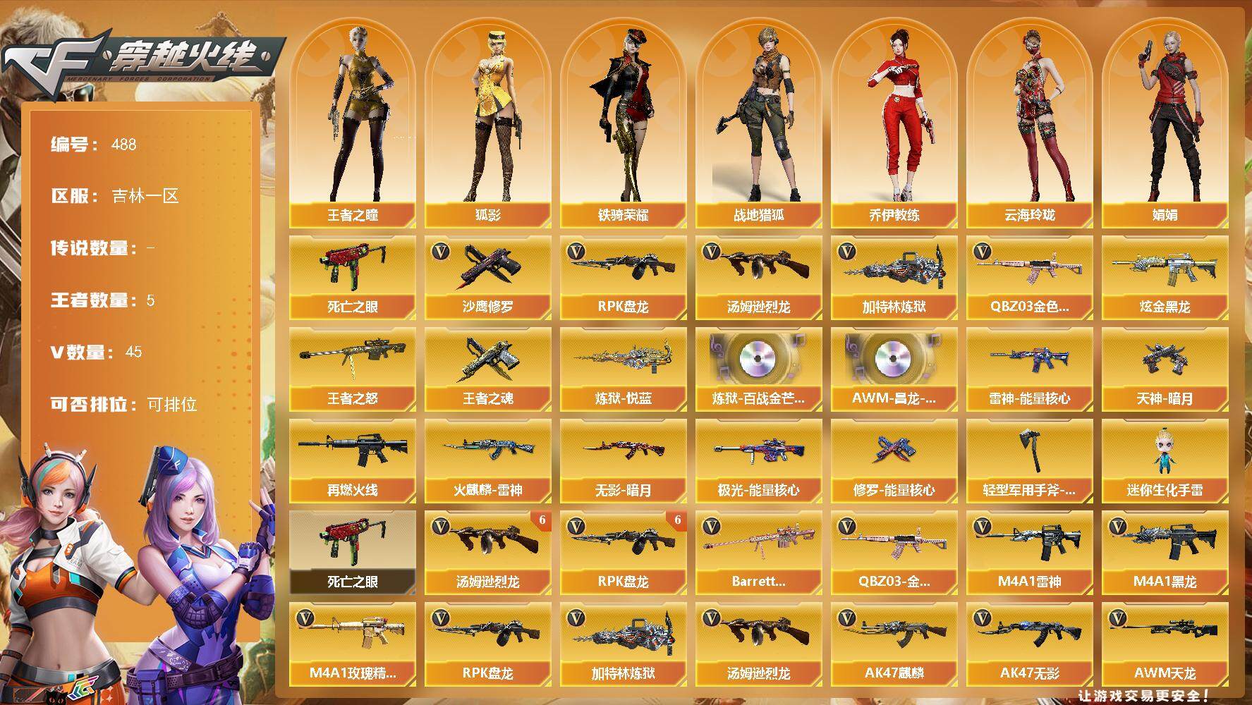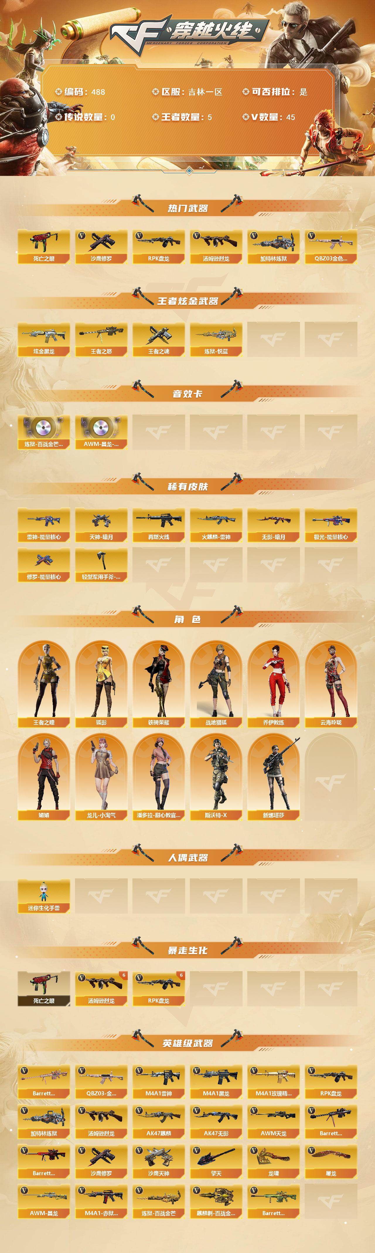 [14699429]吉林一区-45V-5王者-1炫金 【热门武器】:QBZ03-金色蔷薇,死亡之眼,汤姆逊-烈龙*6,RPK-盘龙*6,加特林-炼狱,沙鹰-修罗*6 【王者炫金武器】:王者之怒,炼狱-悦蓝,王者之魂,炫金黑龙 【音效卡】:炼狱-百战金芒-庆典舞曲音效卡,AWM-昌龙-怀旧音效卡 【皮肤】:雷神-能量核心,M4A1-再燃火线,火麒麟-雷神,无影-暗月,极光-能量核心,修罗-能量核心,天神-暗月,轻型军用手斧-再燃火线 【角色】:战地猎狐,王者之瞳,狐影,乔伊教练,云海玲珑,娟娟,龙儿-小淘气,潘多拉-甜心教官,斯沃特-X,铁骑荣耀,新娜塔莎 【人偶武器】:迷你生化手雷 【暴走生化】:死亡之眼 【英雄级武器】:AK47-麒麟,M4A1-黑龙,M4A1-雷神*4,AK47-无影,M4A1-玫瑰精灵,QBZ03-金色蔷薇,AWM-天龙,Barrett-毁灭,Barrett-极光,Barrett-金色蔷薇,RPK-盘龙*6,加特林-炼狱,炼狱-百战金芒,汤姆逊-烈龙*6,沙鹰-修罗*6,沙鹰-天神,屠龙*2,龙啸,擎天*2,麒麟刺-百战金芒,M4A1-赤狱骑士,AWM-昌龙,Barrett-碧霄极光 【道具】:BS战队炫彩背包,云山科技背包,战舰背包,炫彩背包,百战金芒炫彩背包,超级背包,女皇终结者-魔龙之吻,救世主-黑桃战神,妩媚妖姬,黄金生化钩,绿色巨人,灵魂忍者*2,变异宝贝,妖姬,迷雾幽灵*2,夺命之镰,防化服*3,流光-鎏金之域,流光-再燃火线,语音特效-盛典烟火,萌萌小葵表情,防弹头盔*3,防弹衣*3,C4工具钳*3,手雷包*3 【特殊枪械】:6烈龙,6盘龙,1炼狱