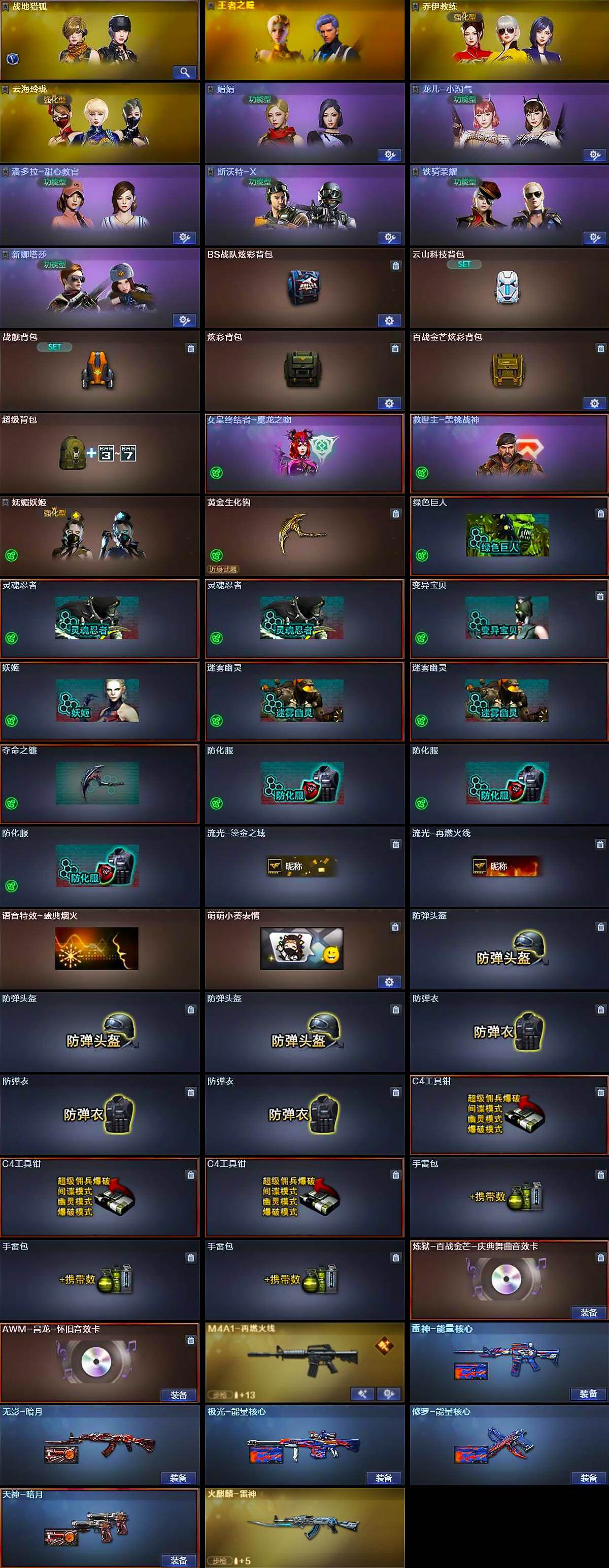 【道具】:BS战队炫彩背包,云山科技背包,战舰背包,炫彩背包,百战金芒炫彩背包,超级背包,女皇终结者-魔龙之吻,救世主-黑桃战神,妩媚妖姬,黄金生化钩,绿色巨人,灵魂忍者*2,变异宝贝,妖姬,迷雾幽灵*2,夺命之镰,防化服*3,流光-鎏金之域,流光-再燃火线,语音特效-盛典烟火,萌萌小葵表情,防弹头盔*3,防弹衣*3,C4工具钳*3,手雷包*3