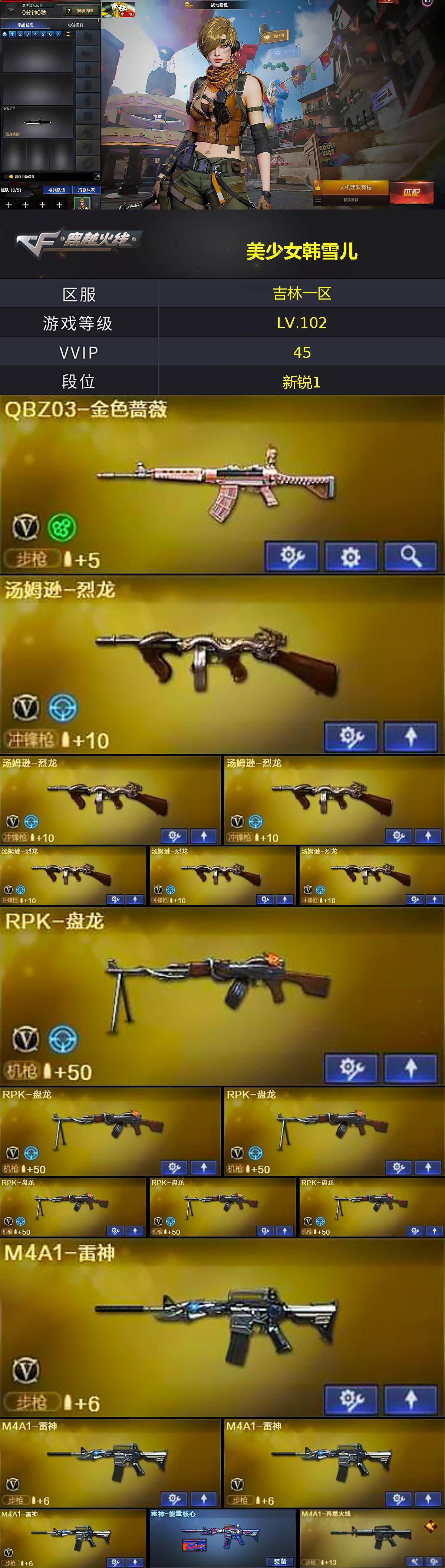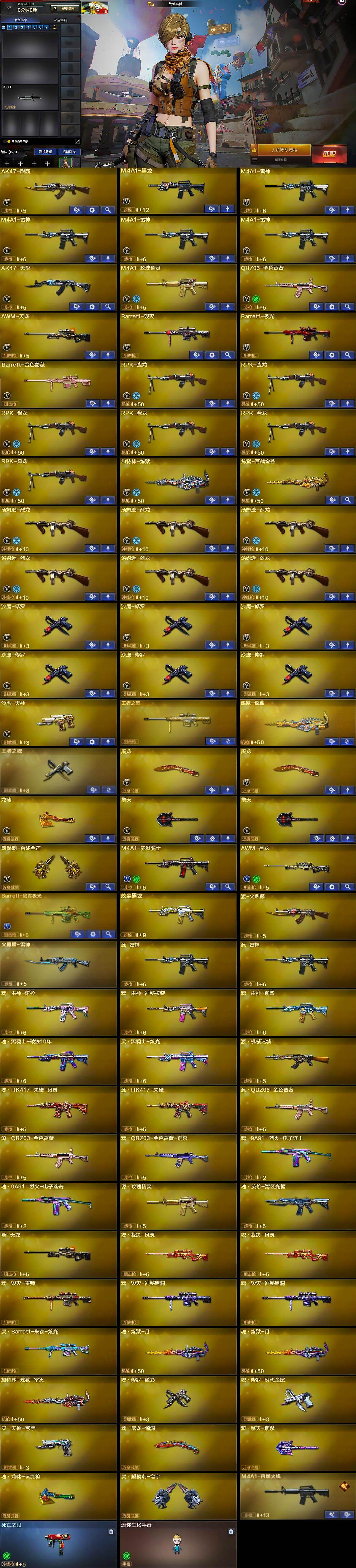 【英雄级武器】:AK47-麒麟,M4A1-黑龙,M4A1-雷神*4,AK47-无影,M4A1-玫瑰精灵,QBZ03-金色蔷薇,AWM-天龙,Barrett-毁灭,Barrett-极光,Barrett-金色蔷薇,RPK-盘龙*6,加特林-炼狱,炼狱-百战金芒,汤姆逊-烈龙*6,沙鹰-修罗*6,沙鹰-天神,屠龙*2,龙啸,擎天*2,麒麟刺-百战金芒,M4A1-赤狱骑士,AWM-昌龙,Barrett-碧霄极光