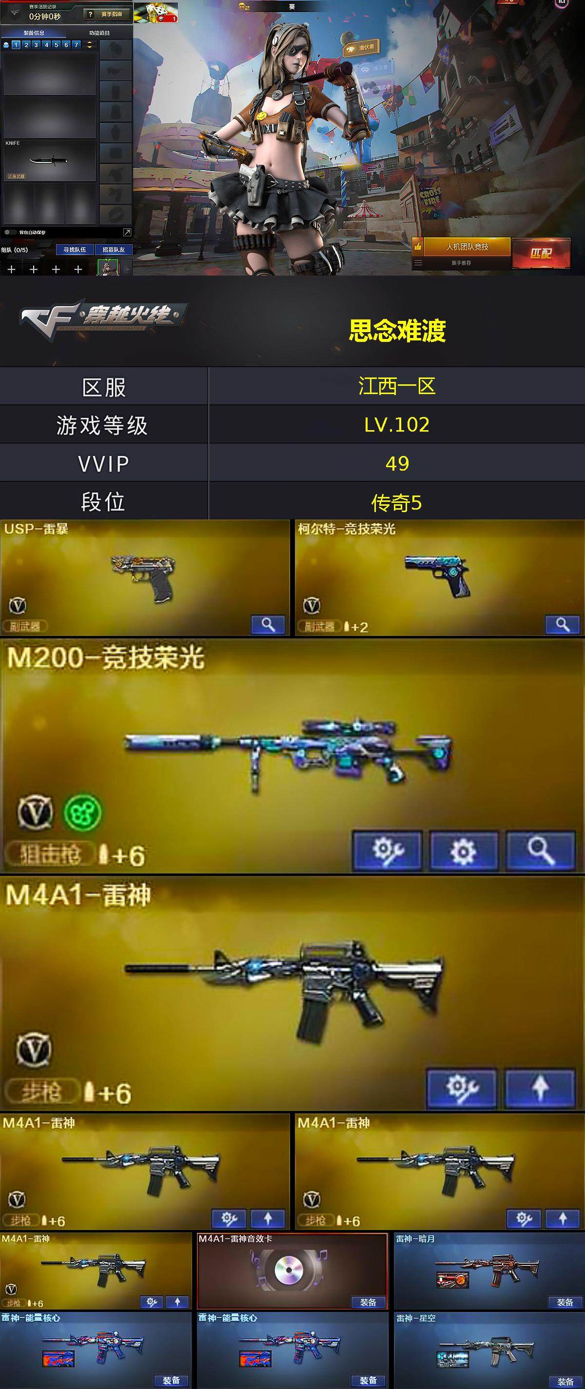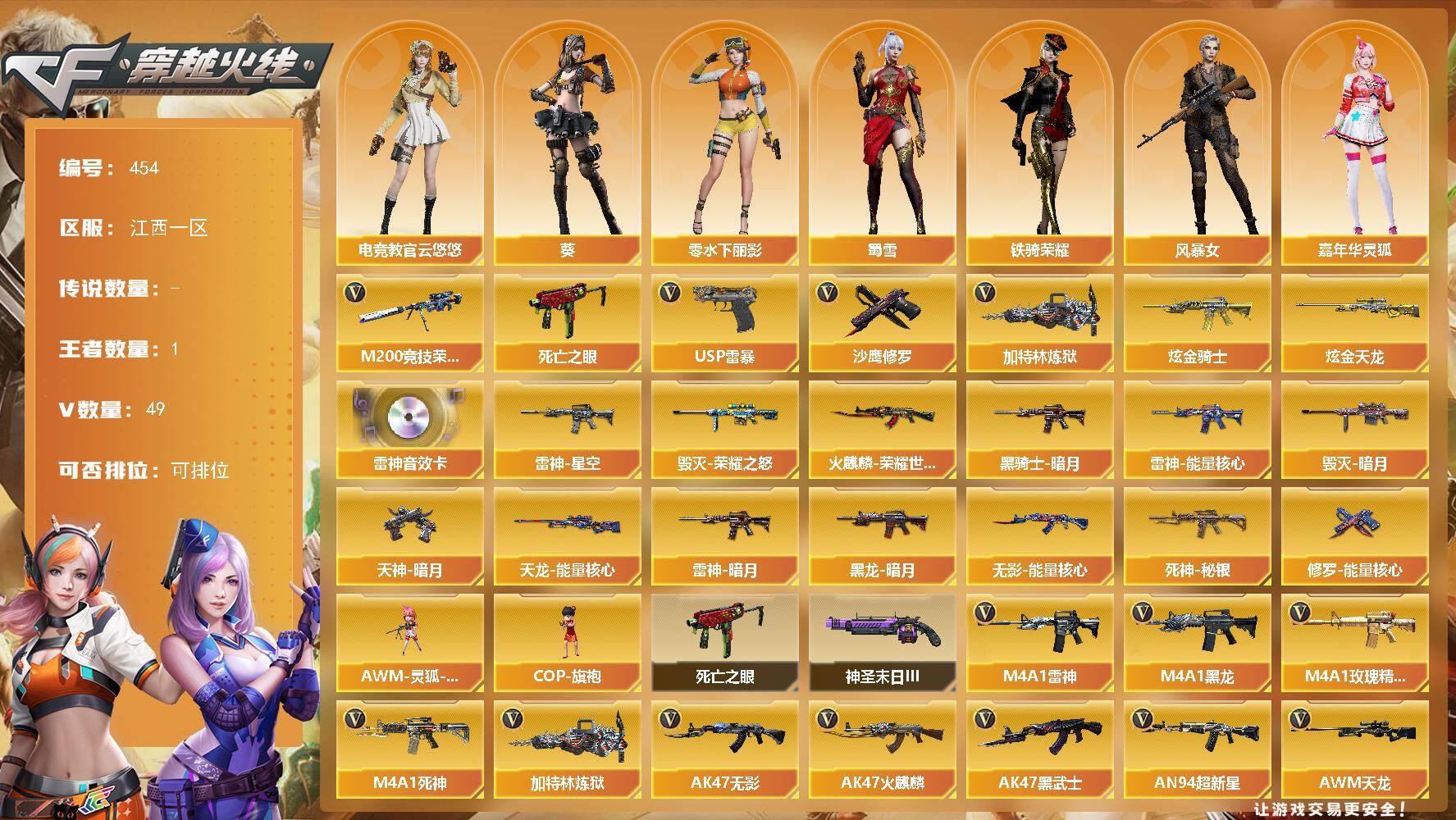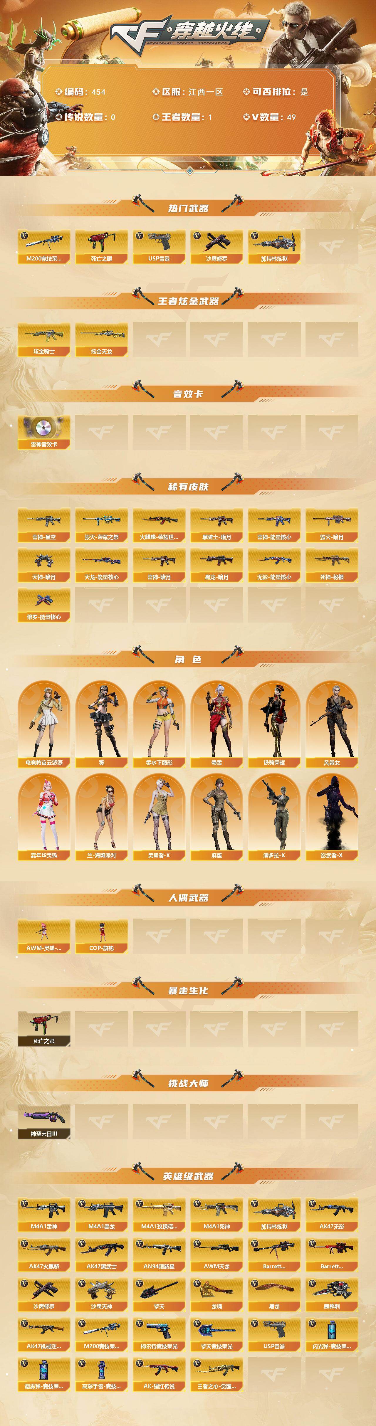 [14704262]江西一区-49V-1王者-3炫金 【热门武器】:M200-竞技荣光,死亡之眼,加特林-炼狱,USP-雷暴,沙鹰-修罗*4 【王者炫金武器】:炫金骑士,炫金天龙*2 【音效卡】:M4A1-雷神音效卡 【皮肤】:雷神-暗月,雷神-能量核心*2,雷神-星空,火麒麟-荣耀世冠AG,毁灭-暗月,毁灭-荣耀之怒,黑龙-暗月*2,黑骑士-暗月*2,无影-能量核心,死神-秘银,天龙-能量核心,修罗-能量核心,天神-暗月*2 【角色】:葵,电竞教官-云悠悠,风暴女,嘉年华灵狐,兰-海滩派对,零-水下丽影,灵狐者-X,麻雀,潘多拉-X,蜀雪,铁骑荣耀,影武者-X 【人偶武器】:AWM-灵狐-15周年嘉年华,COP-旗袍 【暴走生化】:死亡之眼 【挑战大师】:神圣爆裂者-末日III 【英雄级武器】:AK47-火麒麟*2,M4A1-黑龙,M4A1-雷神*4,AK47-无影,M4A1-死神*3,AK47-黑武士,AN94-超新星,AK47-机械迷城,M4A1-玫瑰精灵,王者之心-觉醒版,AK-47-猩红传说,AWM-天龙,Barrett-毁灭*2,Barrett-极光*3,M200-竞技荣光,加特林-炼狱,沙鹰-修罗*4,沙鹰-天神,USP-雷暴,柯尔特-竞技荣光,屠龙*3,龙啸,擎天,麒麟刺*3,擎天-竞技荣光,高爆手雷-竞技荣光*3,闪光弹-竞技荣光*2,烟雾弹-竞技荣光*2 【道具】:战舰背包,炫彩背包,夺命之镰,防化服,金色流光-枪王排位*2,星辰流光-枪王排位,巅峰赛先锋-金色流光,枪王排位28赛季金色流光,枪王排位29赛季金色流光,C4-红龙,防弹头盔,防弹衣,C4工具钳*2,手雷包*2 【特殊枪械】:1炼狱