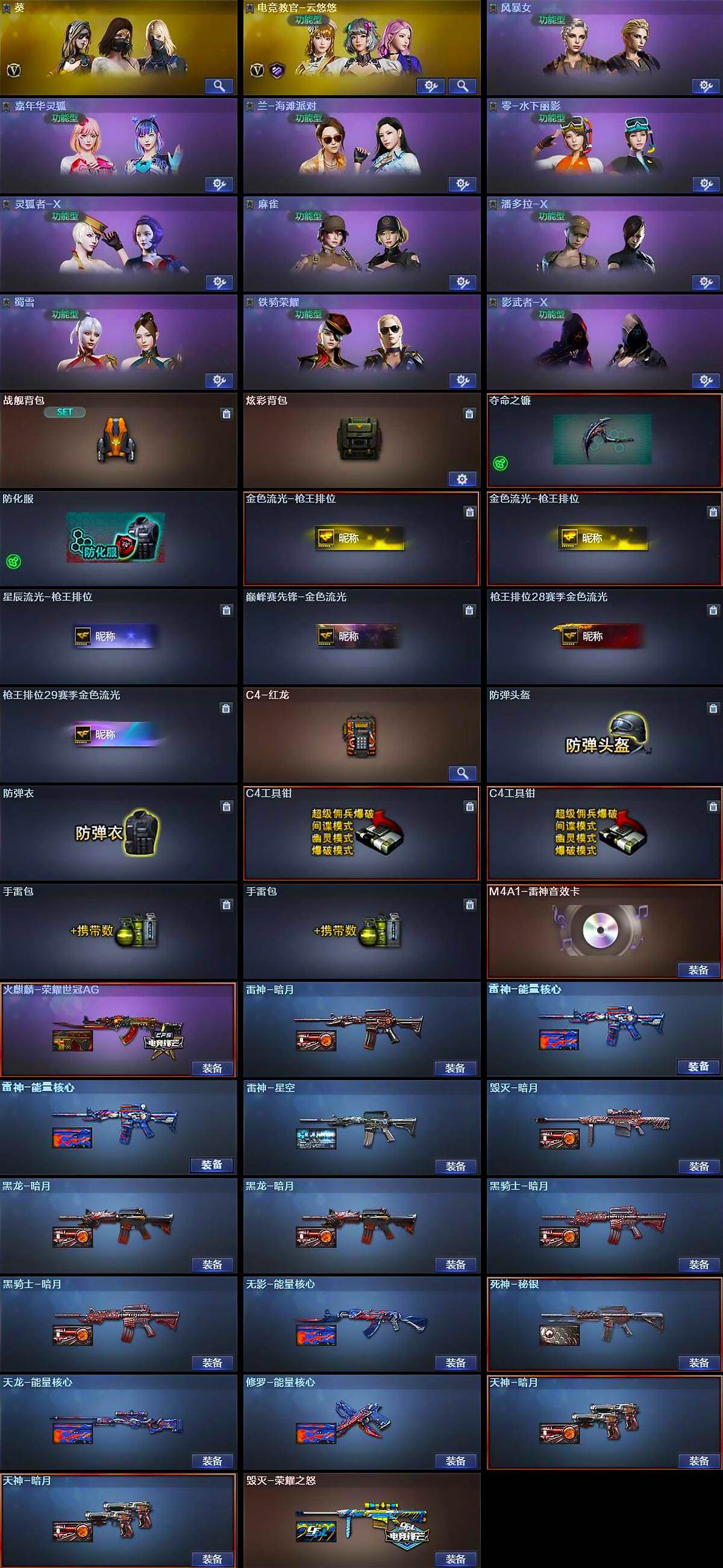 【道具】:战舰背包,炫彩背包,夺命之镰,防化服,金色流光-枪王排位*2,星辰流光-枪王排位,巅峰赛先锋-金色流光,枪王排位28赛季金色流光,枪王排位29赛季金色流光,C4-红龙,防弹头盔,防弹衣,C4工具钳*2,手雷包*2