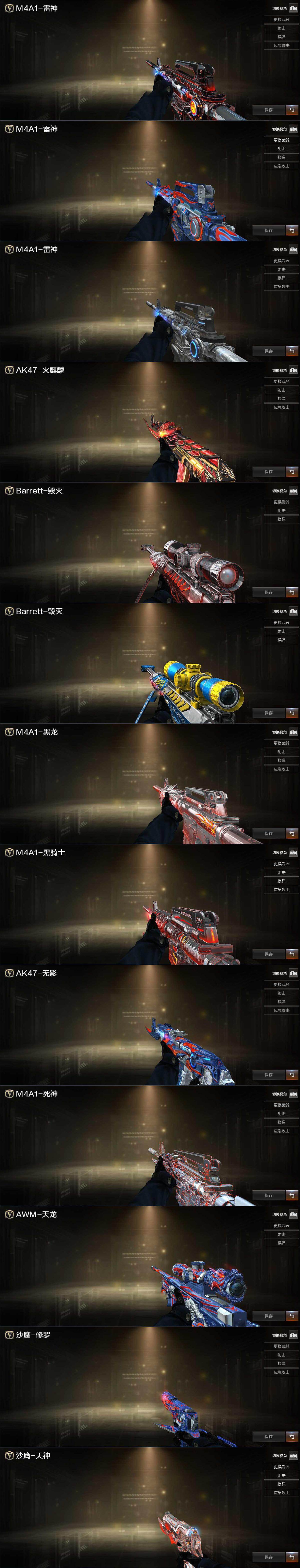 【英雄级武器】:AK47-火麒麟*2,M4A1-黑龙,M4A1-雷神*4,AK47-无影,M4A1-死神*3,AK47-黑武士,AN94-超新星,AK47-机械迷城,M4A1-玫瑰精灵,王者之心-觉醒版,AK-47-猩红传说,AWM-天龙,Barrett-毁灭*2,Barrett-极光*3,M200-竞技荣光,加特林-炼狱,沙鹰-修罗*4,沙鹰-天神,USP-雷暴,柯尔特-竞技荣光,屠龙*3,龙啸,擎天,麒麟刺*3,擎天-竞技荣光,高爆手雷-竞技荣光*3,闪光弹-竞技荣光*2,烟雾弹-竞技荣光*2