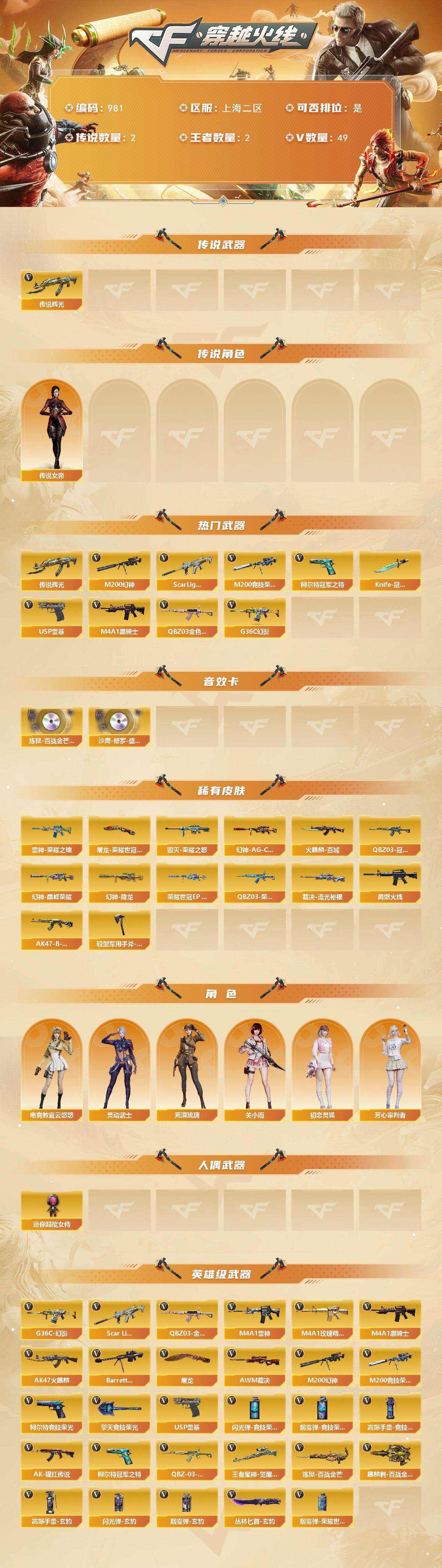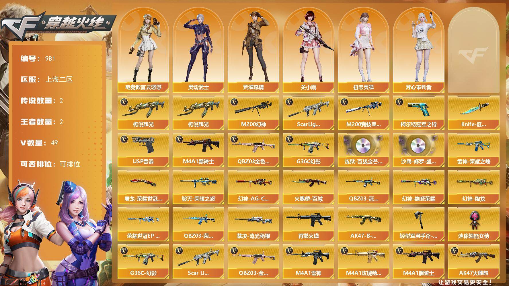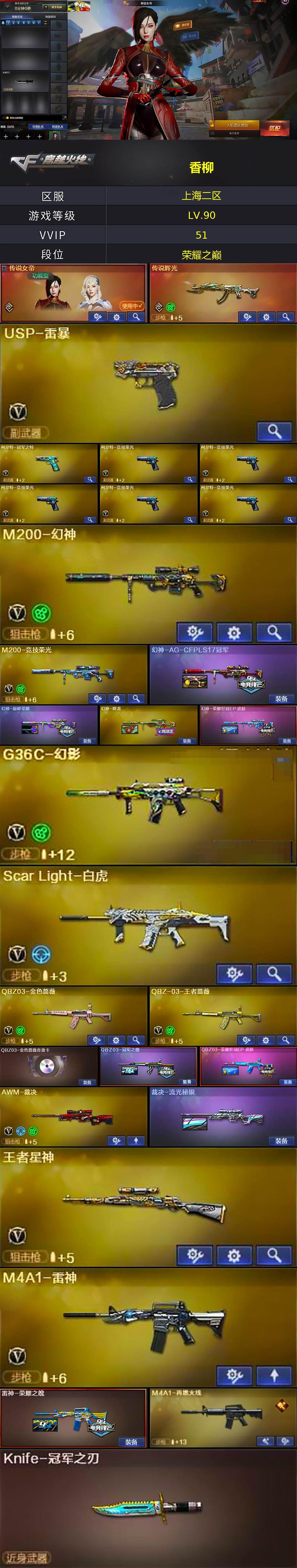 [14712973]上海二区-49V-2王者-0炫金 【传说武器】:传说辉光 【传说角色】:传说女帝 【热门武器】:传说辉光,G36C-幻影,QBZ03-金色蔷薇,Scar Light-白虎,M200-幻神,M200-竞技荣光,柯尔特-冠军之特,M4A1-黑骑士,USP-雷暴,Knife-冠军之刃 【音效卡】:炼狱-百战金芒-庆典舞曲音效卡,沙鹰-修罗-盛典舞曲音效卡 【皮肤】:幻神-AG-CFPLS17冠军,幻