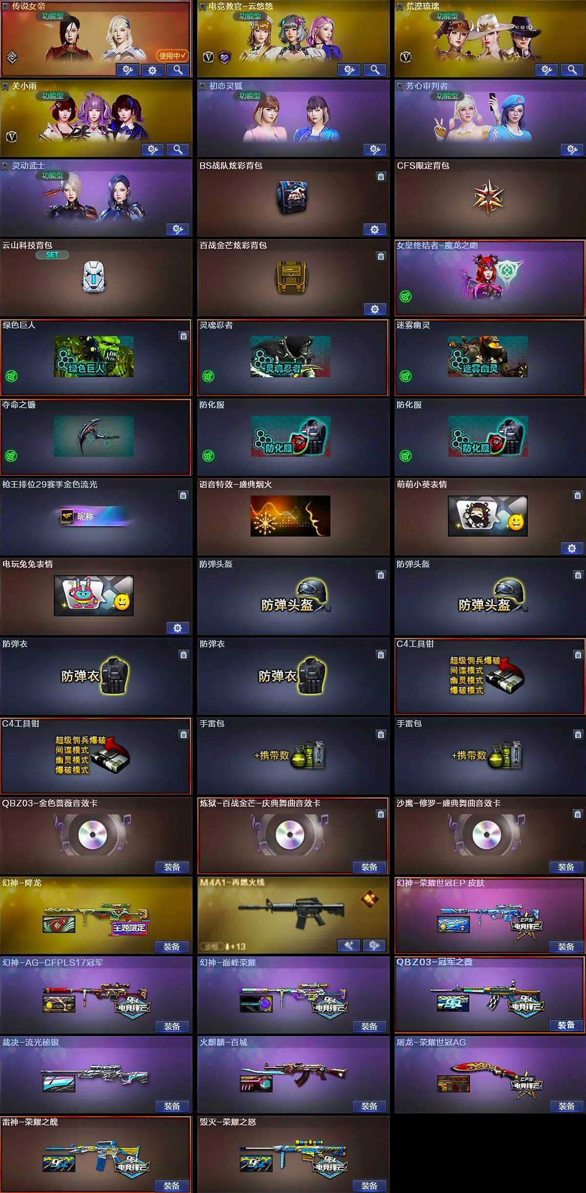 - [15244045]云南一区-83V-19王者-9炫金 【传说武器】:传说光耀 【热门武器】:传说光耀,王者幻神,QBZ03-金色蔷薇,死亡之眼,Kar98K-星神,M4A1-黑骑士,汤姆逊-烈龙*6,沙鹰-修罗*5 【王者炫金武器】:王者之城,王者之势,王者之武,王者之心*2,王者幻神,王者之灵*3,王者之刺,炫金骑士*3,炫金武士,炫金毁灭*2,炫金天龙,炫金天神,炫金修罗 【音效卡】:Barrett-毁灭音效卡 【皮肤】:火麒麟-百城,毁灭耀金皮肤,毁灭-黑大圣皮肤,黑龙-暗月,黑骑士-暗月,无影-霓裳皮肤,AWM-天龙-传奇70KG,AWM-天龙-传奇白鲨,极光-能量核心,修罗-能量核心,修罗-星空*2 【角色】:樱,魅影,凌霄,王者-零,王者春,奇洋探员,暗夜-X,风暴女,灵狐者-七夕宝贝,龙儿,曼陀罗-X,萌儿,娜塔莉娅,潘多拉-X,青霞仙子,赛斯-X,铁骑荣耀,兔囡囡,维纳斯 【人偶武器】:M4A1-雷神-精英刀锋,COP-旗袍,迷你深渊冰龙 【暴走生化】:死亡之眼 【挑战大师】:VEPR-12-金魔,激光毁灭者III,神圣爆裂者-末日III*2 【英雄级武器】:AK47-火麒麟,M4A1-黑骑士,AK47-无影,AK47-黑武士,AK12-天启*2,M4A1-武圣,M4A1-夜魔*2,超新星-热带奇洋,M4A1-玫瑰精灵*2,QBZ03-金色蔷薇,M4A1-猎神*3,王者之心-觉醒版,王者之魄-觉醒版,超新星-悦享-觉醒版,黑骑士-海王,黑武士-CF网剧冠军,AWM-天龙*2,Barrett-毁灭*2,Barrett-极光*3,AWM-裁决,Kar98K-星神,Barrett-金色蔷薇,汤姆逊-烈龙*6,AA-12-雷霆*2,沙鹰-修罗*5,破空枪刃-夜魔*2,天神-CF网剧冠军,屠龙*4,龙啸,马来剑-夜魔,擎天*3,麒麟刺,龙啸-热带奇洋,擎天-CF网剧冠军,王者之啸-觉醒版*4,高爆手雷-夜魔*7,手雷-热带奇洋,闪光弹-夜魔*7,烟雾弹-夜魔*7 【道具】:KZ战队炫彩背包,冰冰企鹅背包-猛男专用,奇洋探员-海龟背包,炫彩背包,热带奇洋炫彩背包,超级背包,黄金生化钩,夺命之镰,防化服,金色流光-枪王排位,星辰流光-枪王排位,巅峰赛先锋-金色流光,枪王排位28赛季金色流光,枪王排位29赛季金色流光,热带奇洋表情,防弹头盔*3,防弹衣*4,C4工具钳*4,手雷包*