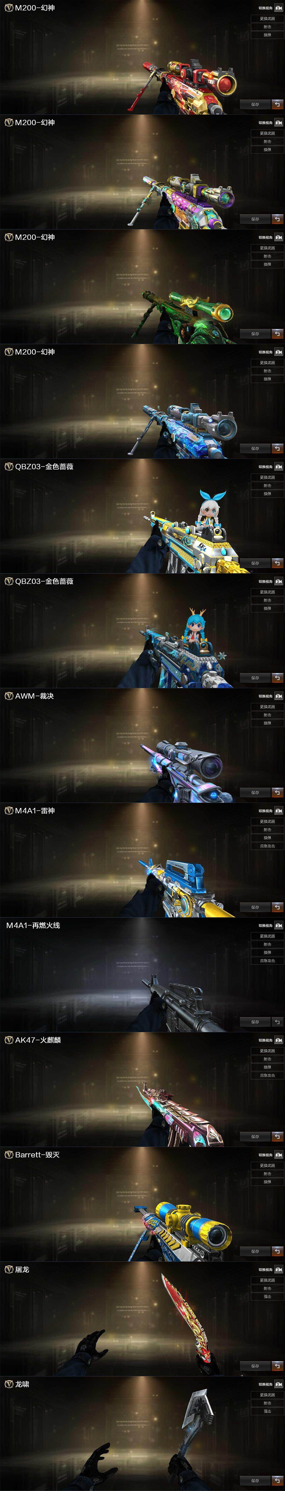 【热门武器】:传说辉光,G36C-幻影,QBZ03-金色蔷薇,Scar Light-白虎,M200-幻神,M200-竞技荣光,柯尔特-冠军之特,M4A1-黑骑士,USP-雷暴,Knife-冠军之刃