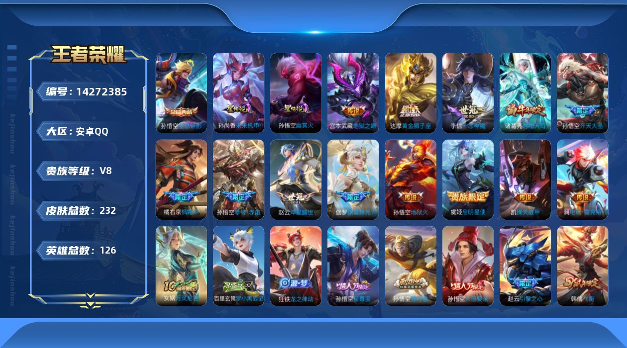 [14272385]【店主推荐捡漏号!可直接换绑】安卓Q-V8-至尊星耀II段位-126英雄-232皮肤-1典藏皮肤-14传说-61史诗-2星元 【英雄全皮】:孙权全皮,橘右京全皮,空空儿全皮 【荣耀典藏】:孙悟空全息碎影 【传说皮肤】:后羿神树通天,澜电玩雷克斯,伽罗炽翼辉光,孙悟空齐天大圣,橘右京枫霜尽,赵云淬星耀世,诸葛亮时雨天司,铠绛天战甲,虞姬启明星使,孙悟空零号赤焰,李信一念神魔,达摩黄金狮子座,宫本武藏地狱之眼,孙悟空地狱火 【限定皮肤】:大乔绒语心约,狄仁杰阴阳师,赵云皇家上将,赵云引擎之心,赵云龙胆,孙尚香蔷薇恋人,钟无艳超时空战士,元歌无心,甄姬落雪兰心,狄仁杰魔术师,狄仁杰万华元夜,达摩沙漠行僧,项羽海滩派对,老夫子醍醐杖,程咬金演武夺筹,韩信飞衡,兰陵王金庭之子,橘右京枫霜尽,孙悟空美猴王,孙悟空至尊宝,孙悟空大圣娶亲,孙悟空零号赤焰,孙悟空孙行者,孙悟空齐天大圣,牛魔御旌,李元芳云中旅人,虞姬启明星使,钟馗驱傩正仪,雅典娜单词大作战,蔡文姬繁星吟游,鬼谷子原初探秘者,鬼谷子五谷丰年,诸葛亮时雨天司,苏烈千军破阵,弈星混沌棋,沈梦溪大漠名商,明世隐疑决卦,裴擒虎李小龙,裴擒虎擒涛扼浪,米莱狄御霄,云中君纤云弄巧,伽罗炽翼辉光,盾山御銮,嫦娥拒霜思,西施玲珑珍味,蒙犽狂想玩偶喵,鲁班大师探海日志,桑启海盐诗旅,艾琳女武神,张良古海寻踪,蒙犽百解令,高渐离燃音魔法,妲己灵卜魔法,鬼谷子天穹祈灯,沈梦溪龙舞盛年,刘备异域游侠 【年限皮肤】:孙悟空美猴王,诸葛亮时雨天司,韩信飞衡,赵云龙胆,伽罗炽翼辉光 【赛季限定】:狄仁杰万华元夜,达摩沙漠行僧,老夫子醍醐杖,程咬金演武夺筹,兰陵王金庭之子,张良古海寻踪,牛魔御旌,李元芳云中旅人,钟馗驱傩正仪,鬼谷子原初探秘者,苏烈千军破阵,弈星混沌棋,沈梦溪大漠名商,明世隐疑决卦,裴擒虎擒涛扼浪,米莱狄御霄,盾山御銮,鲁班大师探海日志,桑启海盐诗旅,鬼谷子天穹祈灯 【战令限定】:钟无艳超时空战士,甄姬落雪兰心,雅典娜单词大作战,西施玲珑珍味,蒙犽狂想玩偶喵,高渐离燃音魔法,妲己灵卜魔法 【史诗皮肤】:赵云嘻哈天王,赵云皇家上将,赵云未来纪元,甄姬冰雪圆舞曲,狄仁杰魔术师,宫本武藏鬼剑武藏,孙尚香蔷薇恋人,孙尚香水果甜心,嬴政暗夜贵公子,嬴政摇滚巨星,妲己魅力维加斯,墨子金属风暴,吕布圣诞狂欢,刘禅绅士熊喵,曹操幽灵船长,李白千年之