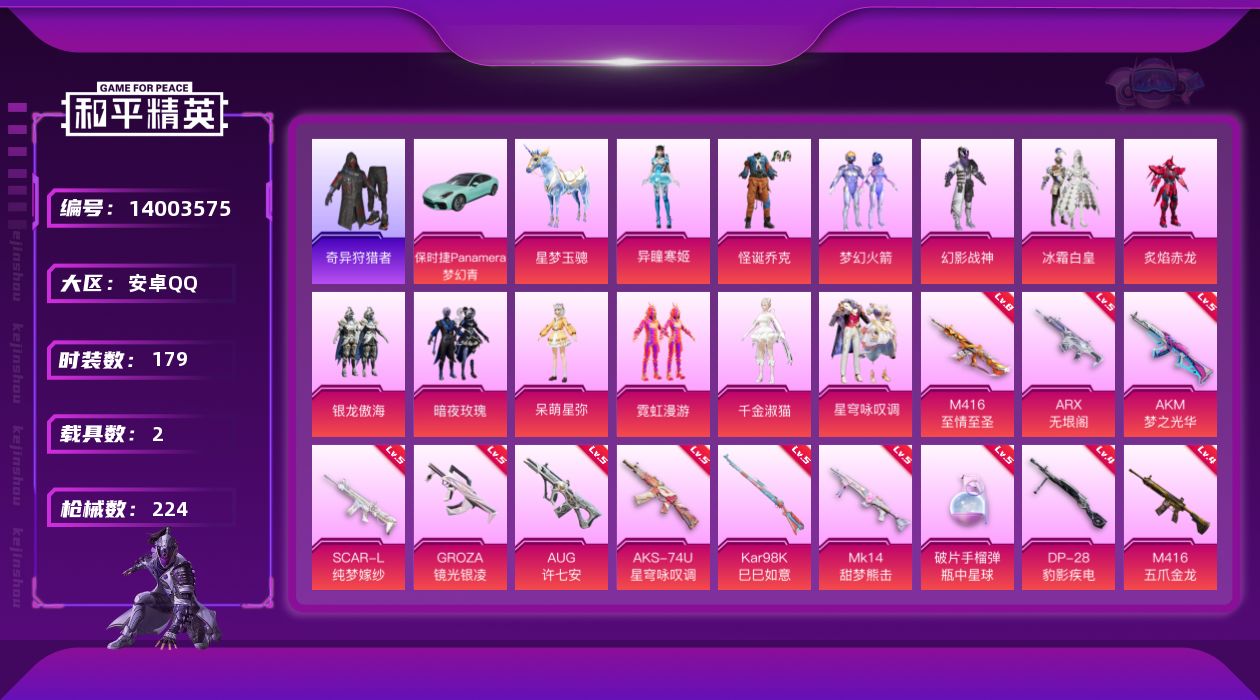 [14003575]安卓 手Q-13粉装-15特效枪-2载具-7粉色飞行器-84514热力值-13王牌印记-179套装-224枪皮 【热门品类】:粉装-怪诞乔克,粉装-梦幻火箭,套装-浪漫天命,套装-奇异狩猎者,角色-军刀雅典娜,套装-潮萌小黄鸭,套装-暗影哥特,套装-浪漫波比,套装-粉红小猪,套装-红红火火,小丑红鼻头,套装-红熊茄茄 【粉色载具】:保时捷Panamera(梦幻青),星梦玉骢 【粉色套装】:粉装-幻影战神,粉装-怪诞乔克,粉装-梦幻火箭,粉装-冰霜白皇,粉装-炙焰赤龙,粉装-银龙傲海,粉装-暗夜玫瑰,角色-呆萌星弥,粉装-霓虹漫游,角色-千金淑猫,粉装-星穹咏叹调,角色-异瞳寒姬 【粉色枪皮等级】:AKM-炫紫旋律(一级),AKM-梦之光华(五级),SCAR-L-桃夭倾城(一级),SCAR-L-纯梦嫁纱(五级),SCAR-L-金蛇镇世(三级),M416-五爪金龙(四级),M416-至情至圣(八级),GROZA-镜光银凌(五级),AUG-许七安(五级),ARX-无垠阁(五级),AKS-74U-星穹咏叹调(五级),Kar98K-巳巳如意(五级),Mk14-甜梦熊击(五级),DP-28-豹影疾电(四级),破片手榴弹-瓶中星球(五级) 【粉色枪皮】:AKM-炫紫旋律,AKM-梦之光华,SCAR-L-桃夭倾城,SCAR-L-纯梦嫁纱,SCAR-L-金蛇镇世,M416-五爪金龙,M416-至情至圣,GROZA-镜光银凌,AUG-许七安,ARX-无垠阁,AKS-74U-星穹咏叹调,Kar98K-巳巳如意,Mk14-甜梦熊击,DP-28-豹影疾电,破片手榴弹-瓶中星球 【粉色飞行器】:酣梦熊熊飞行器,齐天大圣飞行器,青春物语飞行器,冠军兔兔飞行器,英伦信使飞行器,万象金身飞行器 【粉色降落伞】:百万伏特降落伞,粉色回忆降落伞,龙虾霸霸降落伞,相思残雪降落伞,烈焰拳霸降落伞,天之羽翼降落伞,甜梦小狐降落伞,星夜魔法师降落伞,桃夭倾城降落伞,第五大道降落伞,鎏金朋克降落伞,霓虹漫游降落伞,精灵梦叶罗丽降落伞,星梦奇缘降落伞,临安公主降落伞,脆鲨七海降落伞,金蛇镇世降落伞,鬼刀降落伞,星穹咏叹调降落伞 【稀有套装】:套装-绒宝小鹅,套装-巳巳如意,套装-糖糖葫芦,套装-青团波波,套装-棉花软糖,角色-摩登魅猫,角色-许七安,角色-临安公主,角色-怀庆长公主,套装-燕燕于飞,套装-鱼渊荷华