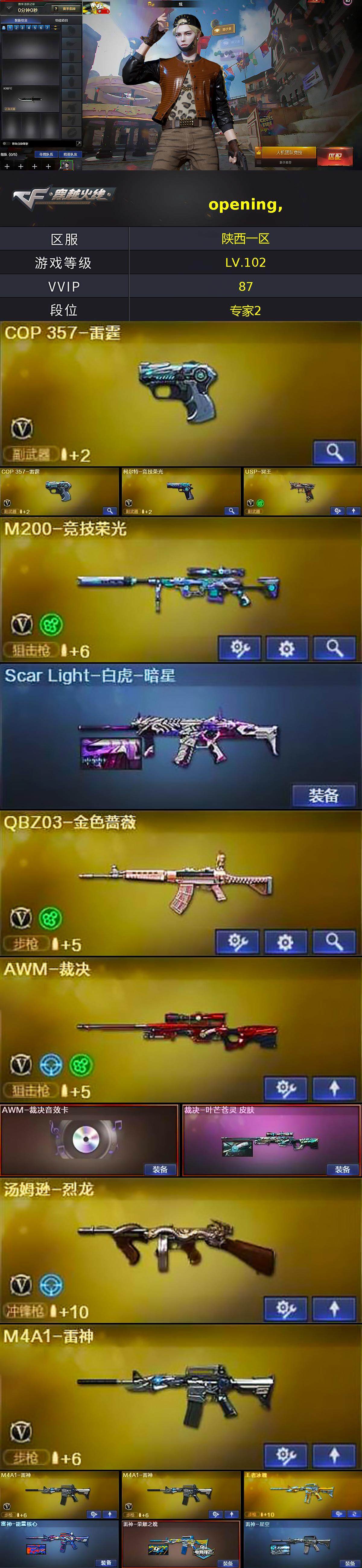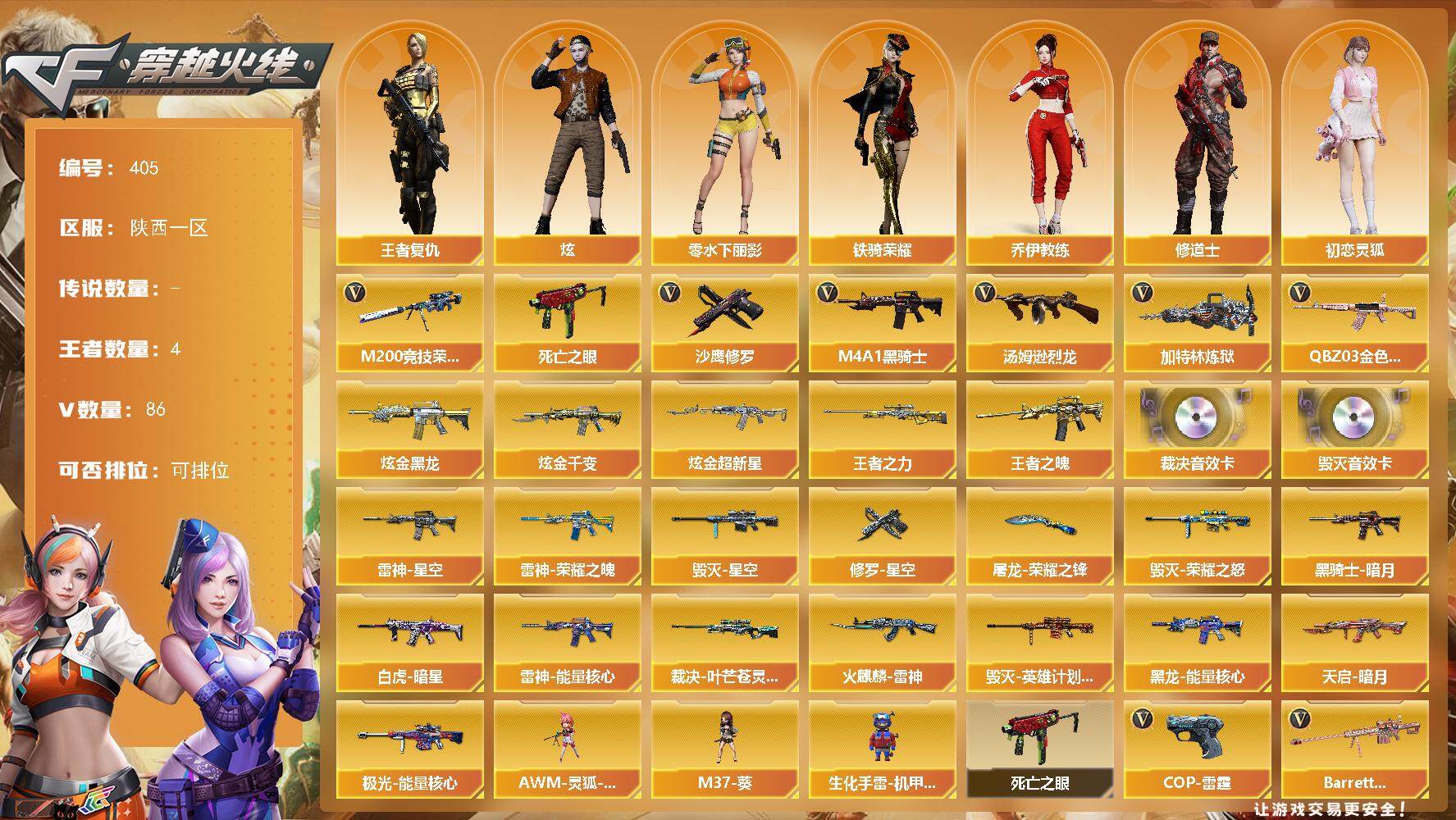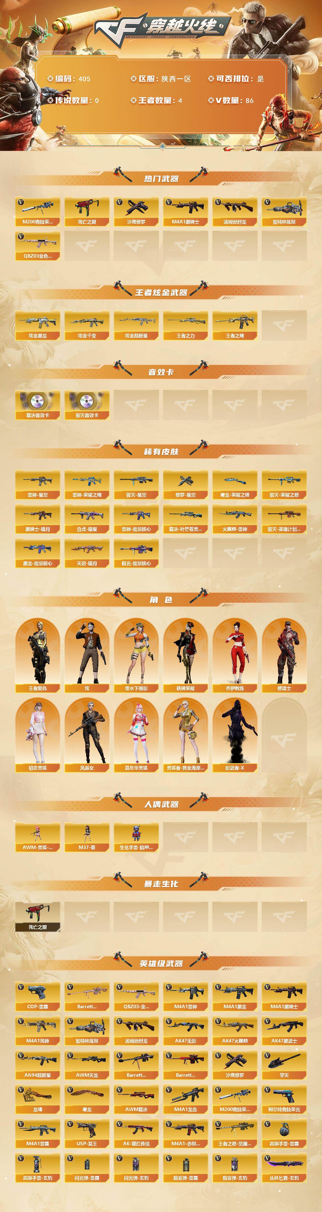 [14605245]陕西一区-86V-4王者-6炫金 【热门武器】:QBZ03-金色蔷薇,M200-竞技荣光,死亡之眼*2,M4A1-黑骑士,汤姆逊-烈龙,加特林-炼狱*2,沙鹰-修罗*6 【王者炫金武器】:王者之魄,王者之力,炫金黑龙,炫金千变,炫金超新星*4 【音效卡】:Barrett-毁灭音效卡,AWM-裁决音效卡 【皮肤】:Scar Light-白虎-暗星,裁决-叶芒苍灵 皮肤,雷神-能量核心,雷神-荣耀之魄,雷神-星空,火麒麟-雷神,毁灭-荣耀之怒,毁灭-星空,毁灭-英雄计划 皮肤,黑龙-能量核心,黑骑士-暗月,天启-暗月,极光-能量核心,修罗-星空,屠龙-荣耀之锋*2 【角色】:炫,王者复仇,乔伊教练,修道士,初恋灵狐,风暴女,嘉年华灵狐,零-水下丽影,灵狐者-黄金海岸,铁骑荣耀,影武者-X 【人偶武器】:AWM-灵狐-15周年嘉年华*2,M37-葵,生化手雷-机甲核心 【暴走生化】:死亡之眼*2 【英雄级武器】:AK47-火麒麟,M4A1-黑龙,M4A1-雷神*3,M4A1-黑骑士,AK47-无影,M4A1-死神*6,AK47-黑武士,AN94-超新星,M4A1-龙血*4,M4A1-雷霆*2,QBZ03-金色蔷薇,AK-47-猩红传说,AWM-天龙,Barrett-毁灭*5,Barrett-极光,AWM-裁决,M200-竞技荣光,Barrett-金色蔷薇,王者之怒-觉醒版,加特林-炼狱*2,汤姆逊-烈龙,沙鹰-修罗*6,COP-雷霆*2,柯尔特-竞技荣光,USP-冥王,屠龙*5,龙啸,擎天,丛林匕首-玄豹,高爆手雷-雷霆*7,高爆手雷-玄豹,闪光弹-雷霆*7,闪光弹-玄豹*2,烟雾弹-雷霆*7,烟雾弹-玄豹*3,M4A1-赤狱骑士 【道具】:喜狮迎春背包,云山科技背包,战舰背包,炫彩背包,女皇终结者-魔龙之吻,救世主-黑桃战神,绿色巨人,灵魂忍者,变异宝贝,迷雾幽灵,夺命之镰,防化服*3,金色流光-枪王排位*2,星辰流光-枪王排位,流光-再燃火线,枪王排位28赛季金色流光,防弹头盔*3,防弹衣*3,C4工具钳*3,手雷包*3 【特殊枪械】:1黑骑士,1烈龙,2炼狱