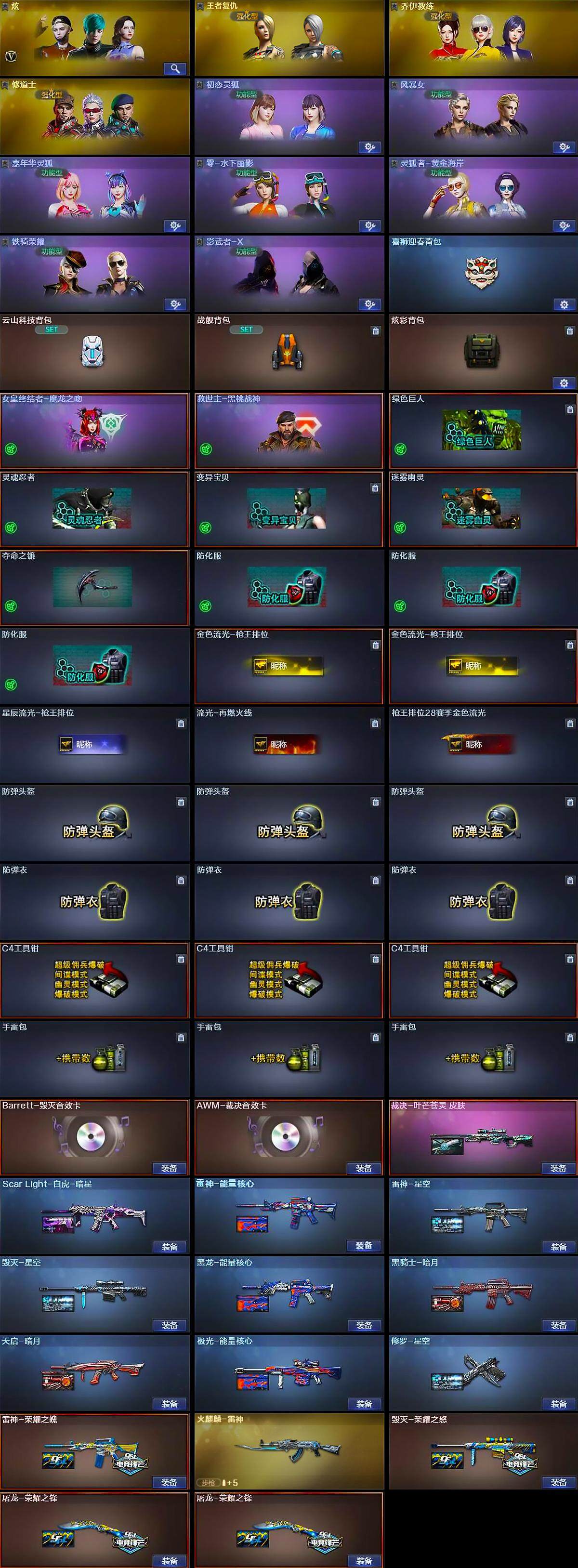 【道具】:喜狮迎春背包,云山科技背包,战舰背包,炫彩背包,女皇终结者-魔龙之吻,救世主-黑桃战神,绿色巨人,灵魂忍者,变异宝贝,迷雾幽灵,夺命之镰,防化服*3,金色流光-枪王排位*2,星辰流光-枪王排位,流光-再燃火线,枪王排位28赛季金色流光,防弹头盔*3,防弹衣*3,C4工具钳*3,手雷包*3