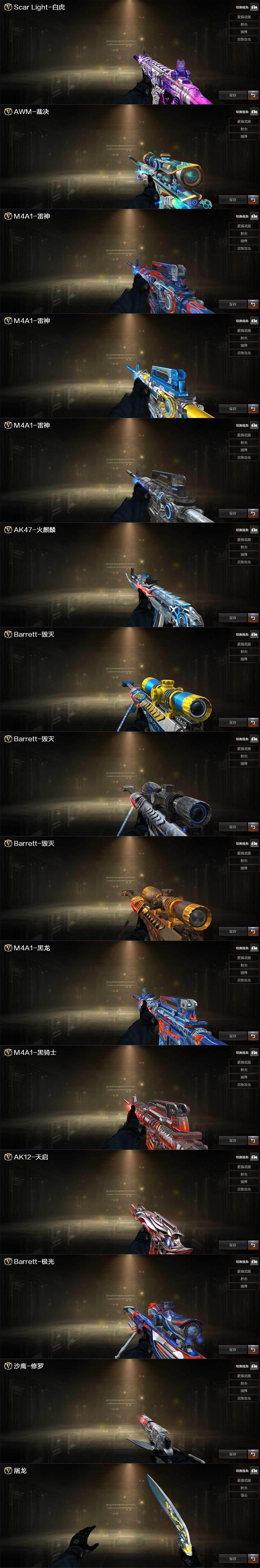 【英雄级武器】:AK47-火麒麟,M4A1-黑龙,M4A1-雷神*3,M4A1-黑骑士,AK47-无影,M4A1-死神*6,AK47-黑武士,AN94-超新星,M4A1-龙血*4,M4A1-雷霆*2,QBZ03-金色蔷薇,AK-47-猩红传说,AWM-天龙,Barrett-毁灭*5,Barrett-极光,AWM-裁决,M200-竞技荣光,Barrett-金色蔷薇,王者之怒-觉醒版,加特林-炼狱*2,汤姆逊-烈龙,沙鹰-修罗*6,COP-雷霆*2,柯尔特-竞技荣光,USP-冥王,屠龙*5,龙啸,擎天,丛林匕首-玄豹,高爆手雷-雷霆*7,高爆手雷-玄豹,闪光弹-雷霆*7,闪光弹-玄豹*2,烟雾弹-雷霆*7,烟雾弹-玄豹*3,M4A1-赤狱骑士