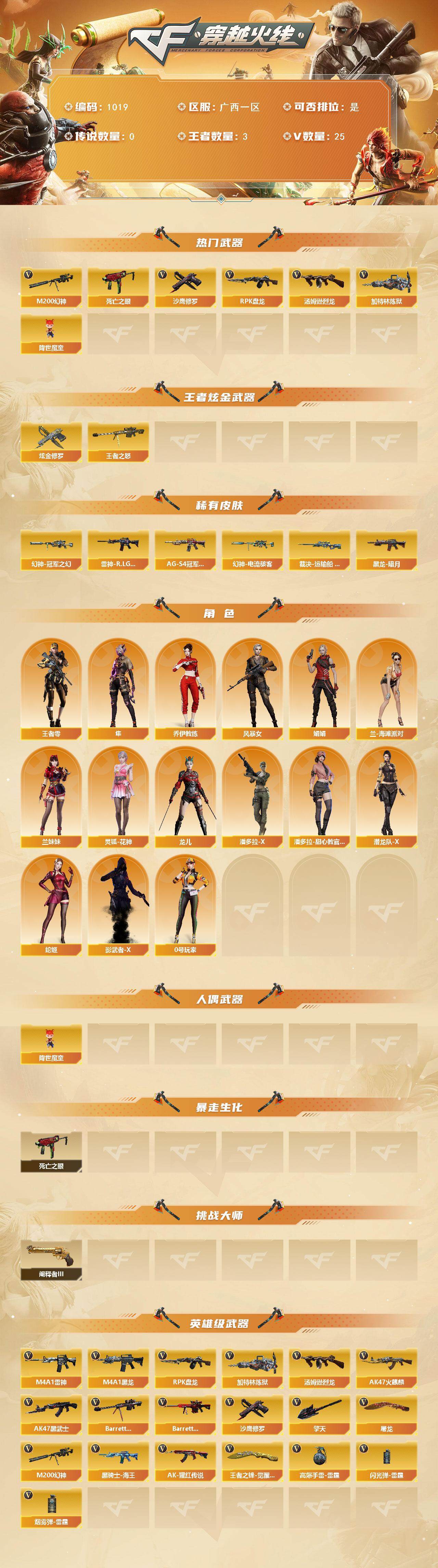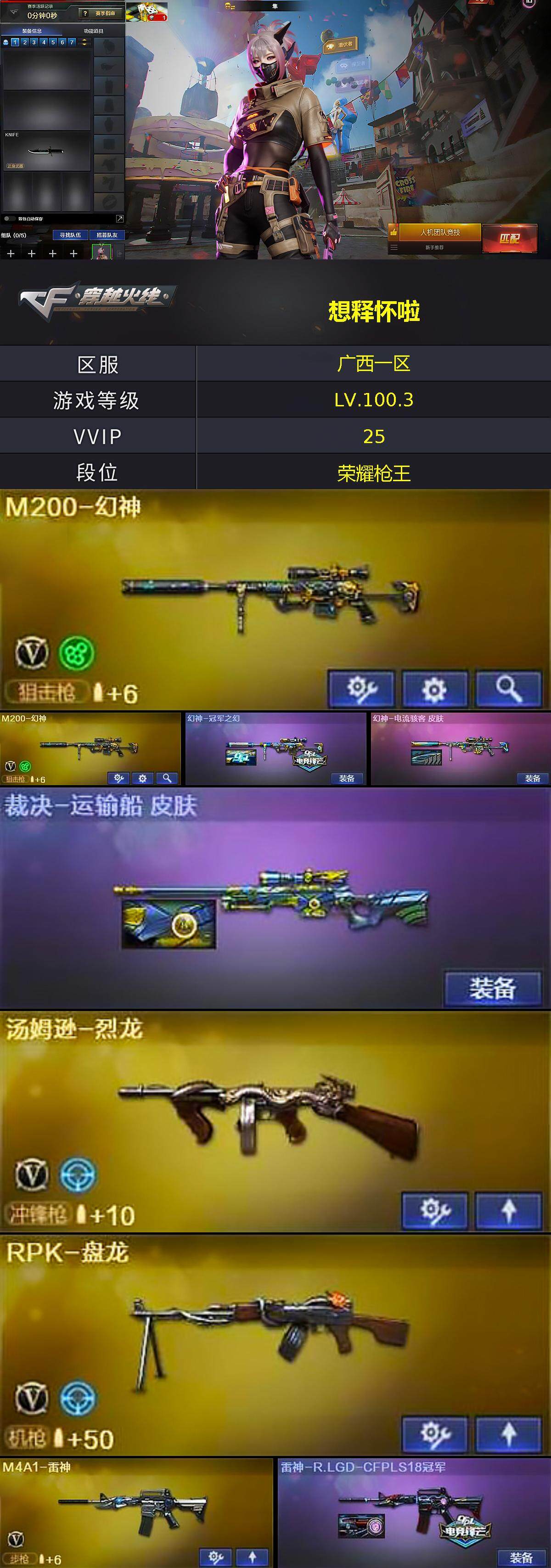 [14721481]广西一区-25V-3王者-1炫金 【热门武器】:M200-幻神*2,死亡之眼,汤姆逊-烈龙,RPK-盘龙,加特林-炼狱,降世魔童,沙鹰-修罗 【王者炫金武器】:王者之怒,炫金修罗 【皮肤】:幻神-冠军之幻,幻神-电流骇客 皮肤,裁决-运输船 皮肤,雷神-R.LGD-CFPLS18冠军,黑龙-暗月,黑骑士-AG-S4冠军典藏 【角色】:隼,王者-零,乔伊教练,风暴女,娟娟,兰-海滩派对,兰妹妹,0号玩家,灵狐-花神,龙儿,潘多拉-X,潘多拉-甜心教官,潜龙队-X,蛇姬,影武者-X 【人偶武器】:降世魔童 【暴走生化】:死亡之眼 【挑战大师】:阐释者III 【英雄级武器】:AK47-火麒麟,M4A1-黑龙,M4A1-雷神,AK47-黑武士,AK-47-猩红传说*2,黑骑士-海王,Barrett-毁灭,Barrett-极光,M200-幻神*2,RPK-盘龙,加特林-炼狱,汤姆逊-烈龙,沙鹰-修罗,屠龙,擎天,王者之锋-觉醒版,高爆手雷-雷霆,闪光弹-雷霆,烟雾弹-雷霆 【道具】:战舰背包,超级背包,绿色巨人,灵魂忍者,变异宝贝,迷雾幽灵,夺命之镰,防化服*2,星辰流光-枪王排位,巅峰赛先锋-金色流光,枪王排位28赛季金色流光,枪王排位29赛季金色流光,防弹头盔*6,防弹衣*7,C4工具钳*5,手雷包*6 【特殊枪械】:1烈龙,1盘龙,1炼狱
