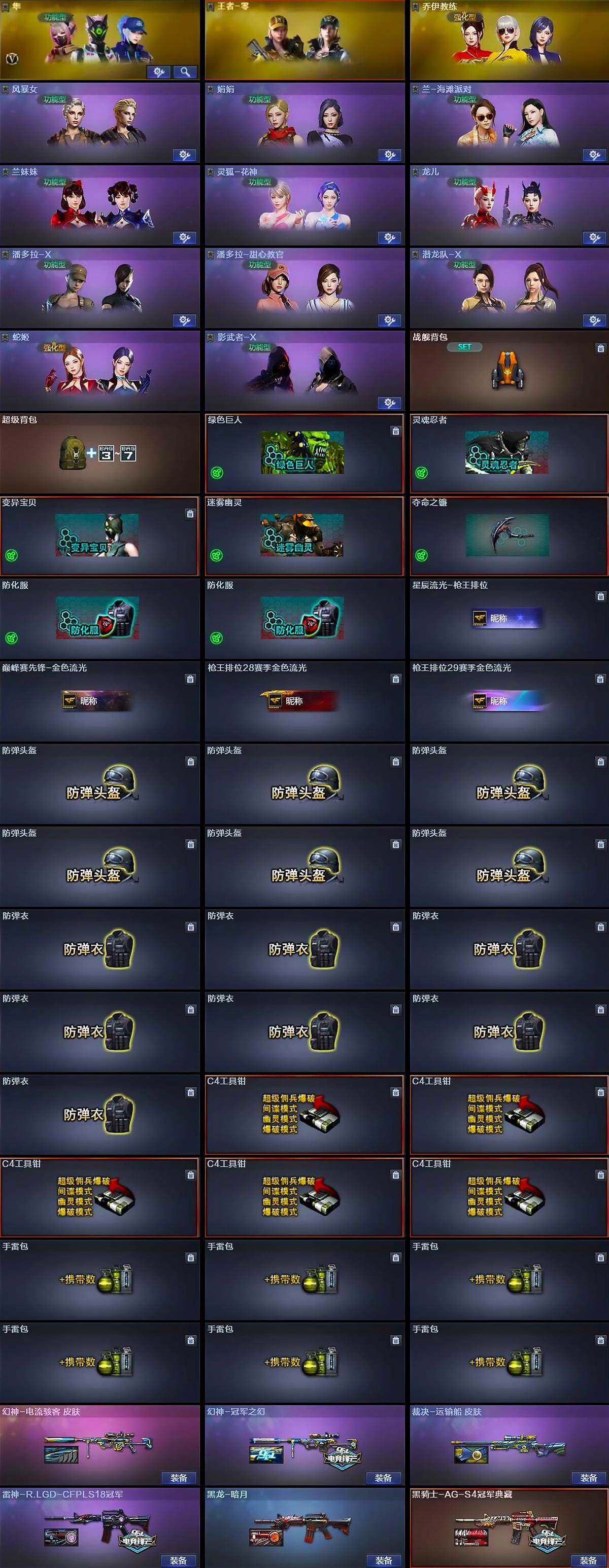 【道具】:战舰背包,超级背包,绿色巨人,灵魂忍者,变异宝贝,迷雾幽灵,夺命之镰,防化服*2,星辰流光-枪王排位,巅峰赛先锋-金色流光,枪王排位28赛季金色流光,枪王排位29赛季金色流光,防弹头盔*6,防弹衣*7,C4工具钳*5,手雷包*6