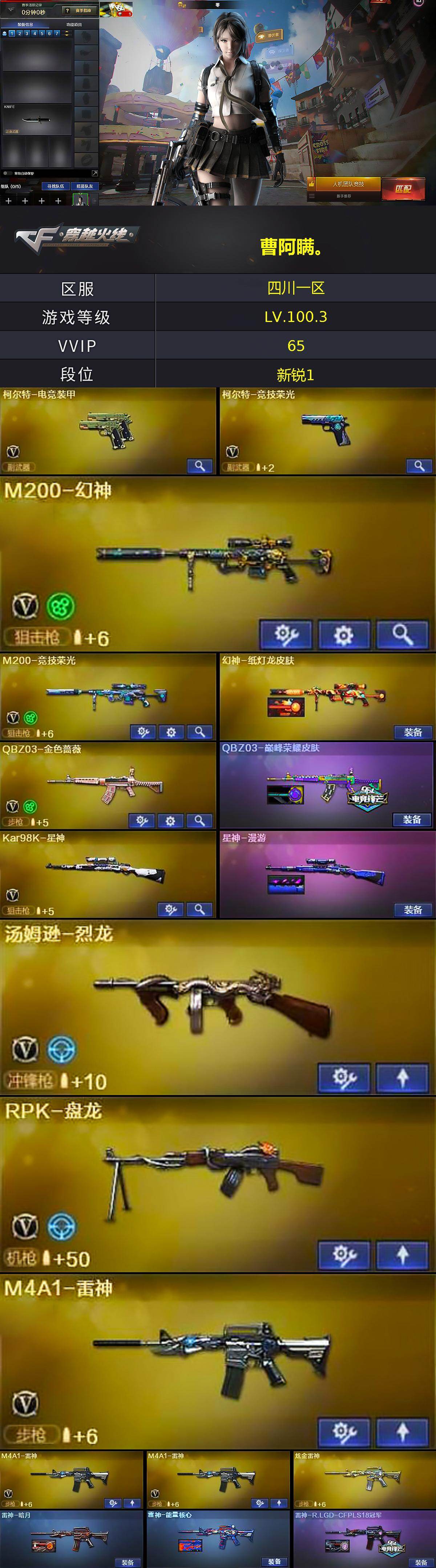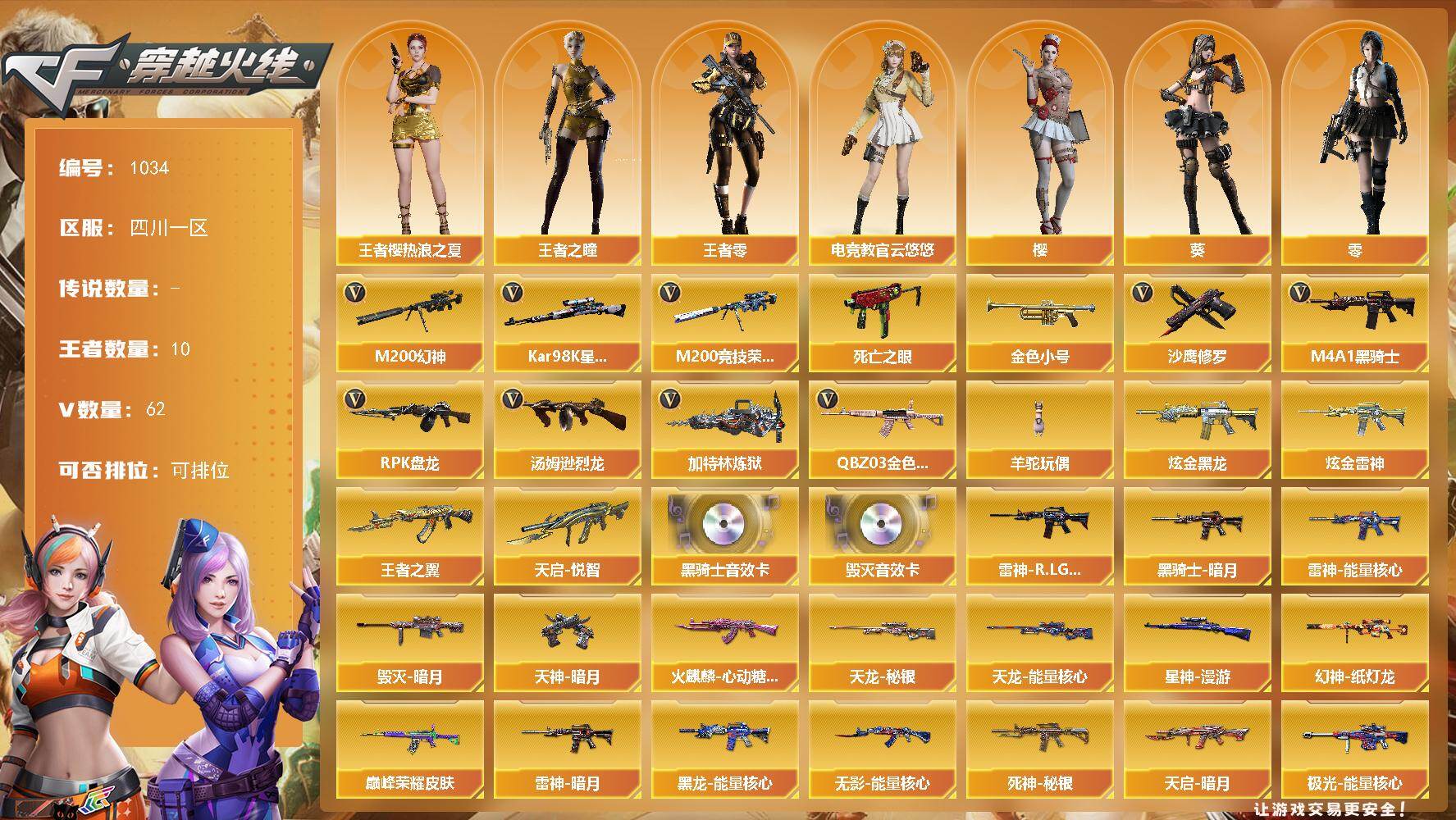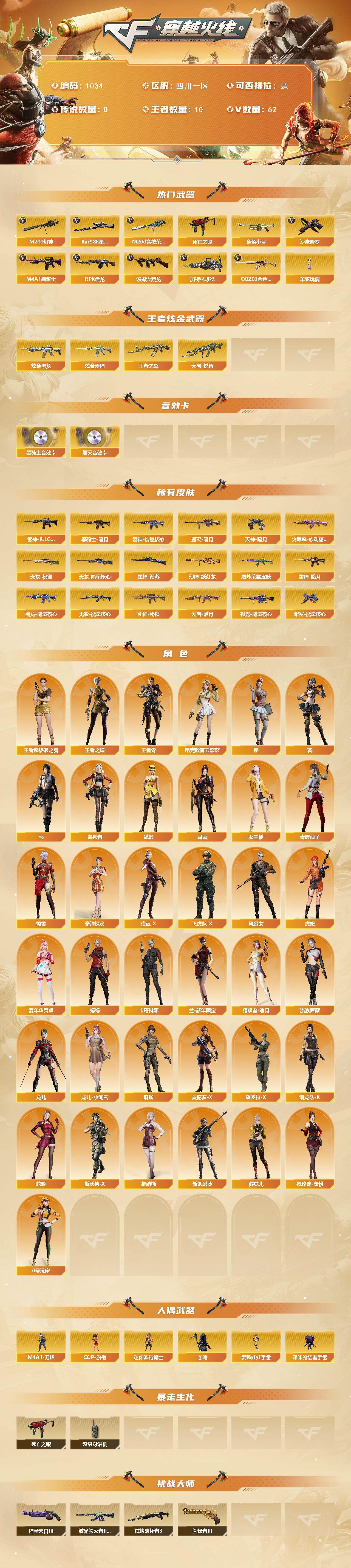[14721650]四川一区-62V-10王者-2炫金 【热门武器】:QBZ03-金色蔷薇,M200-幻神,M200-竞技荣光,死亡之眼,Kar98K-星神,金色小号,M4A1-黑骑士,汤姆逊-烈龙,RPK-盘龙,加特林-炼狱,羊驼玩偶,沙鹰-修罗*5 【王者炫金武器】:天启-悦智,王者之翼,炫金黑龙,炫金雷神 【音效卡】:M4A1-黑骑士音效卡,Barrett-毁灭音效卡 【皮肤】:幻神-纸灯龙皮肤,QBZ03