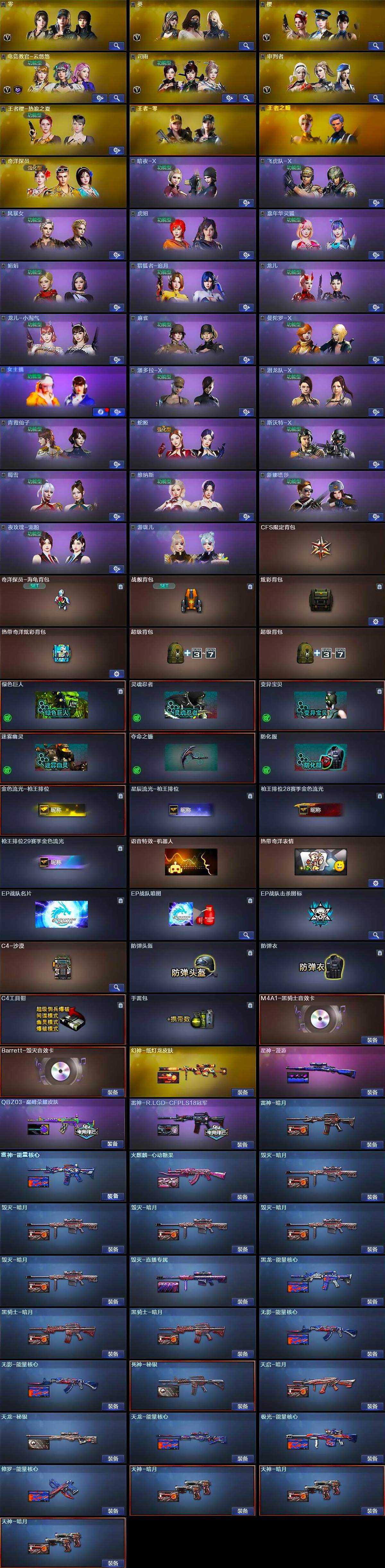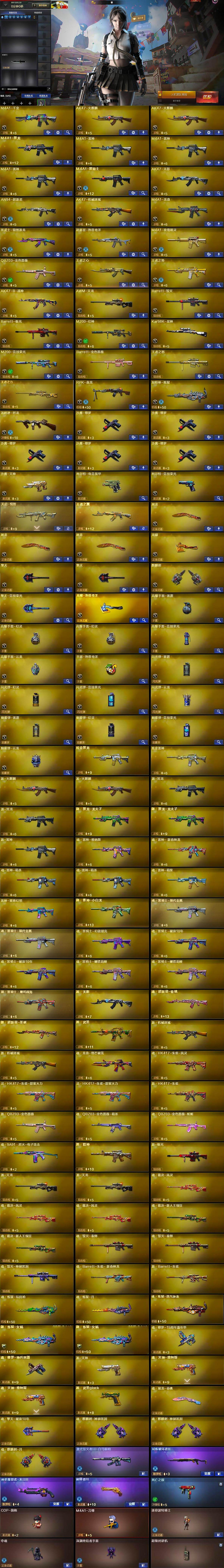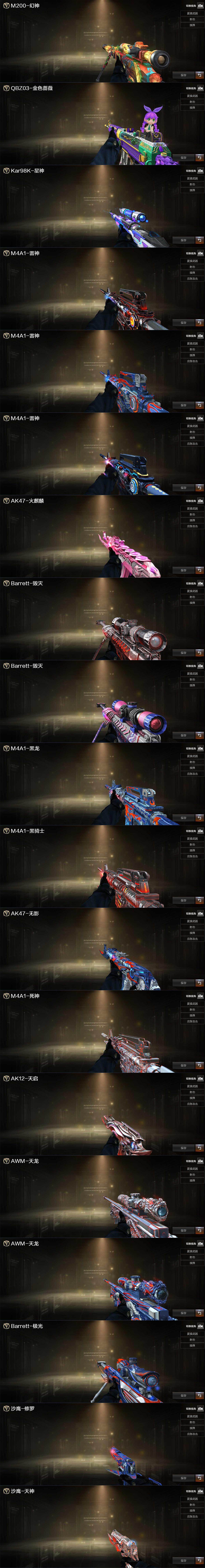 【热门武器】:QBZ03-金色蔷薇,M200-幻神,M200-竞技荣光,死亡之眼,Kar98K-星神,金色小号,M4A1-黑骑士,汤姆逊-烈龙,RPK-盘龙,加特林-炼狱,羊驼玩偶,沙鹰-修罗*5